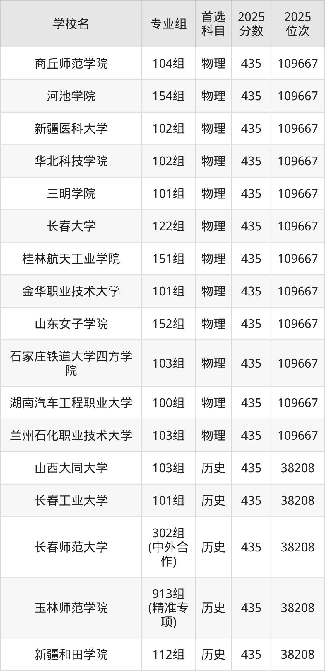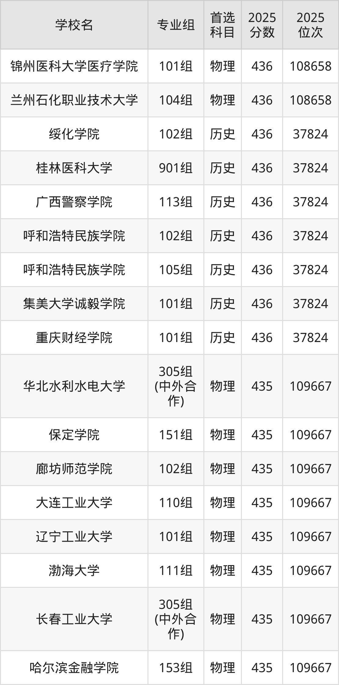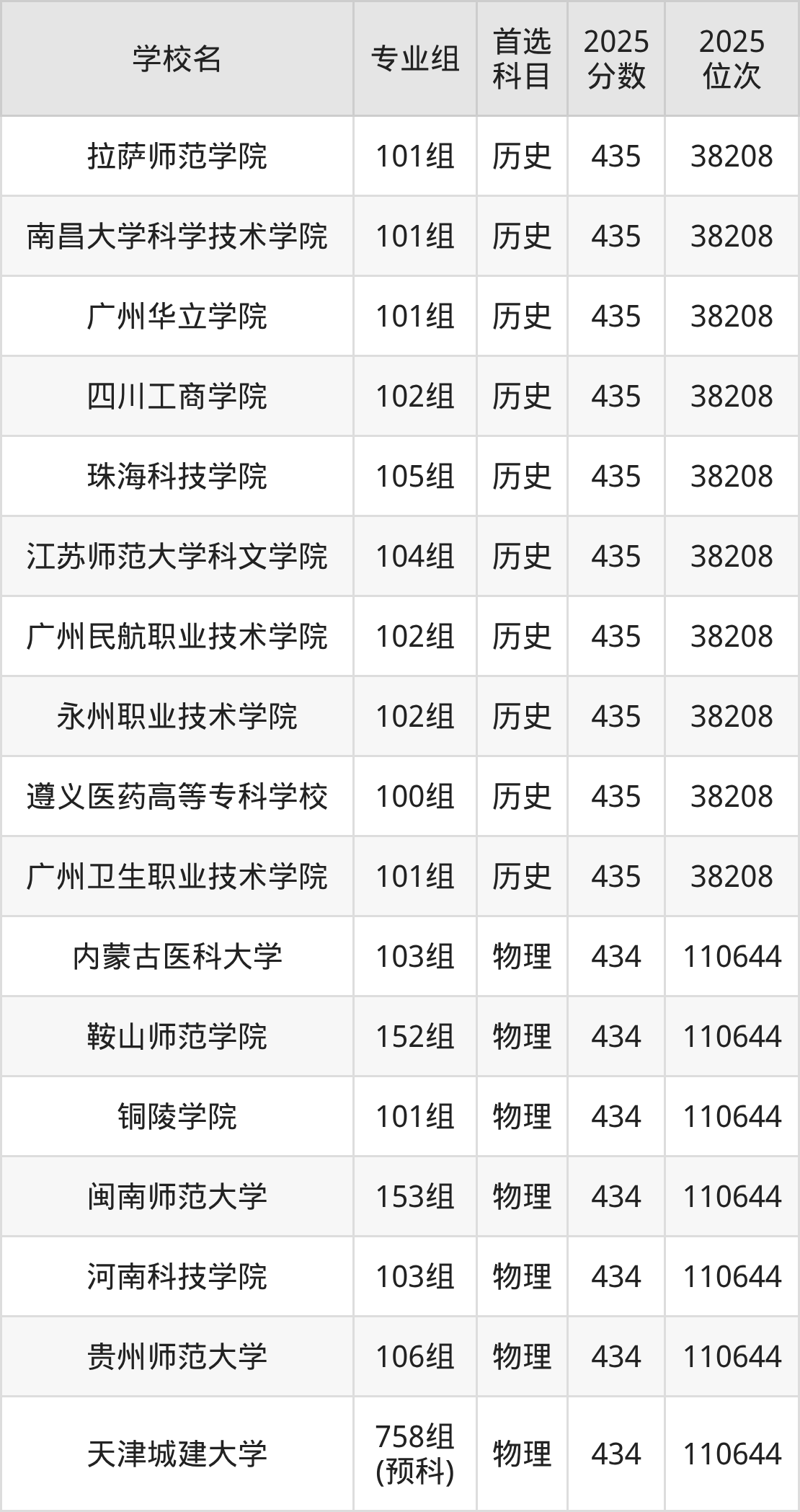 2025年在广西高考物理类录取分数线是434分的大学有内蒙古医科大学、鞍山师范学院、铜陵学院、闽南师范大学、河南科技学院、贵州师范大学、天津城建大学、潍坊学院、北方民族大学、桂林师范学院等。历史类录取分数线是434分的大学有广西民族大学、百色学院、南京审计大学金审学院。