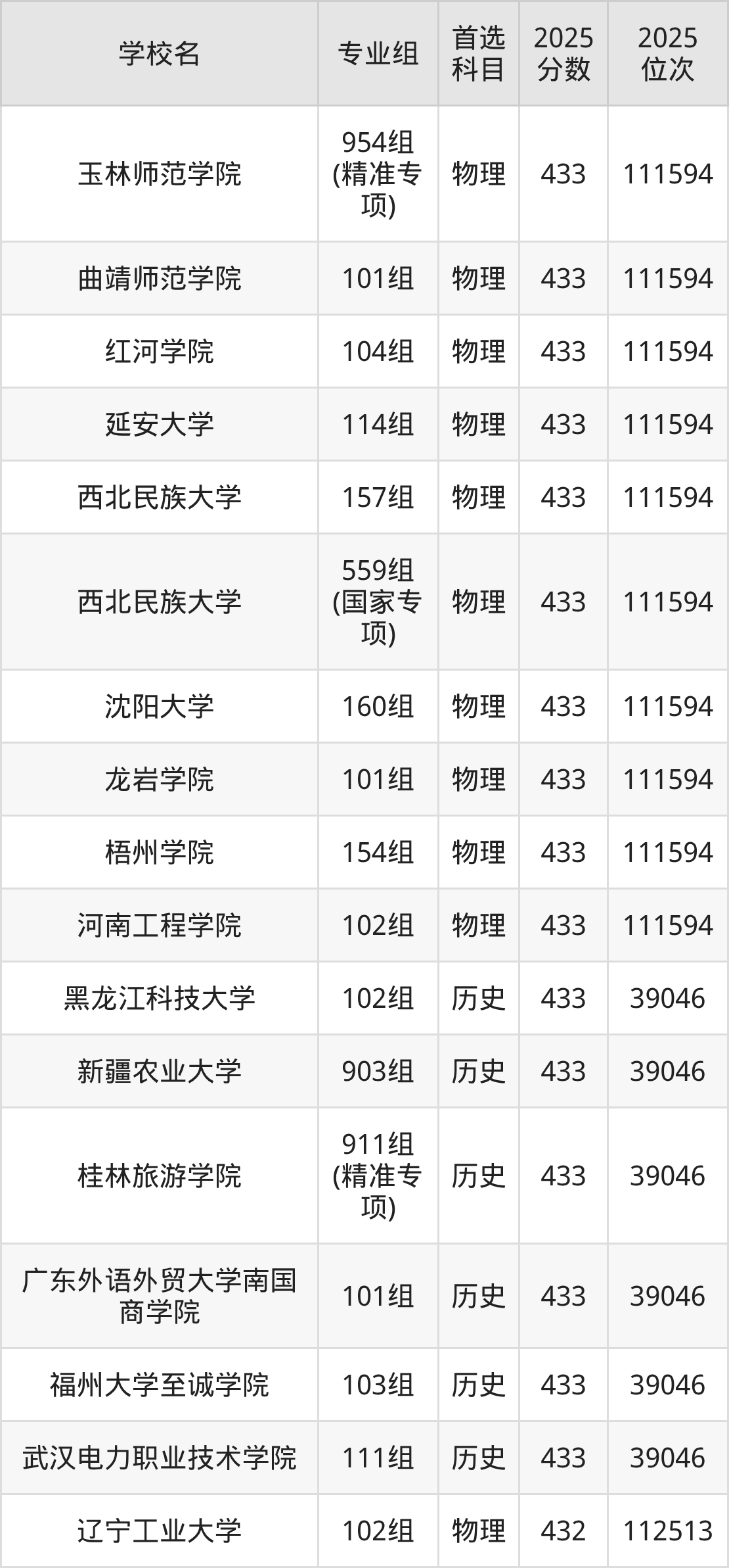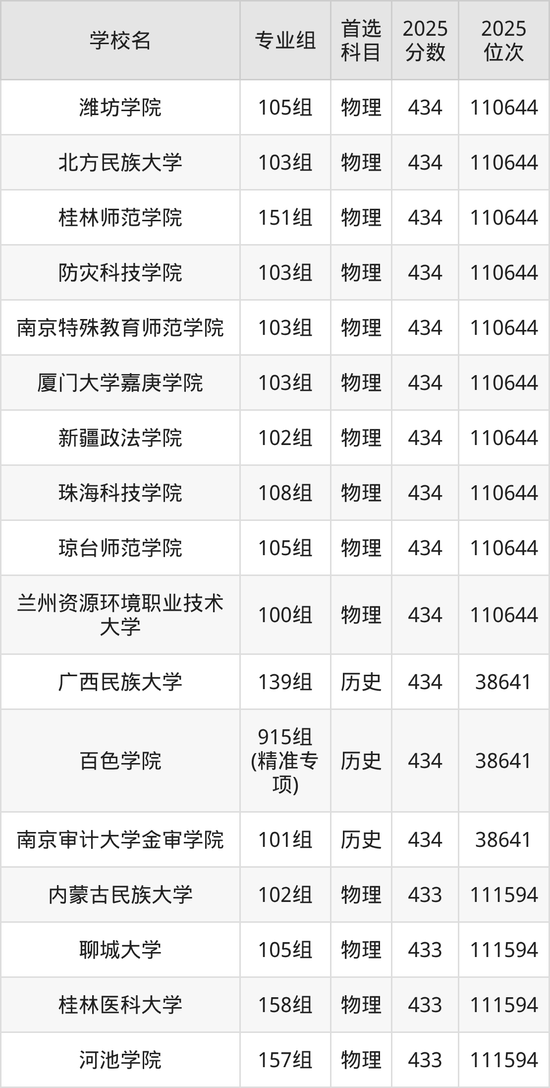 广西高考物理类434分对应的位次排名是110644名,历史类434分对应的位次排名是38641名,因此建议2026年位次排在这附近的同学考虑这些大学。