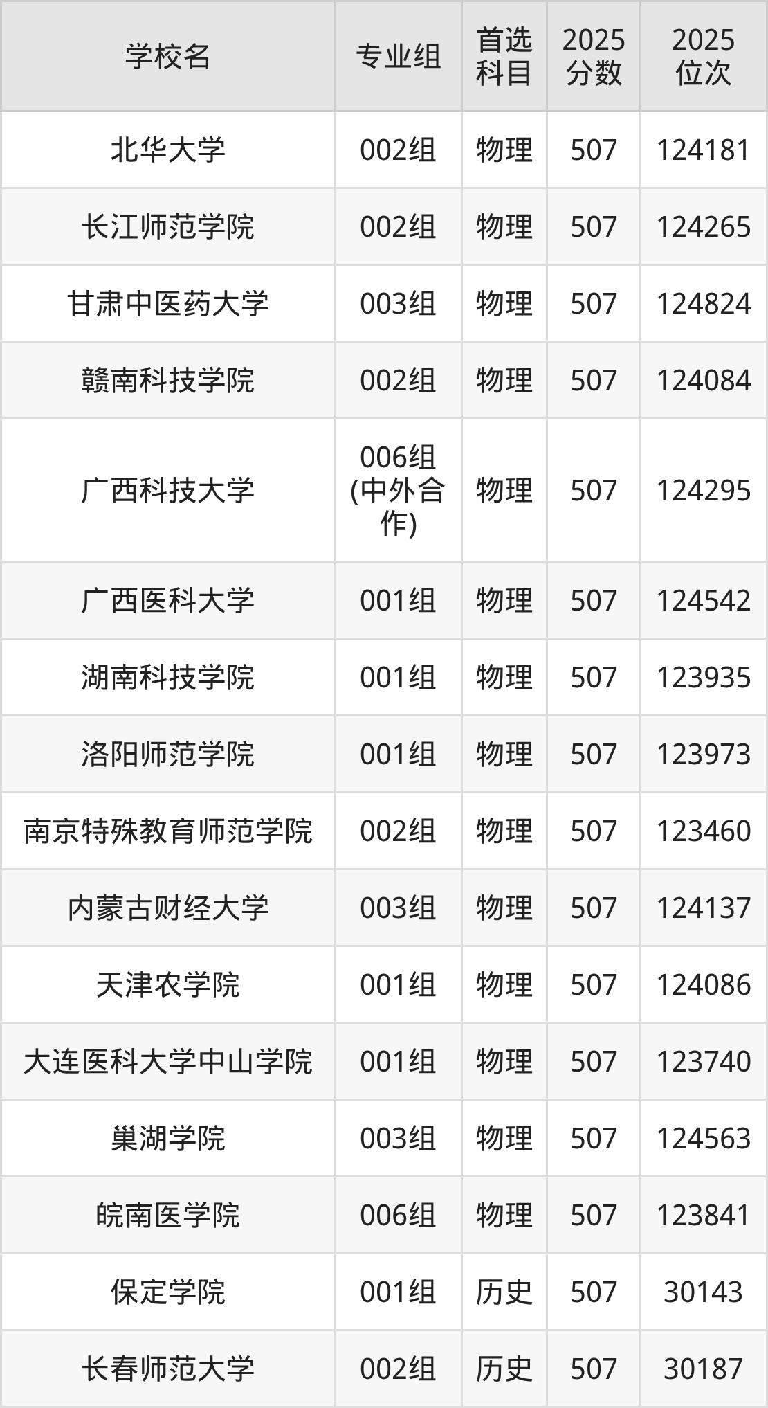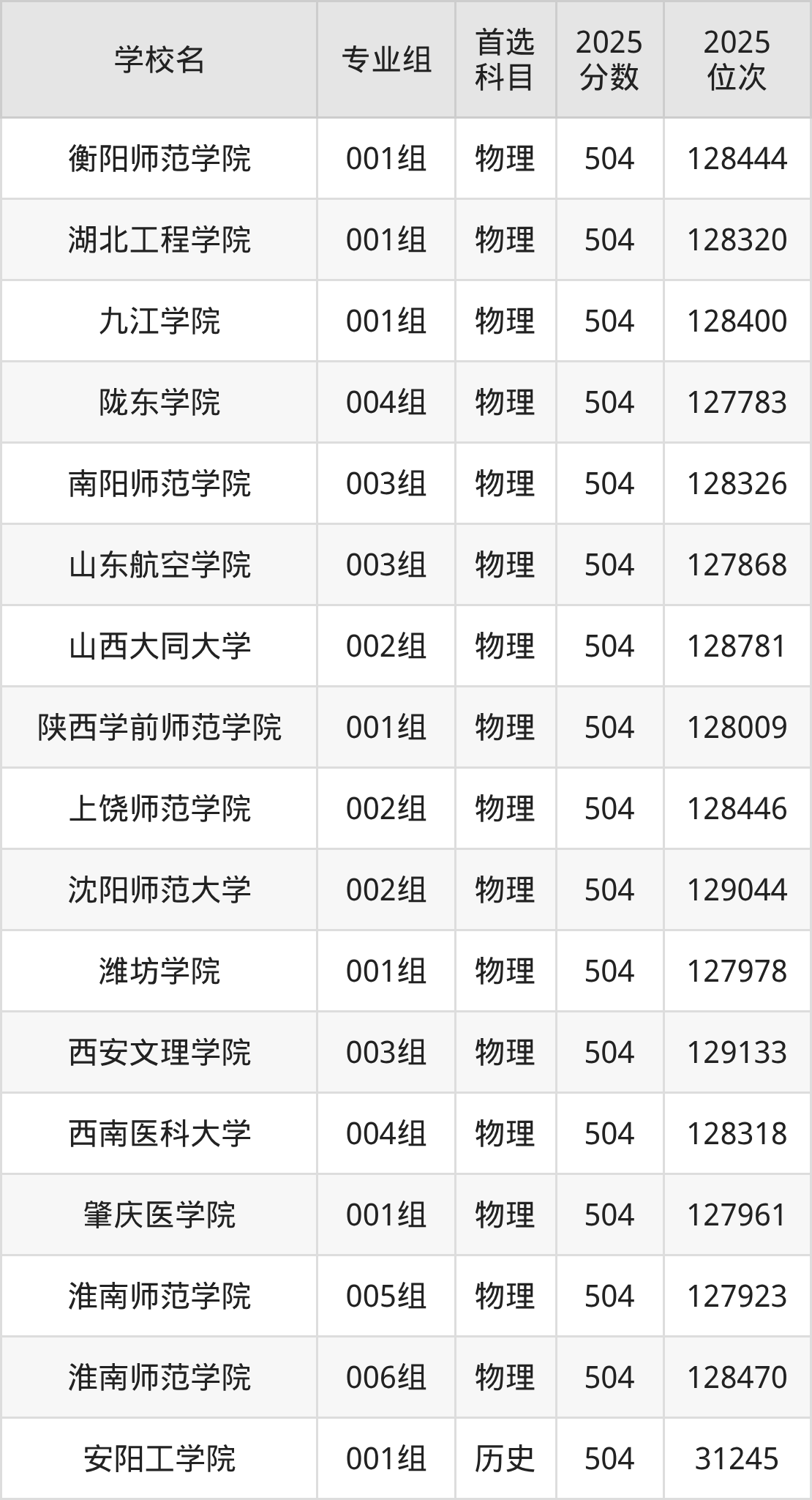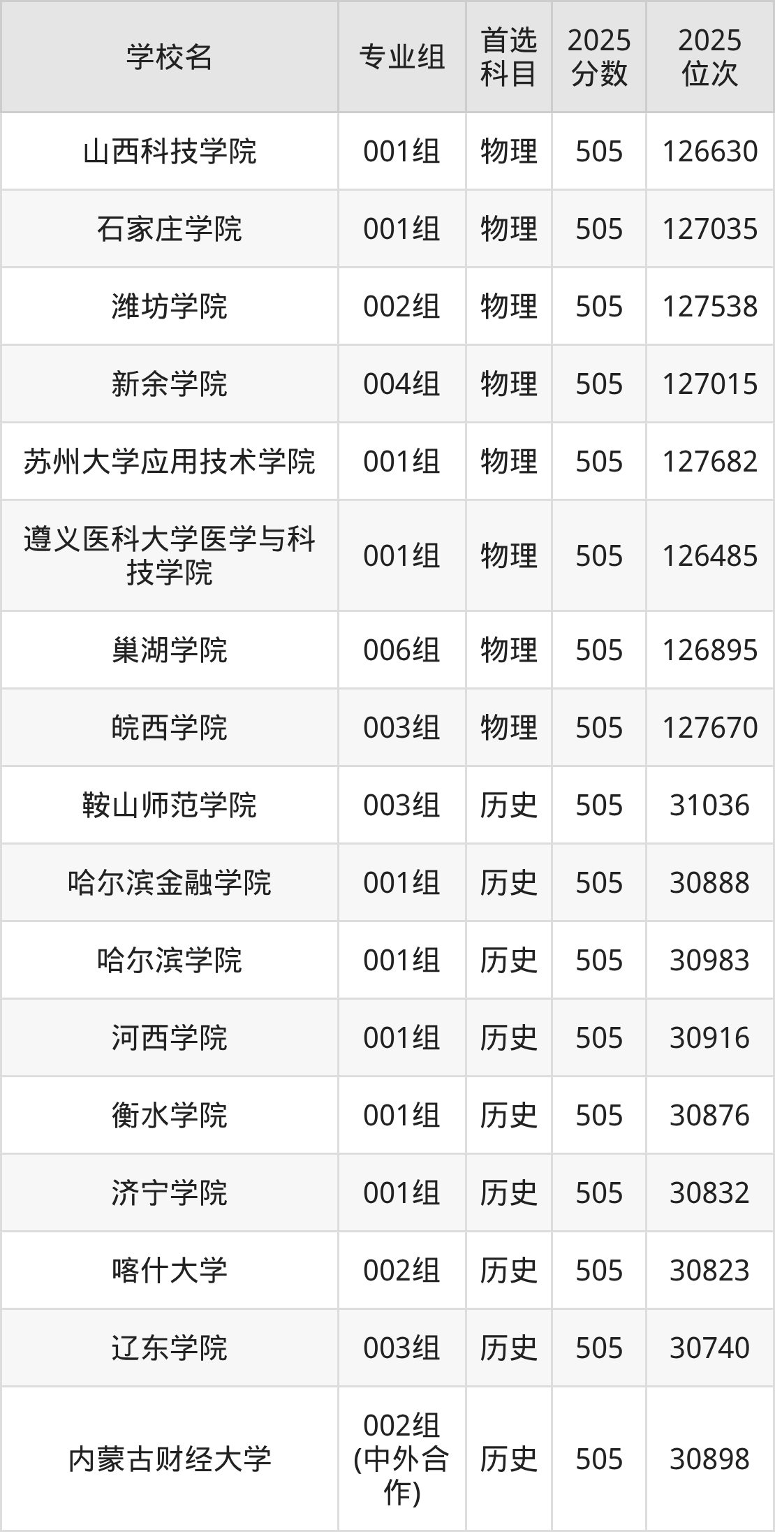 安徽高考物理类505分对应的位次排名是126316名-127704名,历史类505分对应的位次排名是30705名-31107名,因此建议2026年位次排在这附近的同学考虑这些大学。