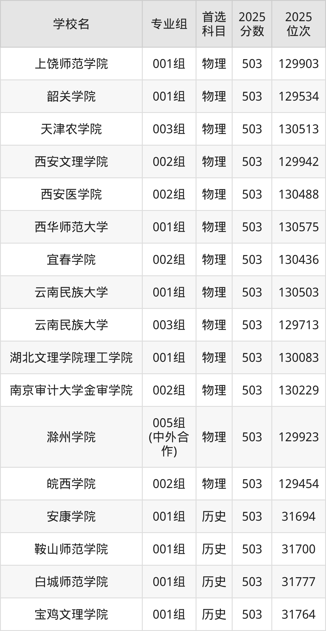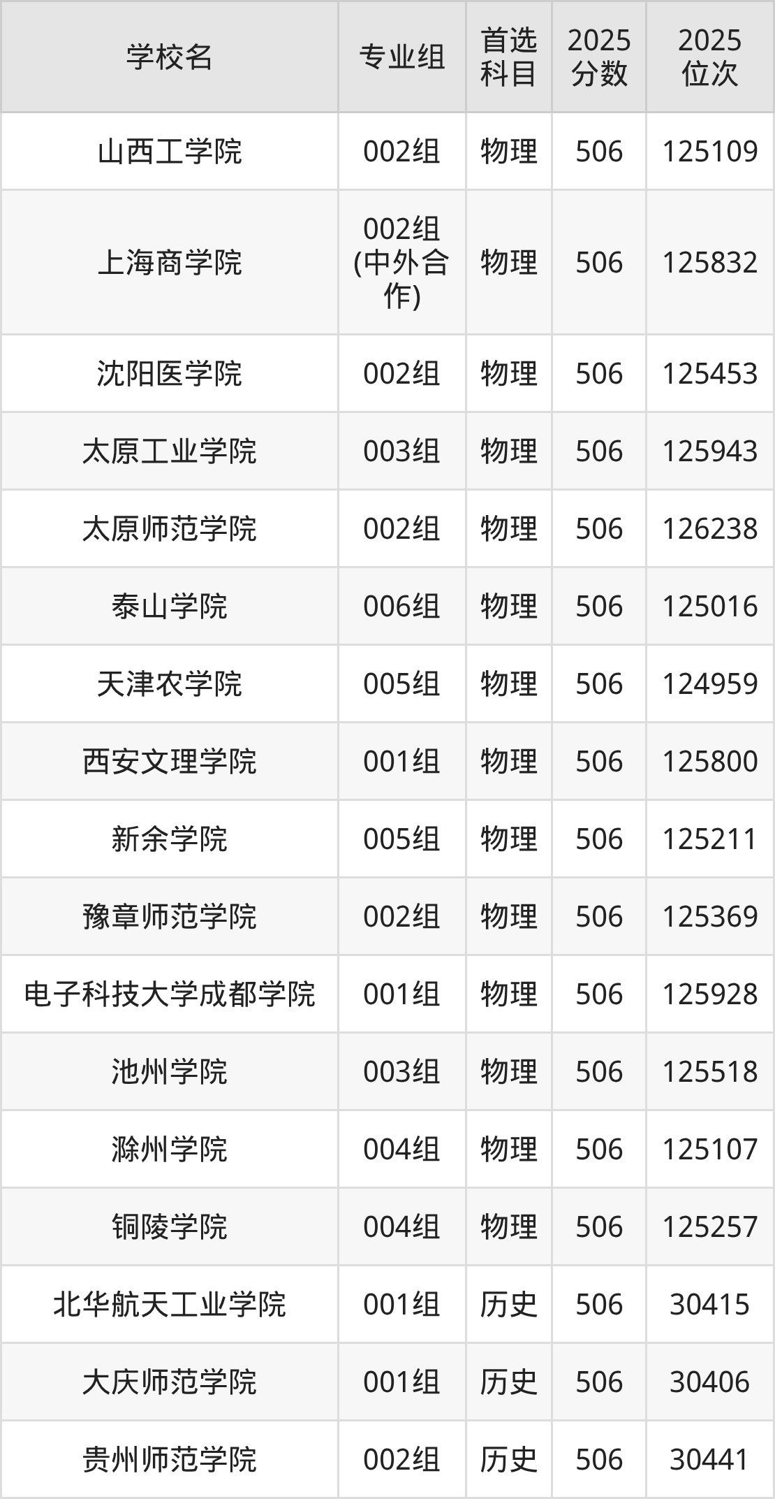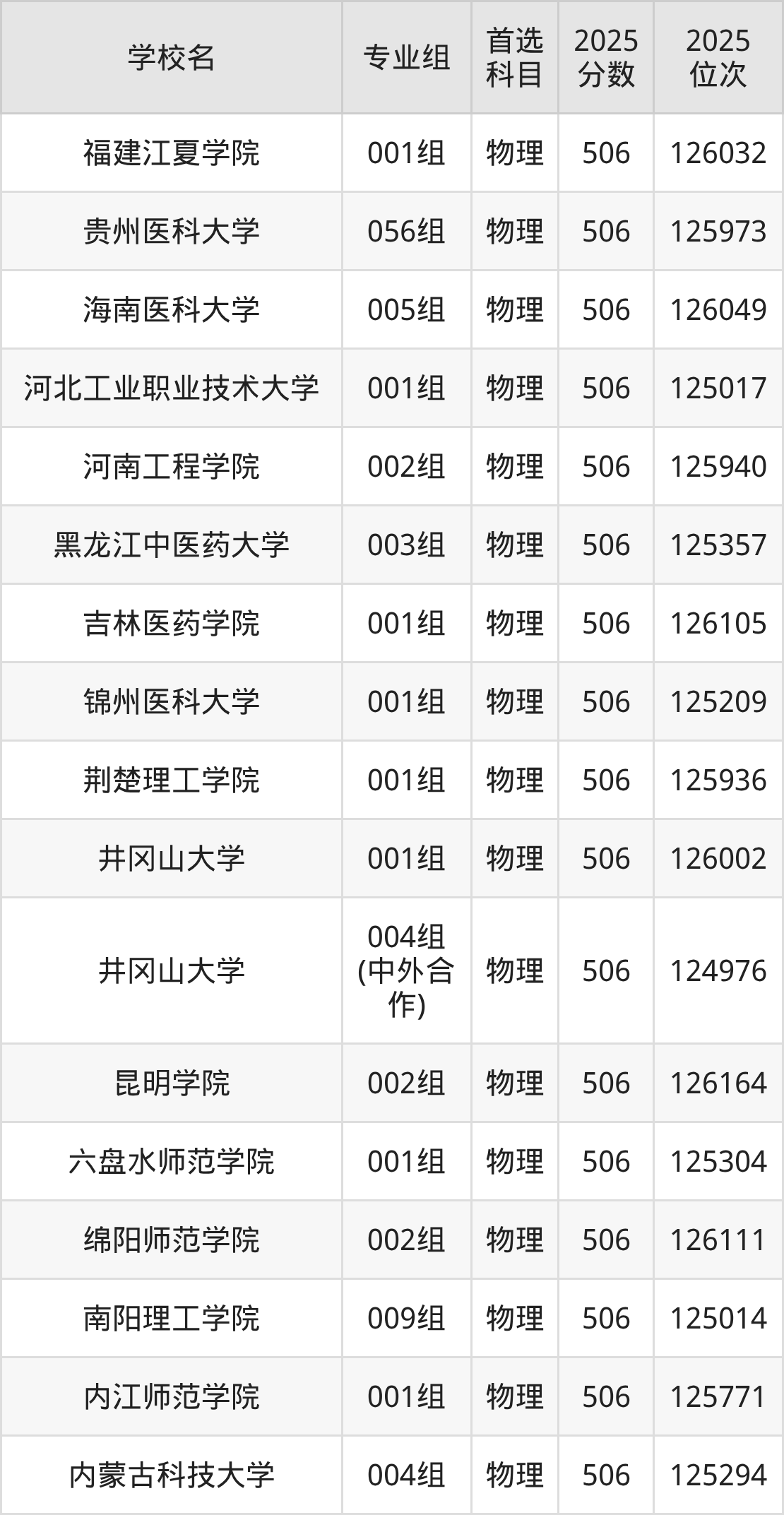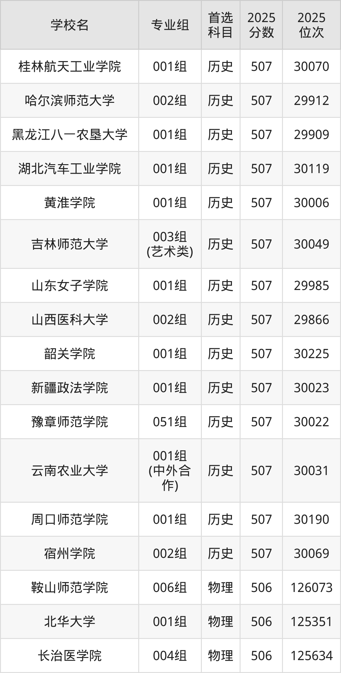 安徽高考物理类505分对应的位次排名是126316名-127704名,历史类505分对应的位次排名是30705名-31107名,因此建议2026年位次排在这附近的同学考虑这些大学。