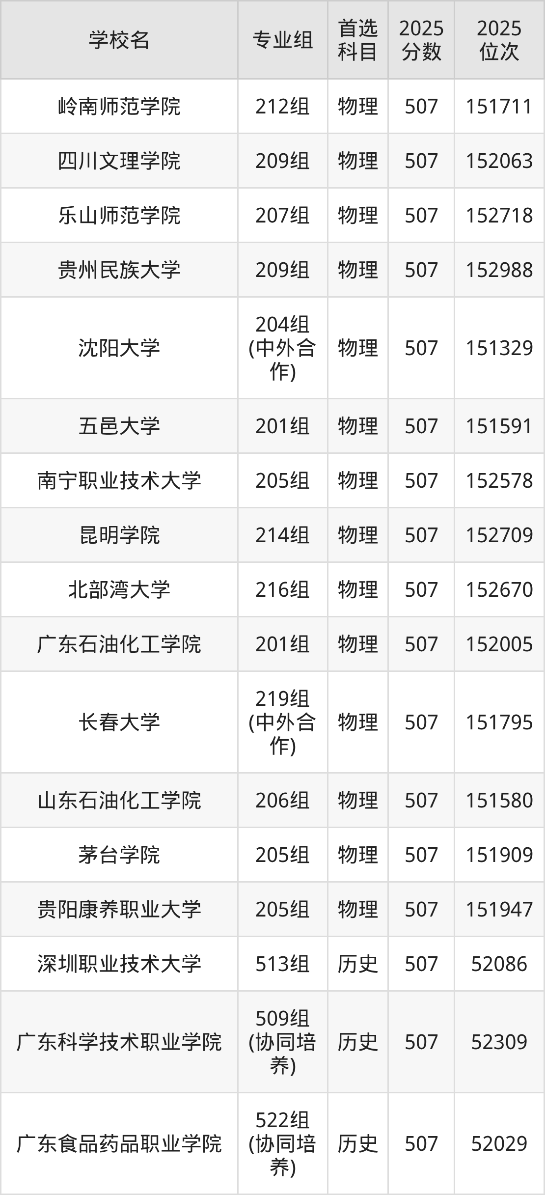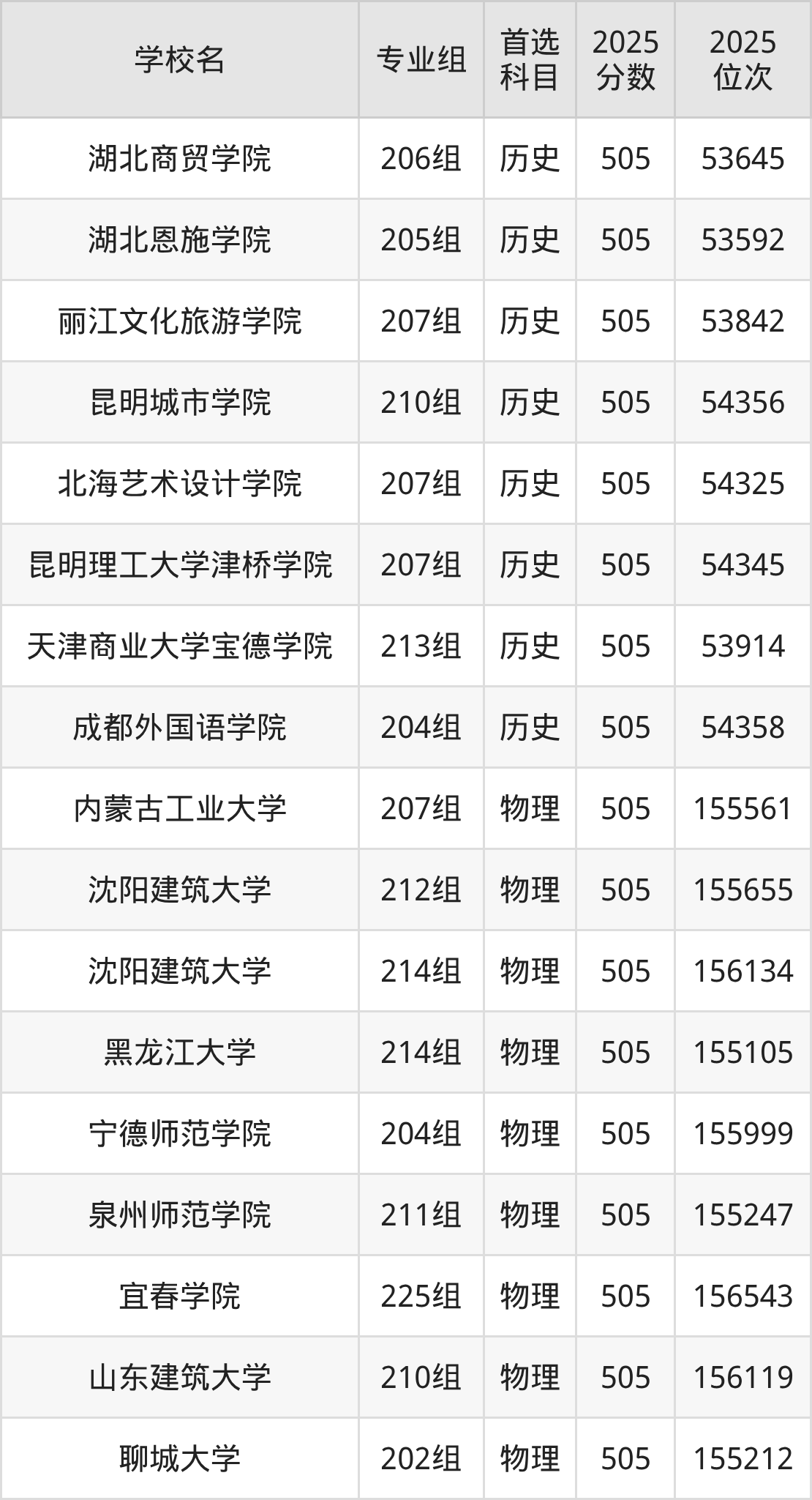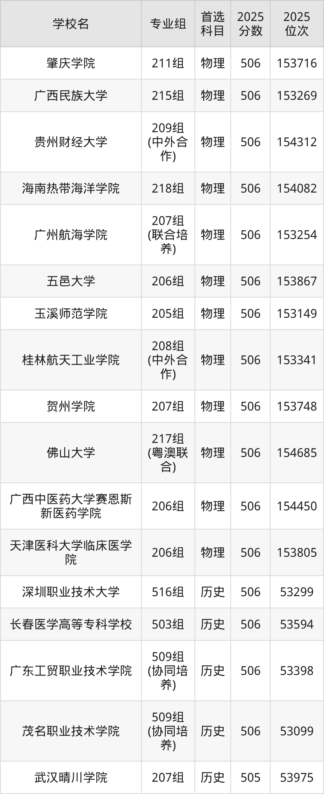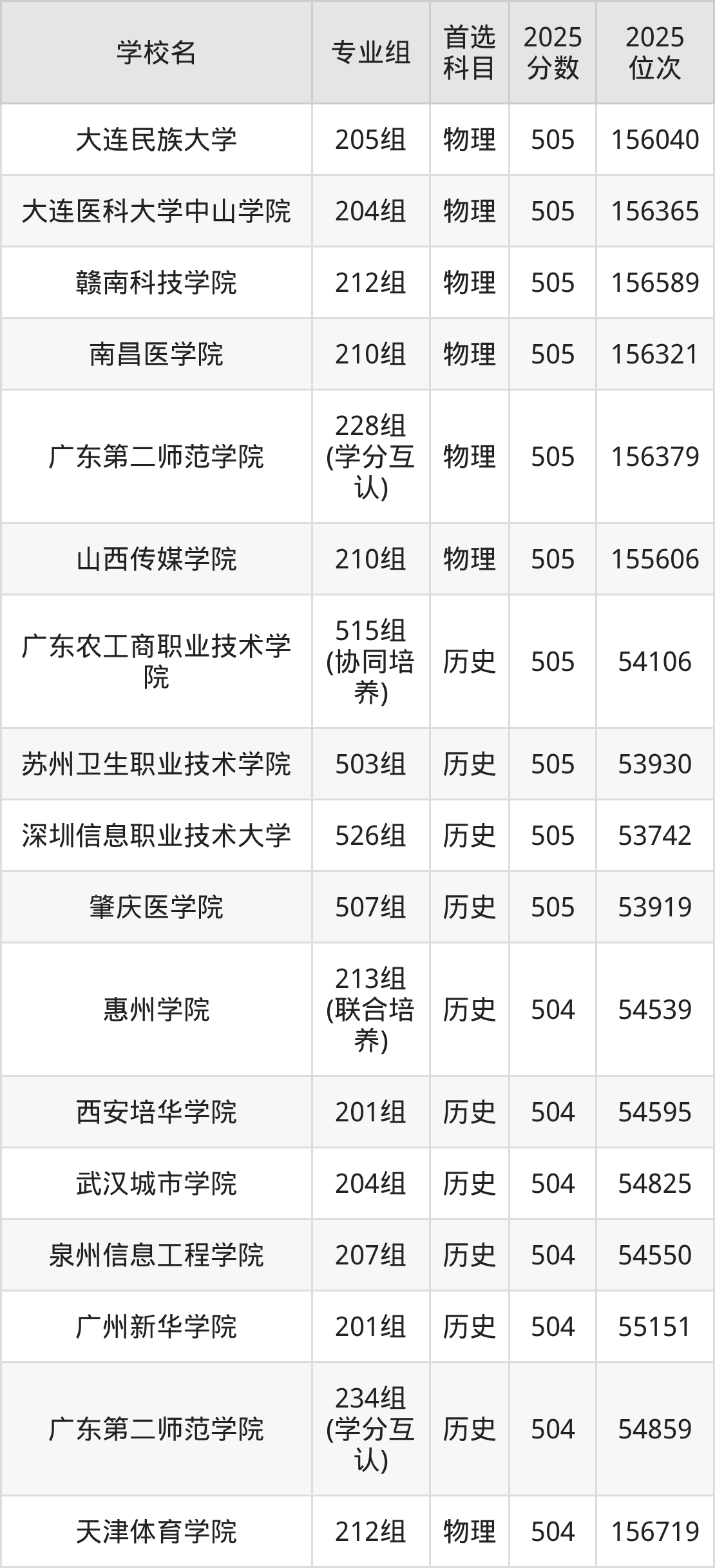 广东高考物理类505分对应的位次排名是154906名-156589名,历史类505分对应的位次排名是53592名-54358名,因此建议2026年位次排在这附近的同学考虑这些大学。