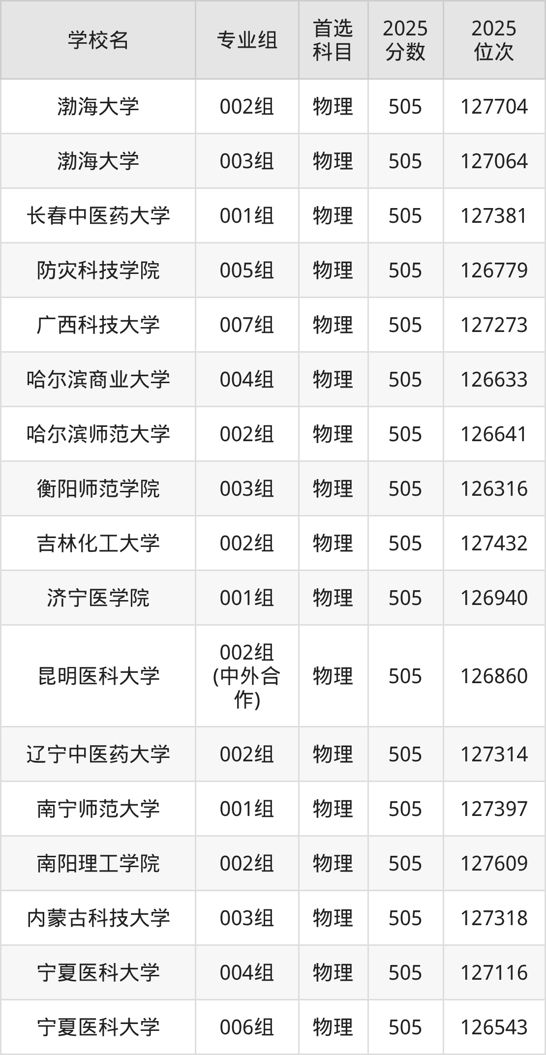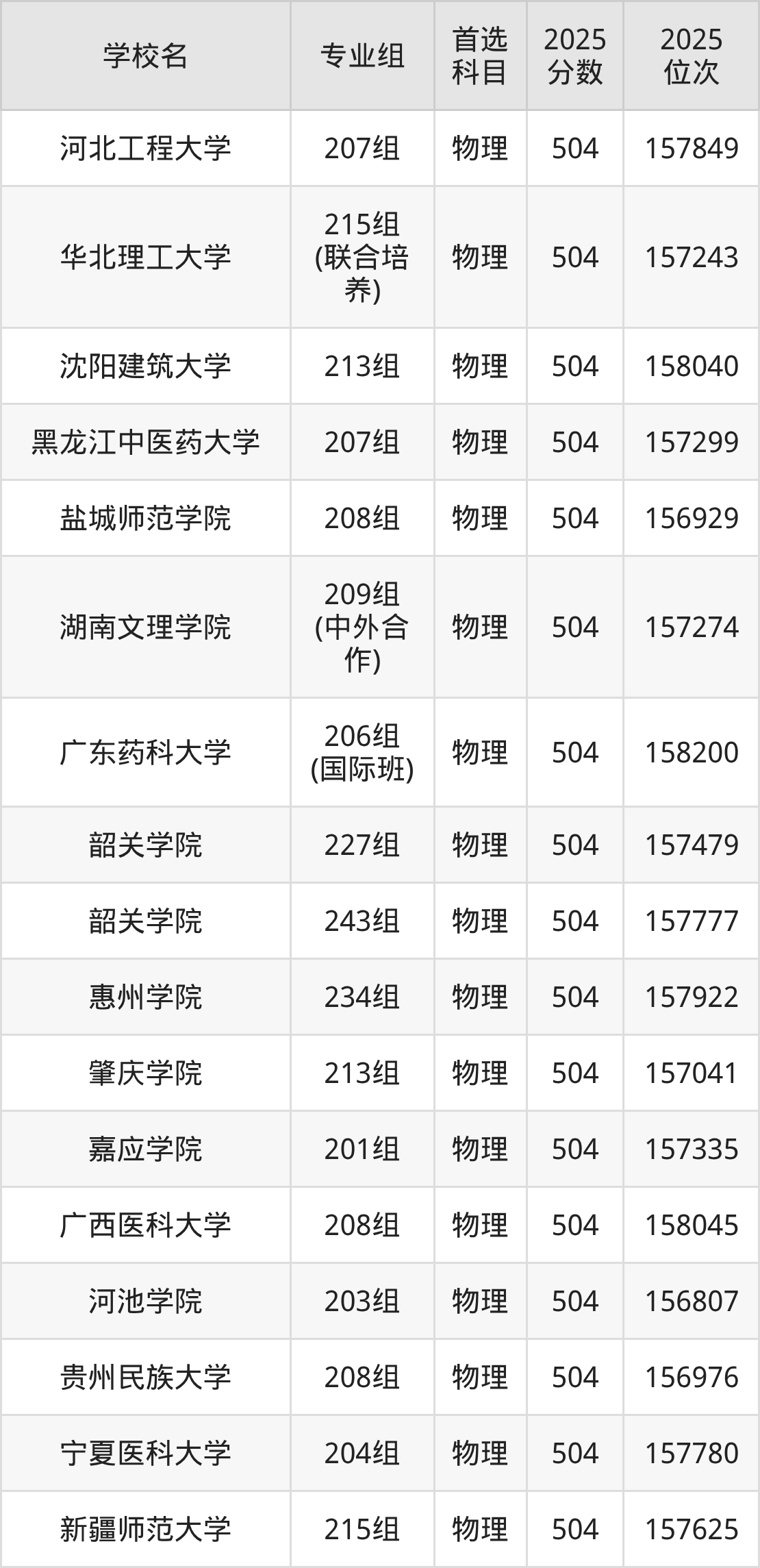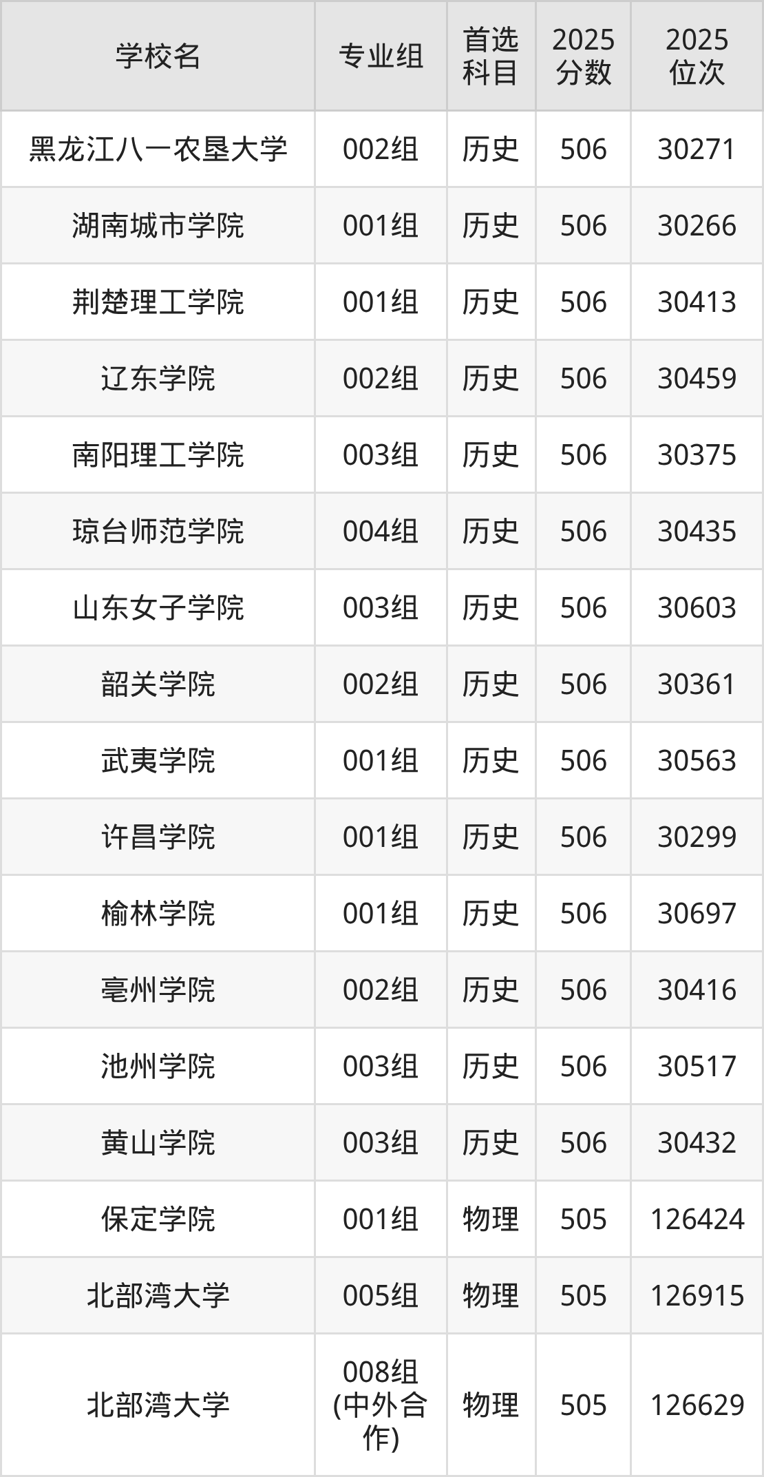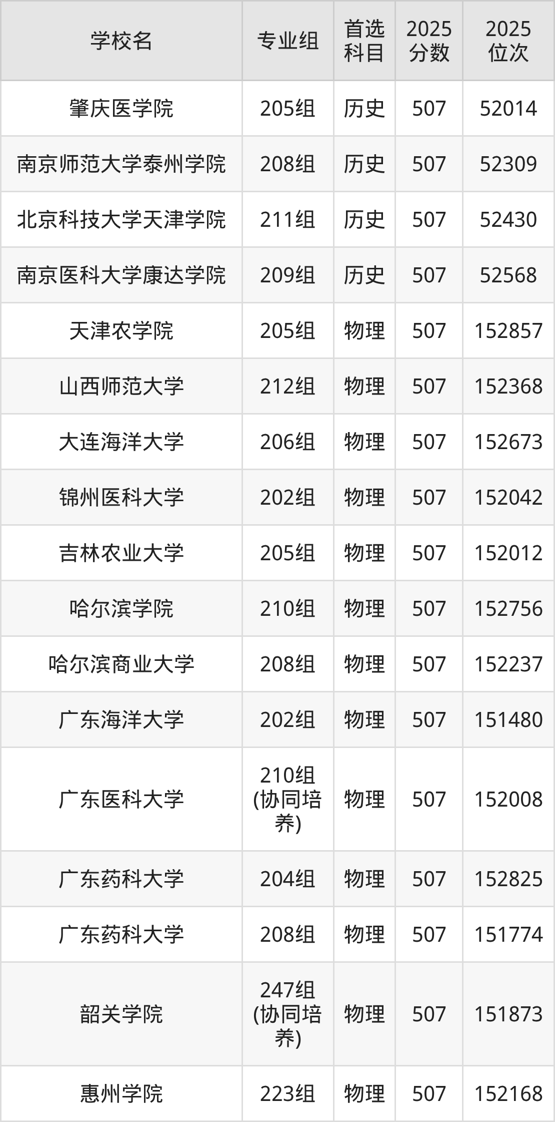 广东高考物理类505分对应的位次排名是154906名-156589名,历史类505分对应的位次排名是53592名-54358名,因此建议2026年位次排在这附近的同学考虑这些大学。