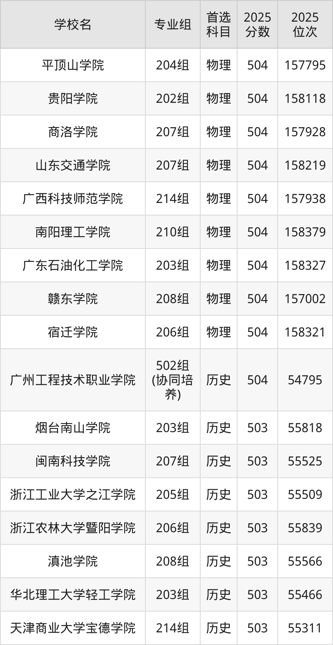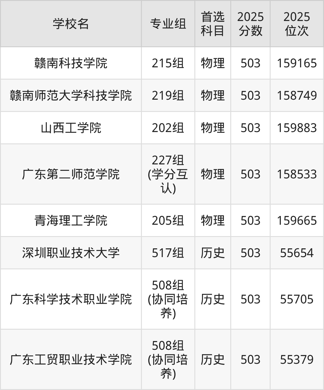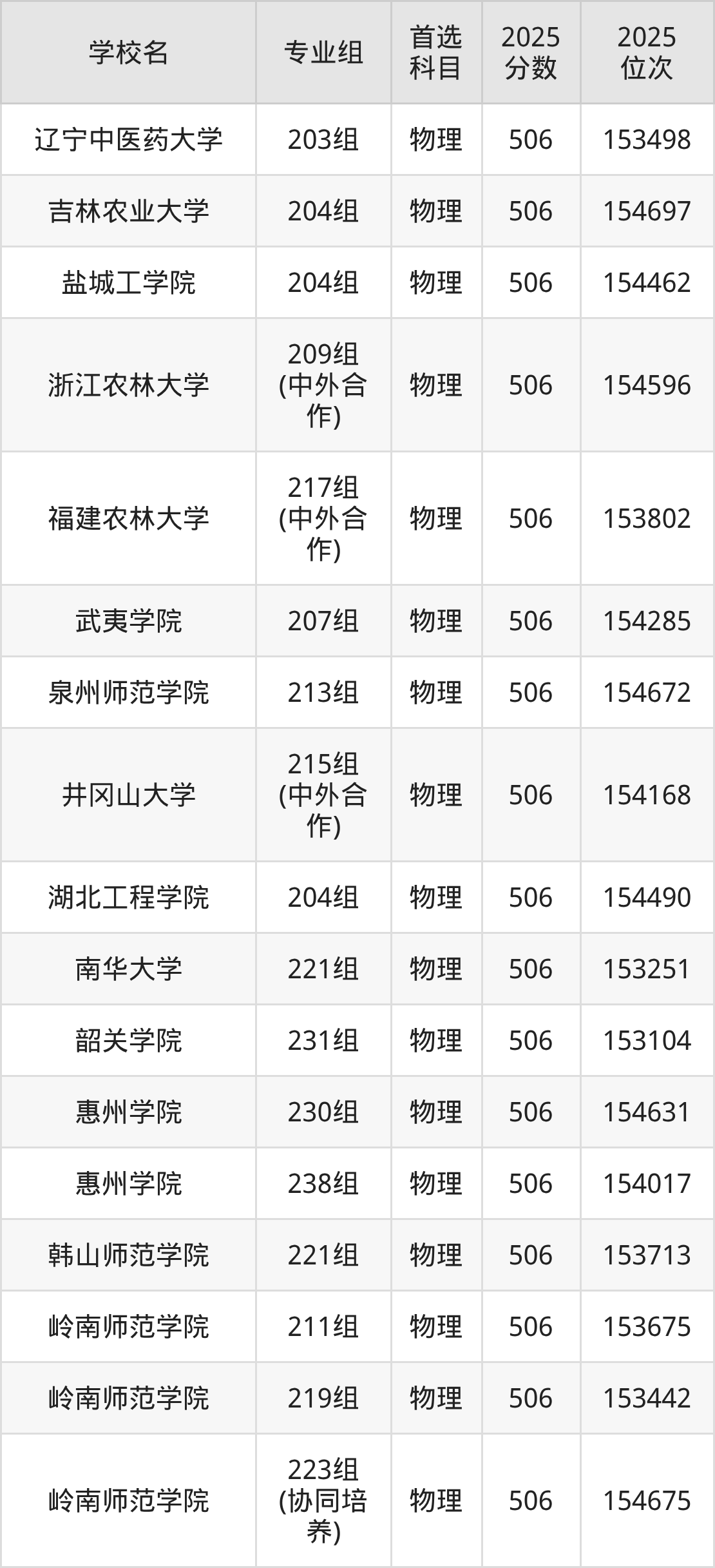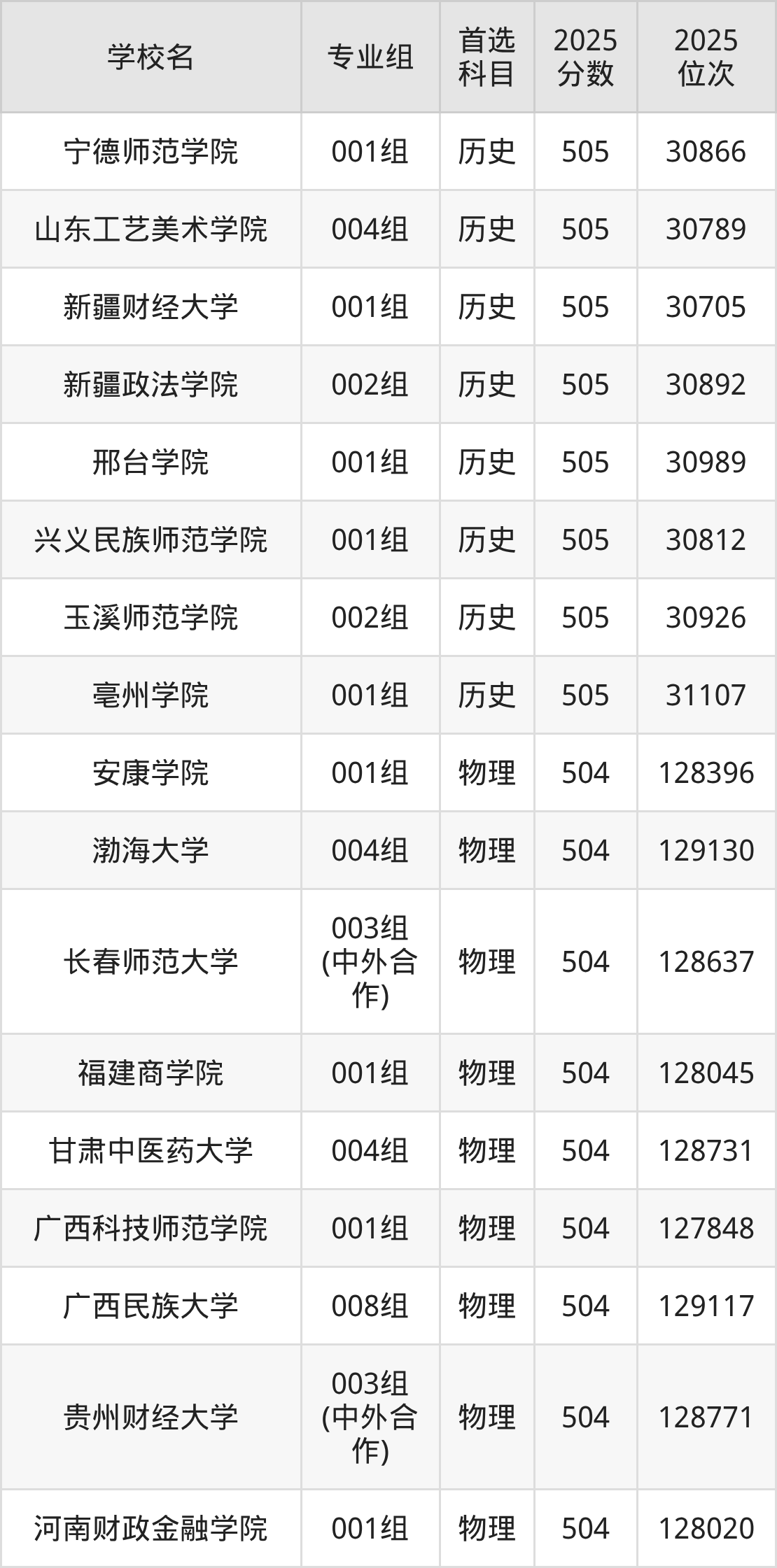广东高考物理类505分对应的位次排名是154906名-156589名,历史类505分对应的位次排名是53592名-54358名,因此建议2026年位次排在这附近的同学考虑这些大学。