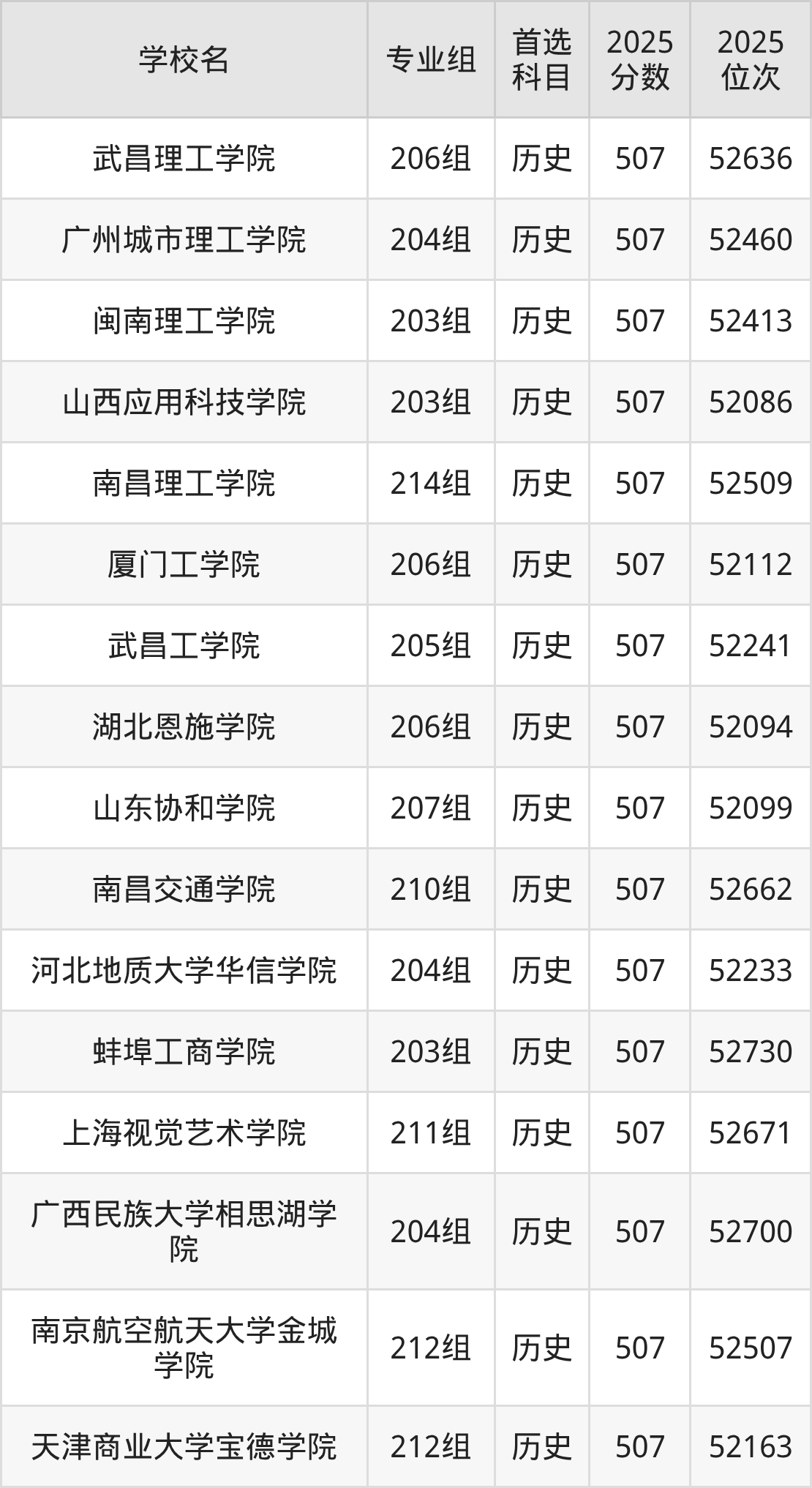 历史类505分可以冲的大学:武昌理工学院507分、广州城市理工学院507分、闽南理工学院507分、山西应用科技学院507分等;较稳妥的大学:惠州学院504分、西安培华学院504分、武汉城市学院504分、泉州信息工程学院504分等。
