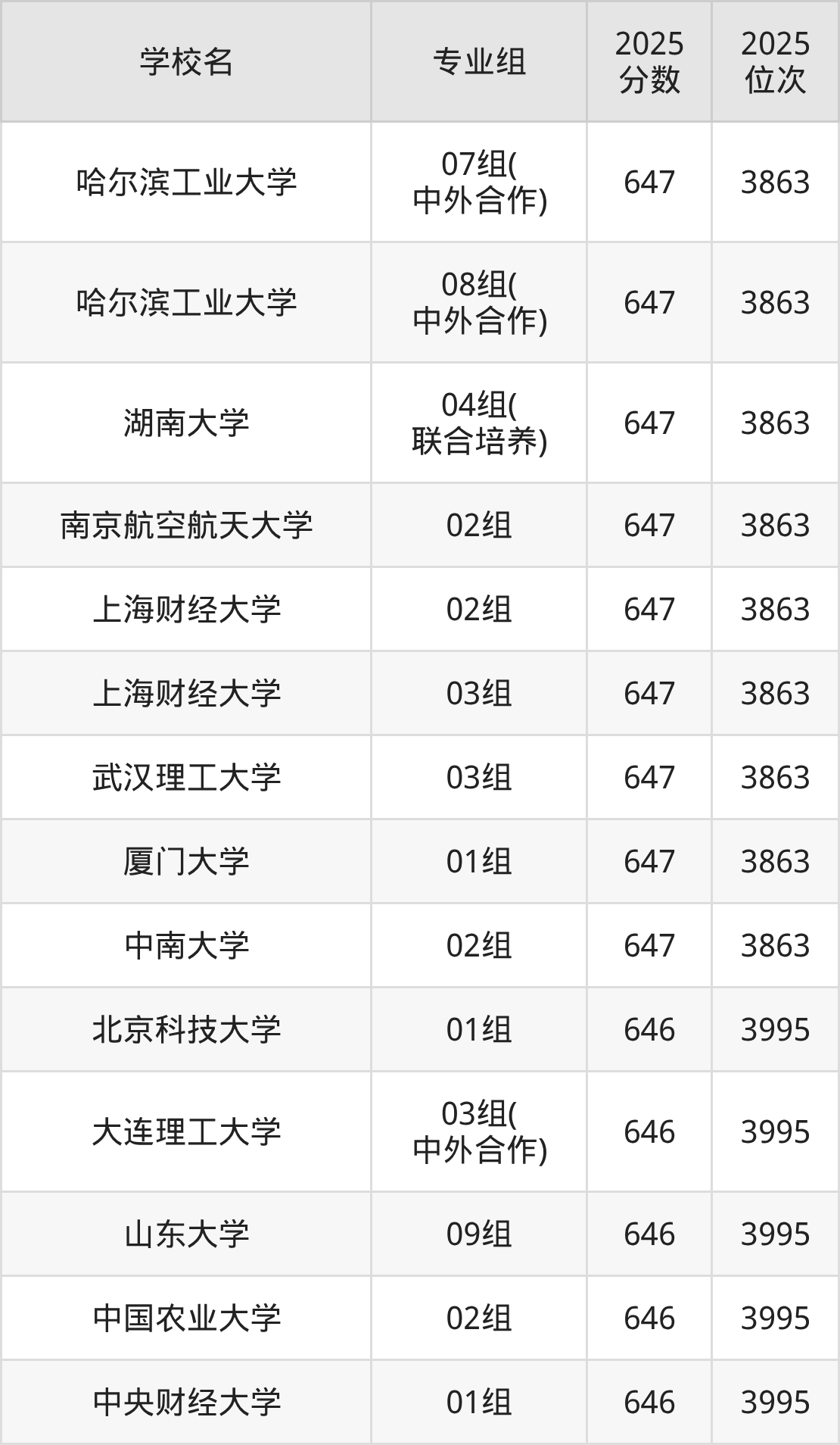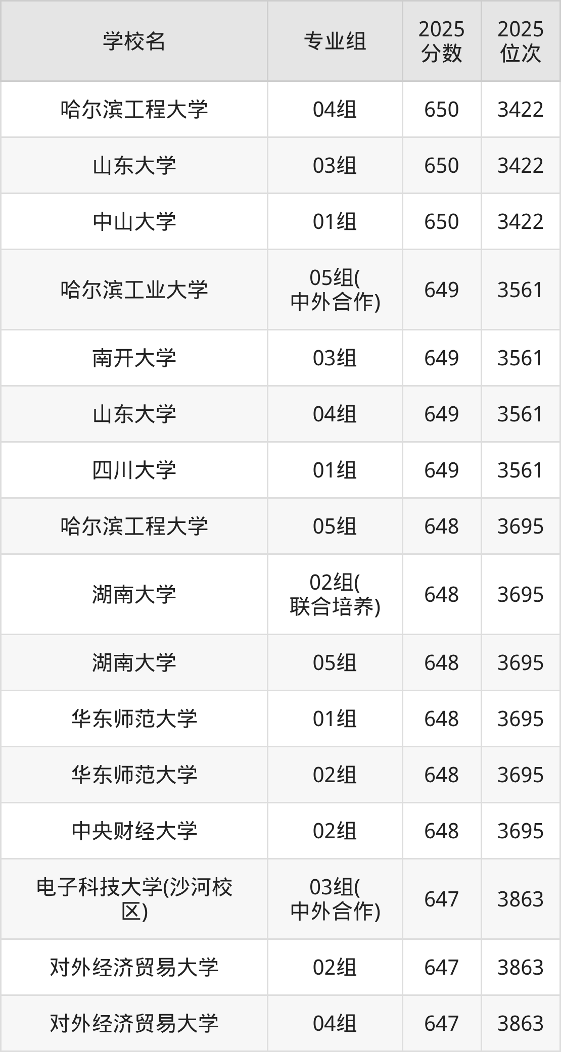 2025年在天津高考录取分数线是648分的大学一共有4所,分别是哈尔滨工程大学、湖南大学、华东师范大学、中央财经大学。