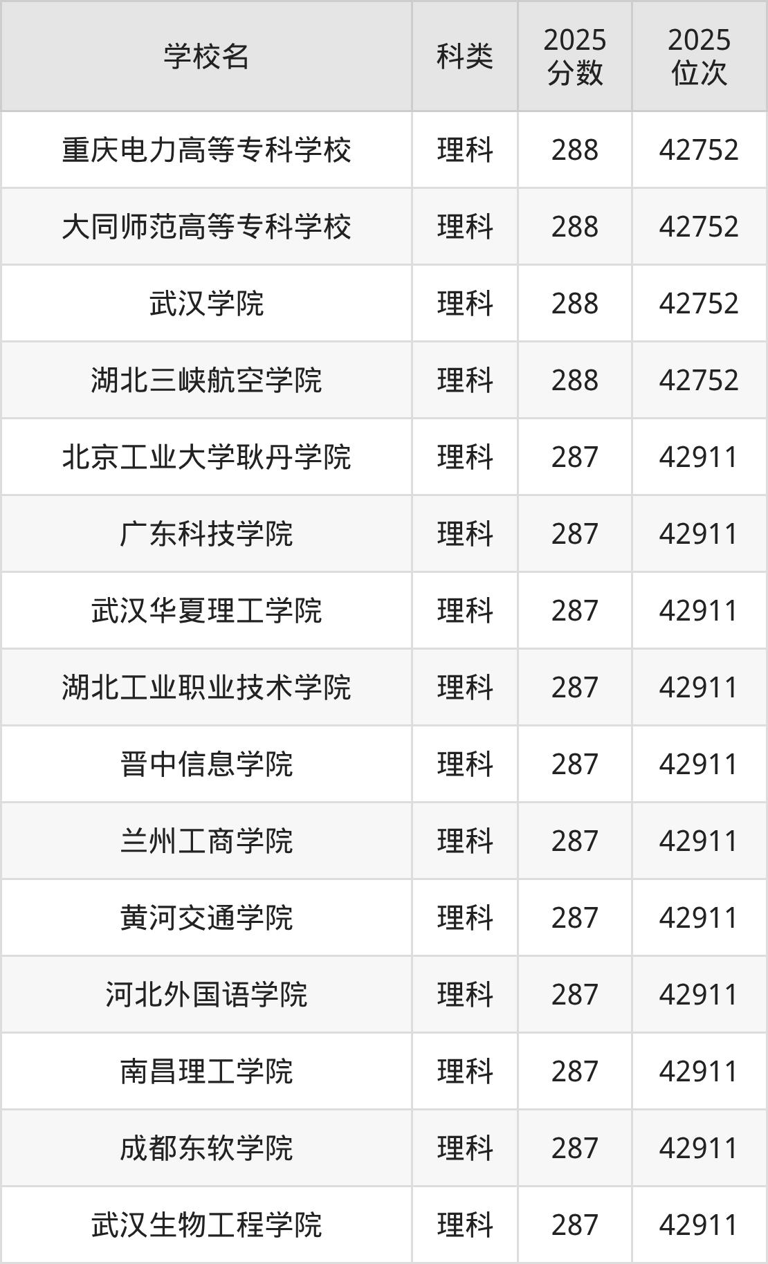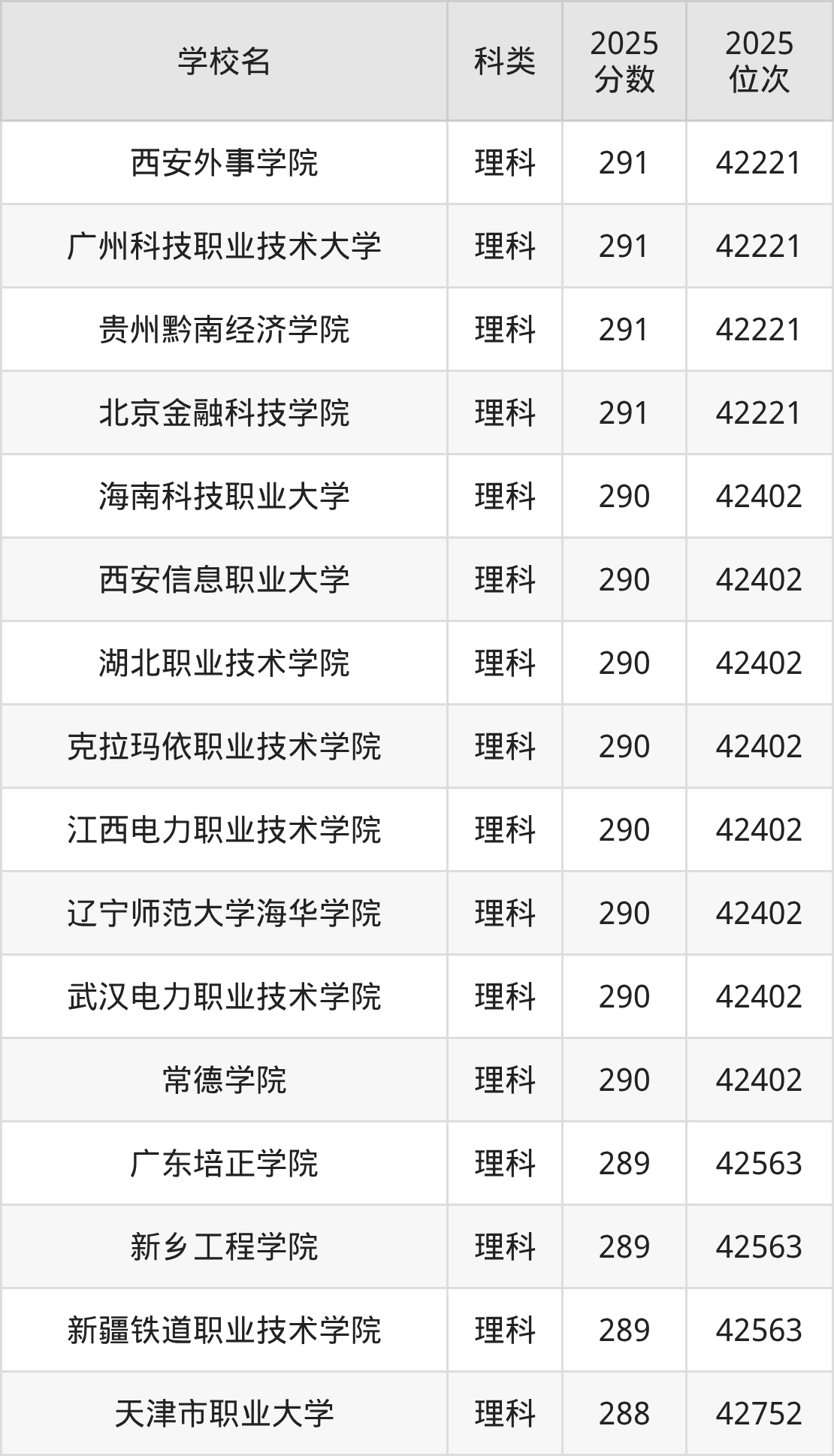 2025年在新疆高考录取分数线是289分的大学一共有3所,分别是广东培正学院、新乡工程学院、新疆铁道职业技术学院。