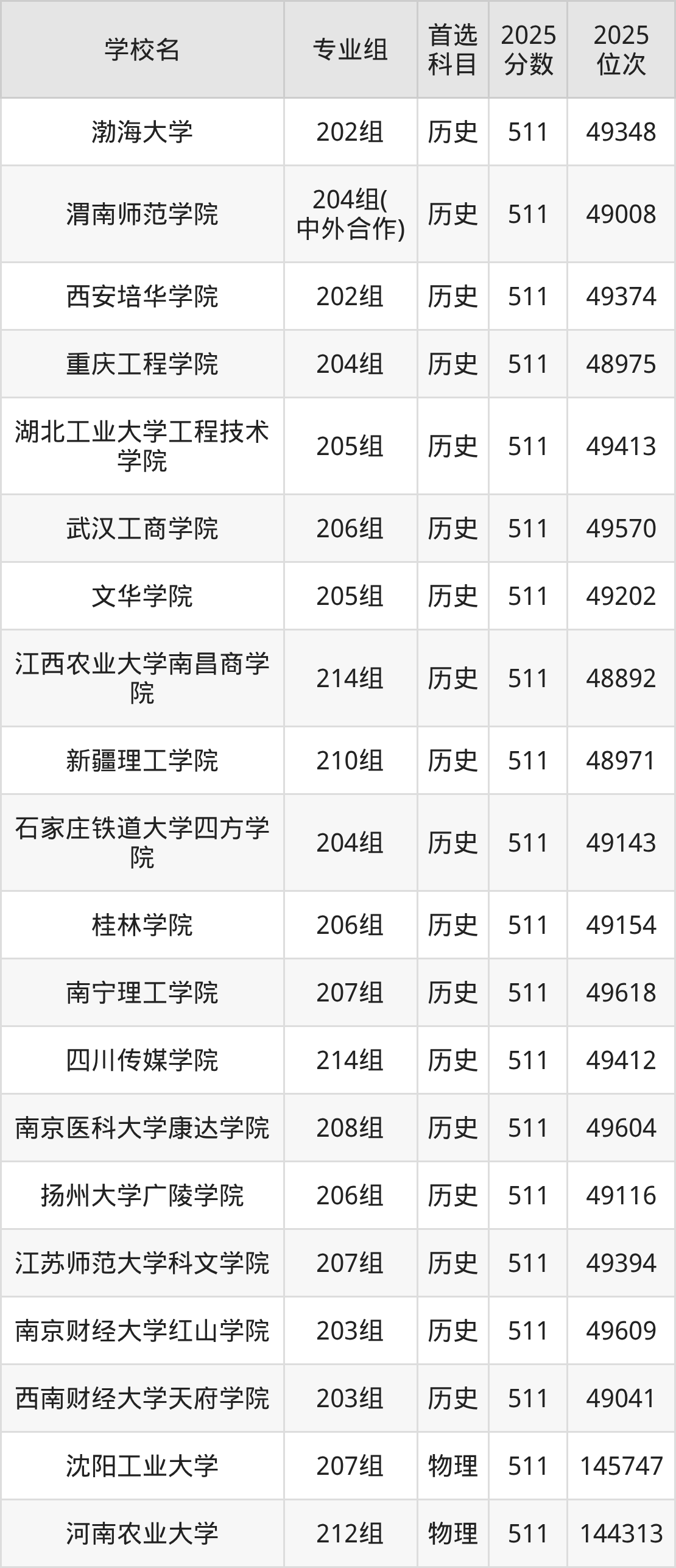 历史类509分可以冲的大学:渤海大学511分、渭南师范学院511分、西安培华学院511分、重庆工程学院511分等;较稳妥的大学:临沂大学508分、湖南人文科技学院508分、闽南科技学院508分、武汉工程大学邮电与信息工程学院508分等。
