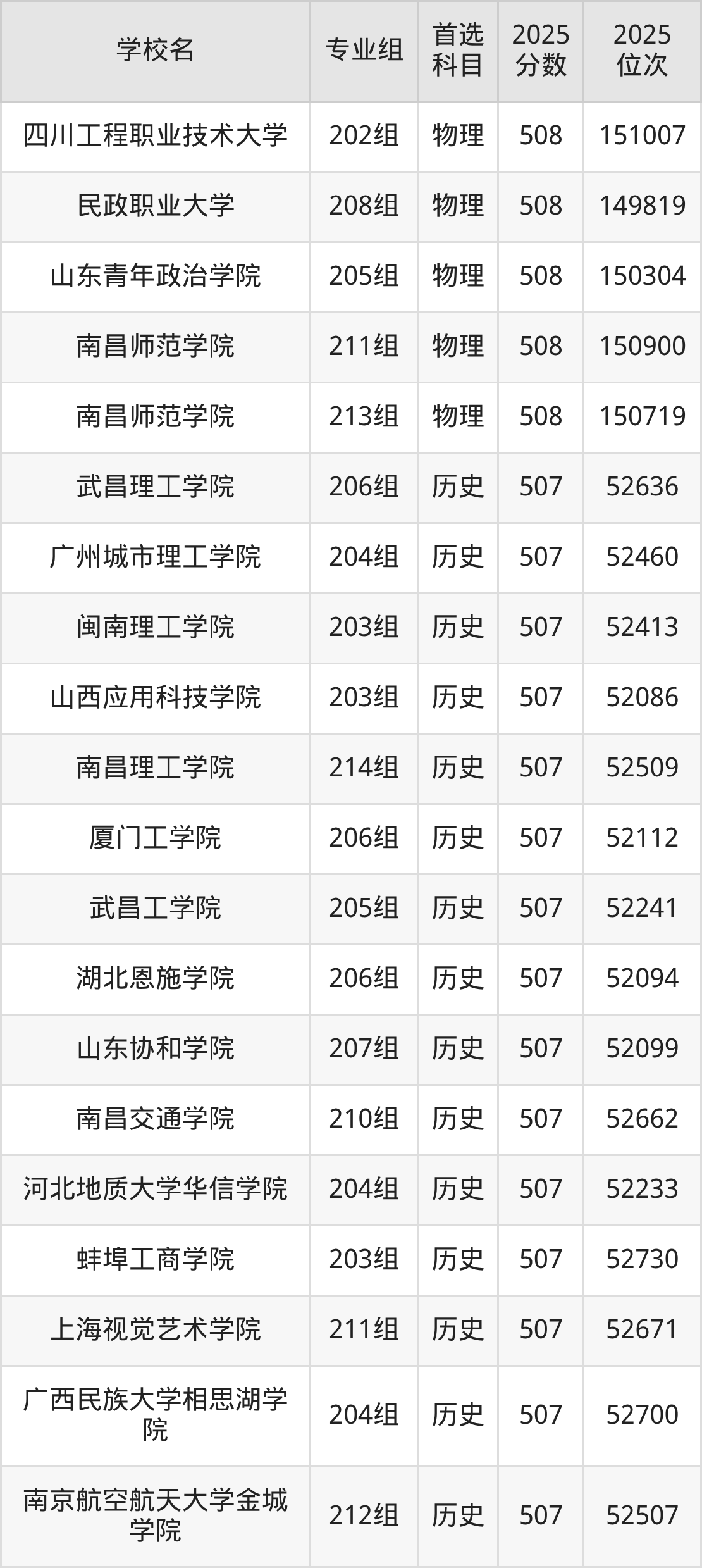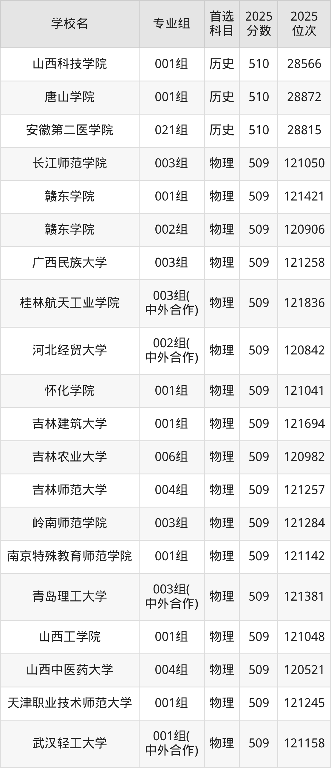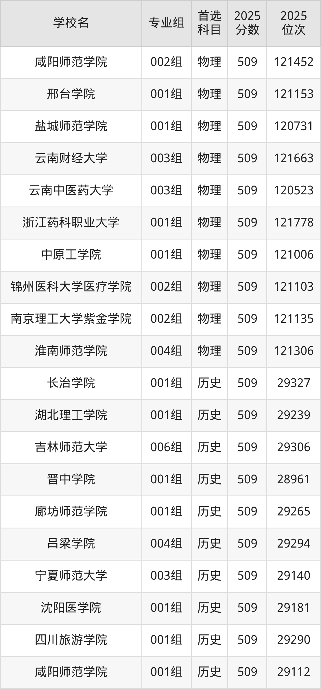 安徽高考物理类509分对应的位次排名是120521名-121836名,历史类509分对应的位次排名是28961名-29327名,因此建议2026年位次排在这附近的同学考虑这些大学。