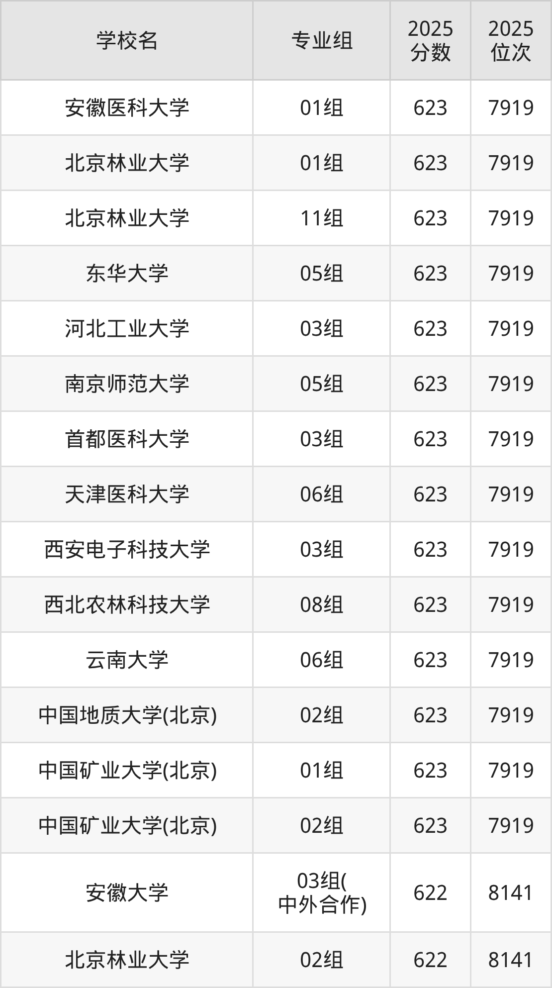 621分可以冲一冲的大学:安徽医科大学623分、北京林业大学623分、东华大学623分、河北工业大学623分等;