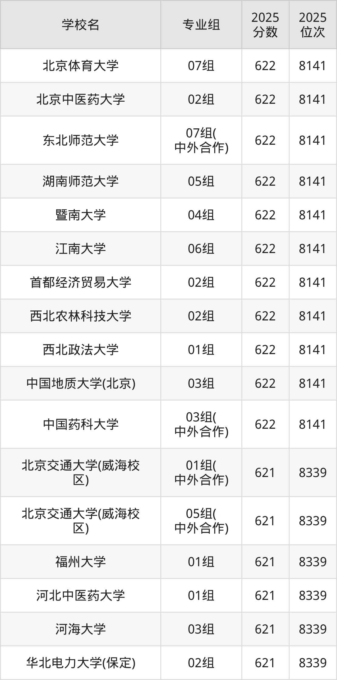 天津621分对应的位次排名是8339名,因此建议2026年位次排在这附近的考生考虑这些大学。