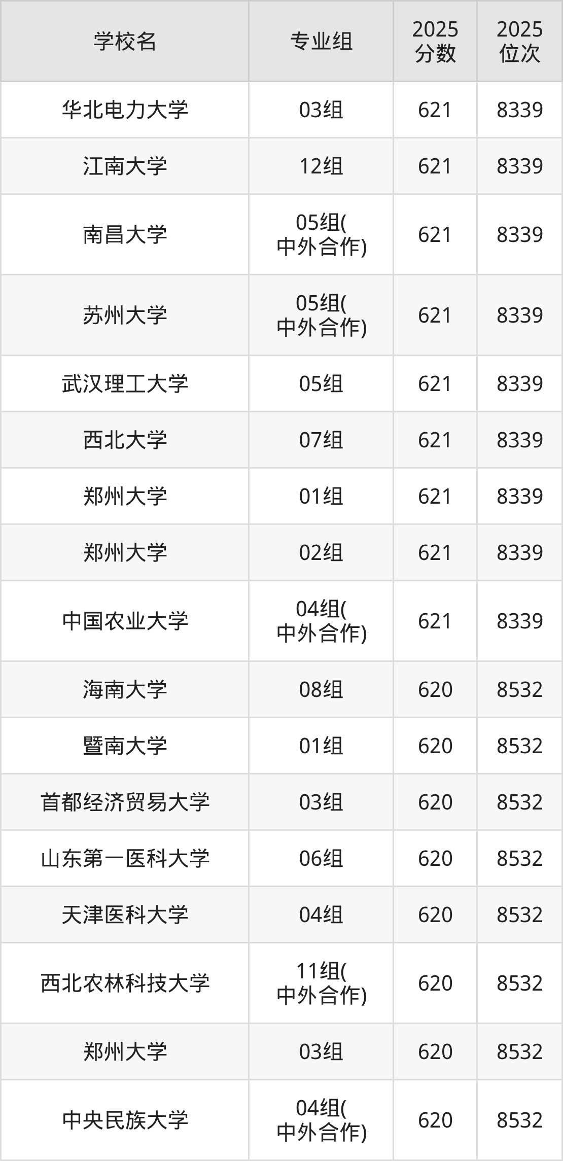 621分较稳妥的大学:海南大学620分、暨南大学620分、首都经济贸易大学620分、山东第一医科大学620分等。