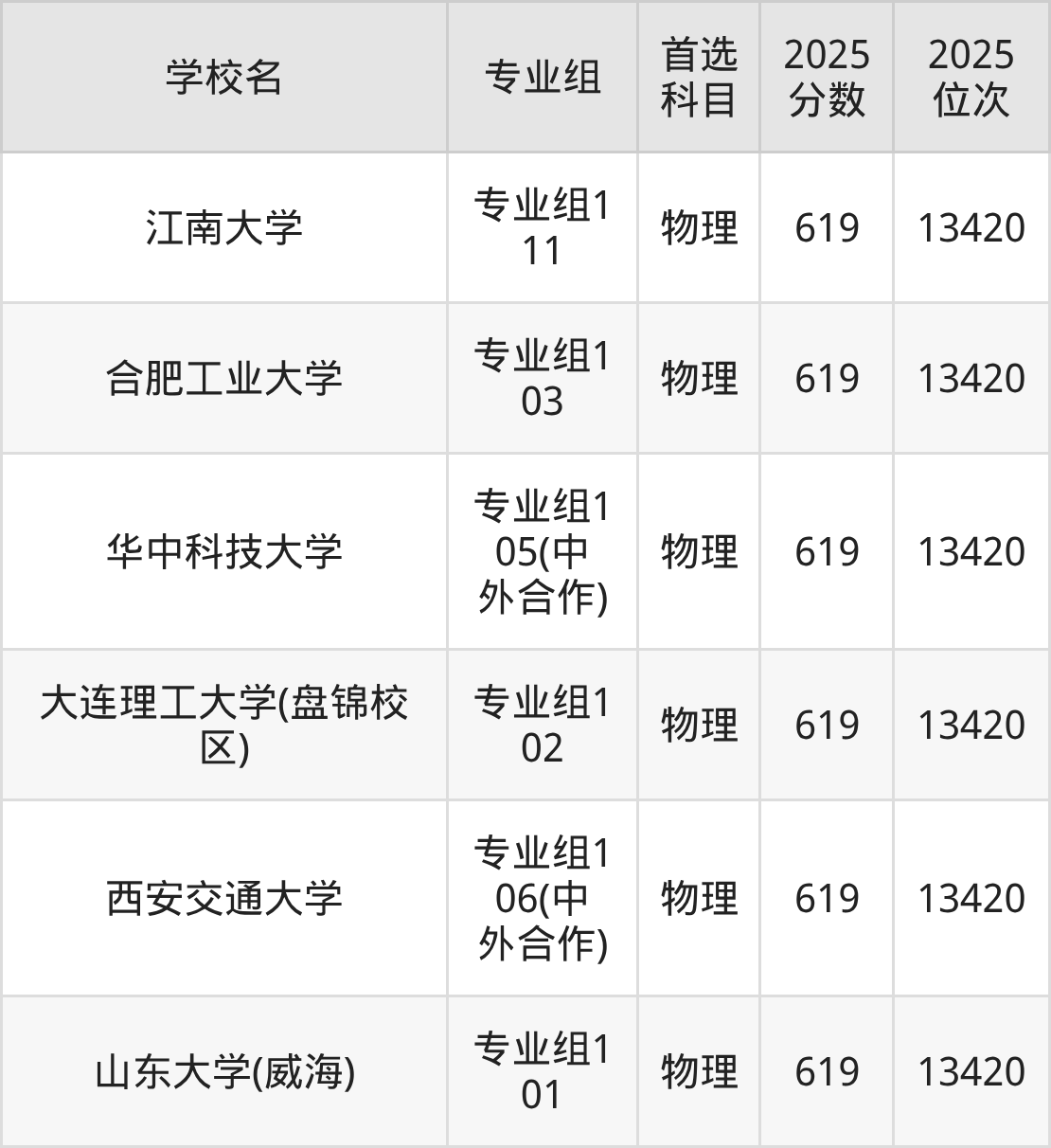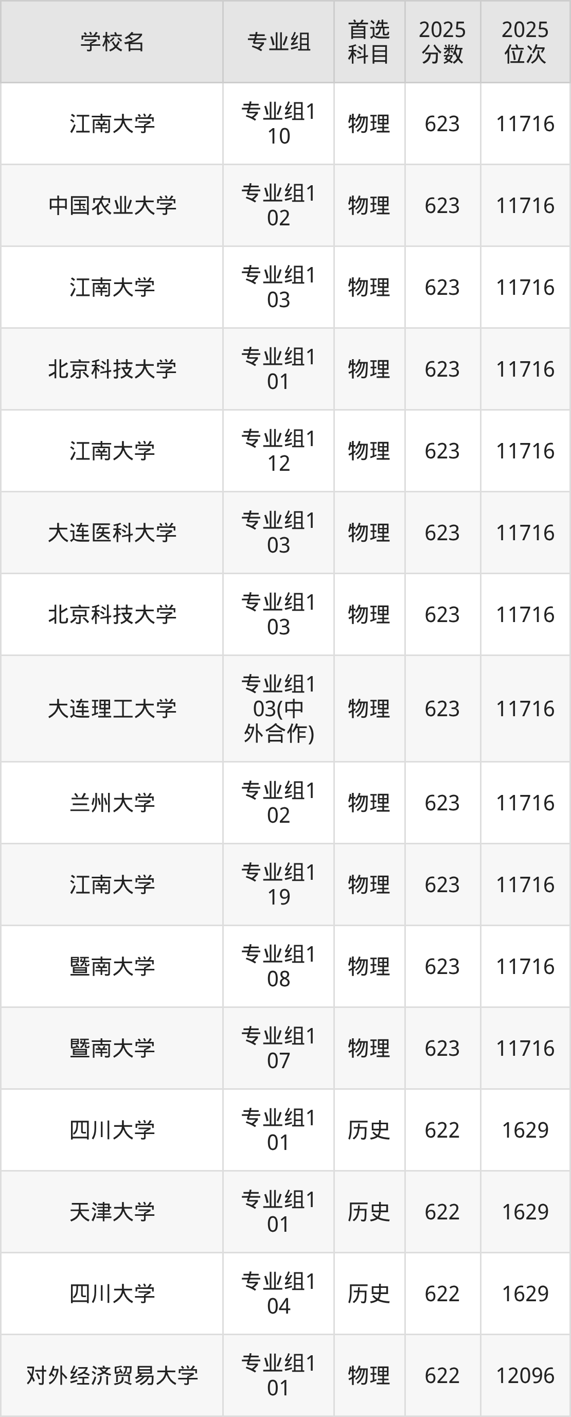 物理类621分可以冲的大学:江南大学623分、中国农业大学623分、北京科技大学623分、大连医科大学623分等;较稳妥的大学:四川大学620分、北京外国语大学620分、上海外国语大学620分、电子科技大学(沙河校区)620分等。