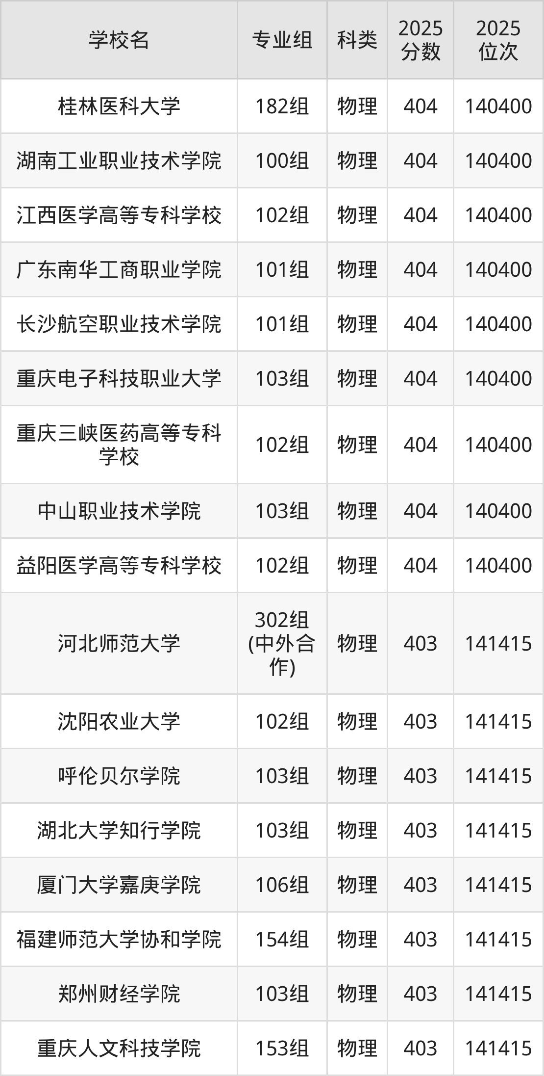 2025年在广西高考物理类录取分数线是405分的大学有忻州师范学院、锦州医科大学、通化师范学院、黑龙江八一农垦大学、大连医科大学中山学院、武汉文理学院、长江大学文理学院、湖北工程学院新技术学院、杭州电子科技大学信息工程学院、哈尔滨剑桥学院等。历史类录取分数线是405分的大学有上海杉达学院、浙江树人学院、西安外事学院、西京学院、闽南科技学院、大连财经学院、沈阳城市学院、温州医科大学仁济学院、哈尔滨广厦学院、丽江文化旅游学院等。