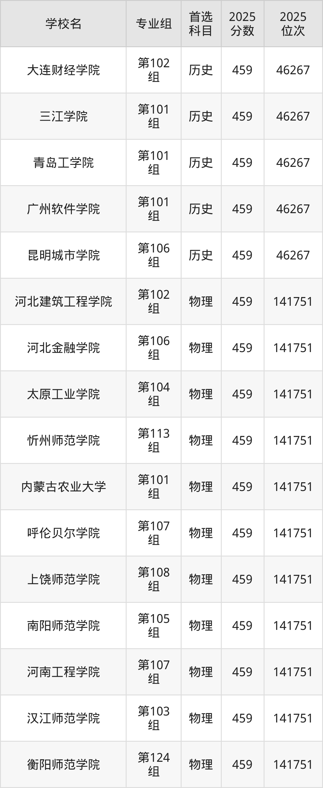 历史类457分可以冲的大学:大连财经学院459分、三江学院459分、青岛工学院459分、广州软件学院459分等;较稳妥的大学:怀化学院456分、广州城市理工学院456分、广东科技学院456分、江西电力职业技术学院456分等。