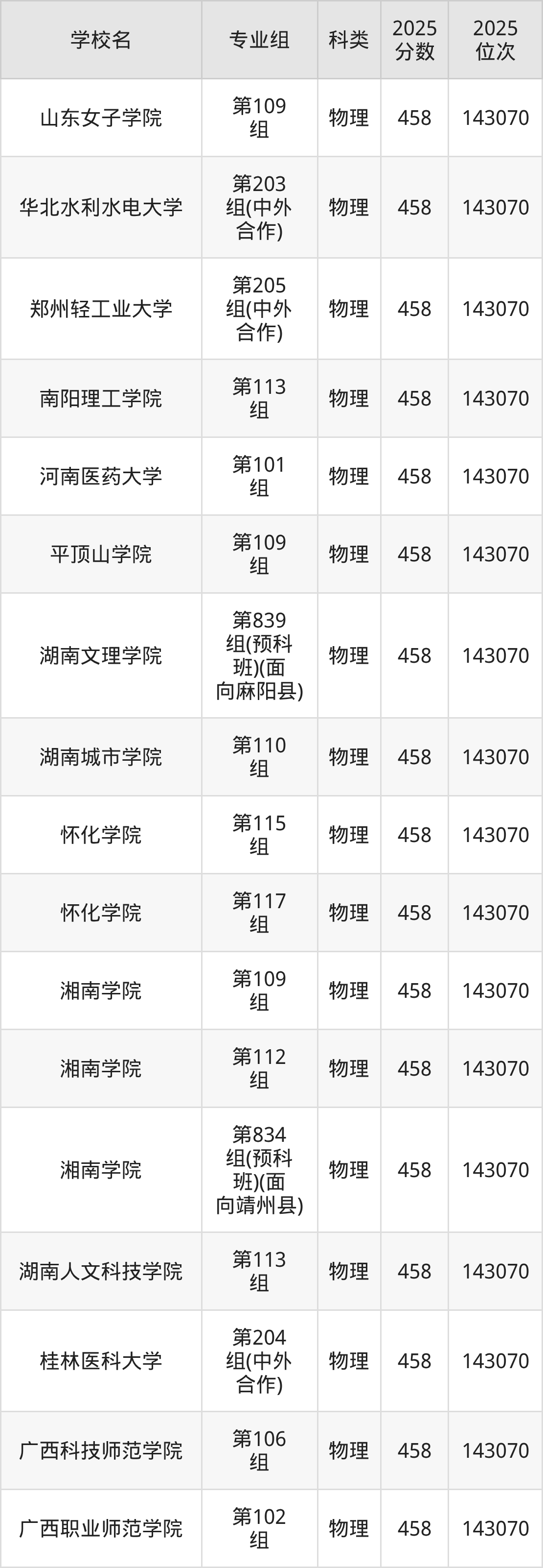2025年在湖南高考物理类录取分数线是457分的大学有廊坊师范学院、河北环境工程学院、忻州师范学院、内蒙古科技大学、沈阳大学、鞍山师范学院、沈阳体育学院、吉林化工大学、南京理工大学紫金学院、浙江万里学院等。历史类录取分数线是457分的大学有上海杉达学院、江西科技学院、上海民航职业技术学院、重庆电力高等专科学校、四川交通职业技术学院。