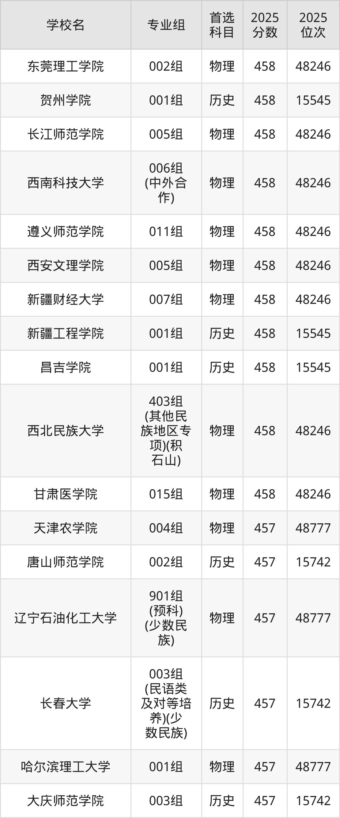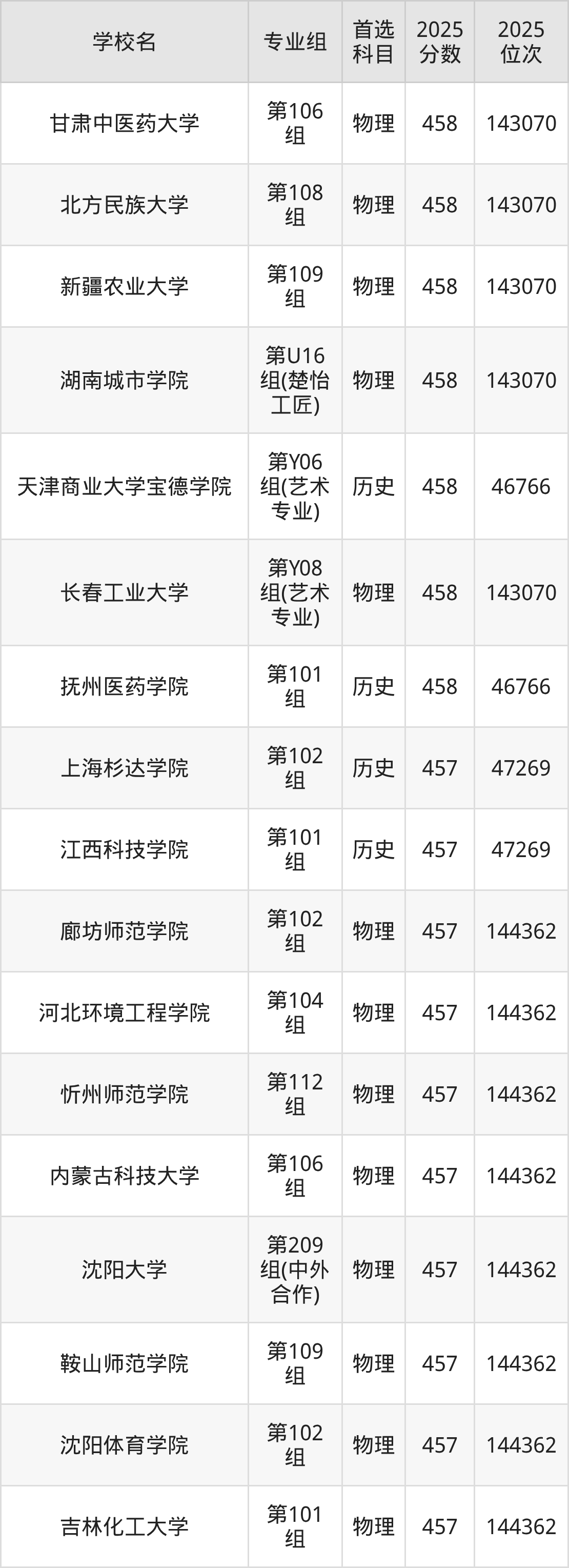 历史类457分可以冲的大学:黑龙江工业学院459分、信阳农林学院459分、肇庆学院459分、百色学院459分等;较稳妥的大学:北华航天工业学院456分、太原学院456分、绥化学院456分、黑河学院456分等。