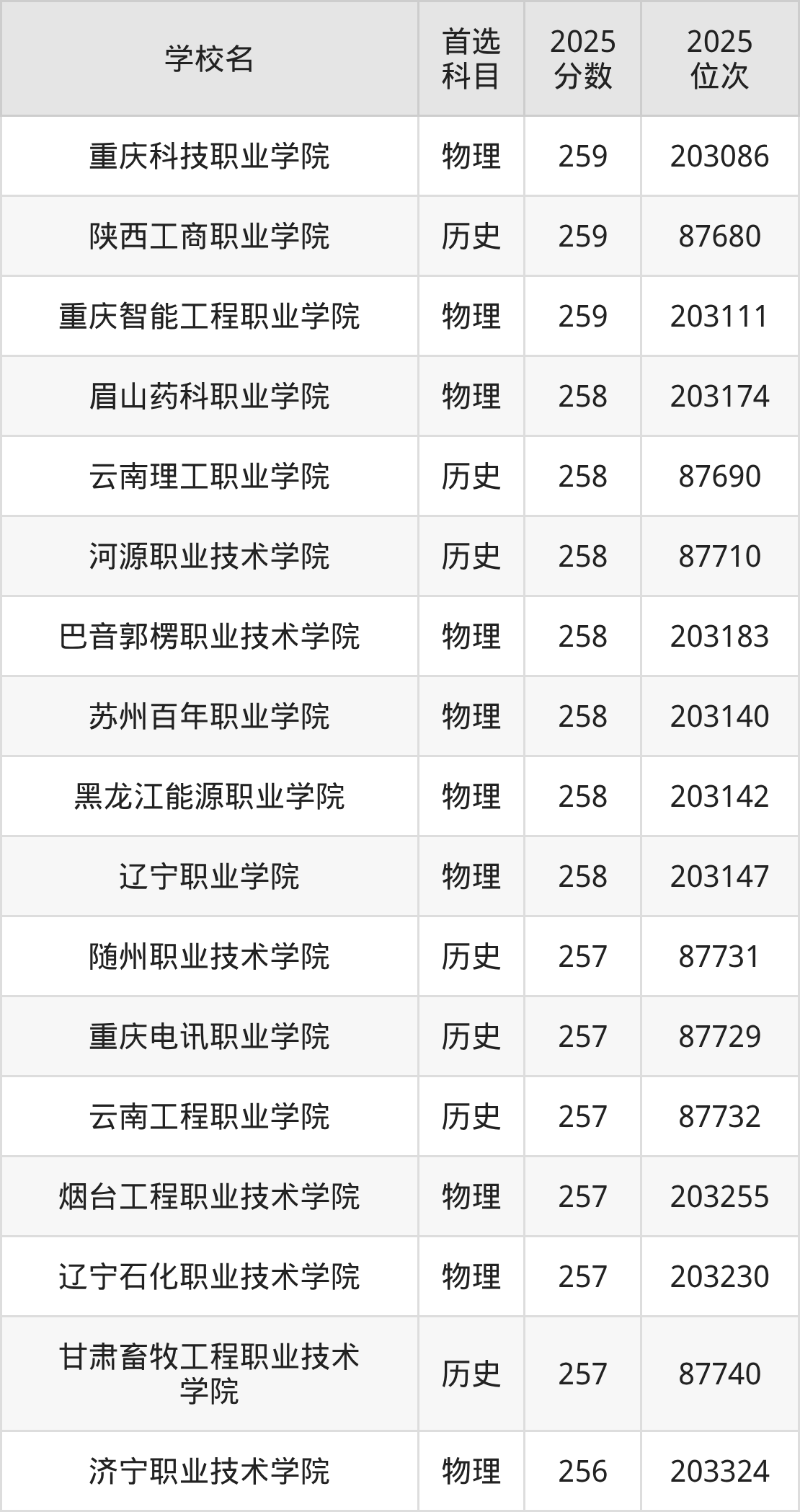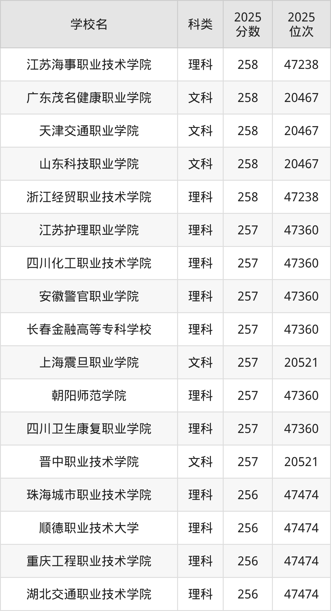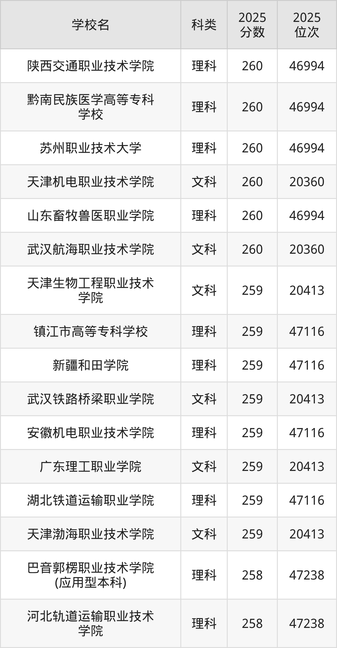 2026年高考258分可以报考的大学有巴音郭楞职业技术学院(应用型本科)、河北轨道运输职业技术学院、江苏海事职业技术学院、广东茂名健康职业学院、天津交通职业学院等。258分能上的大学名单因省而异,下面为大家展示,2026届考生请查阅。