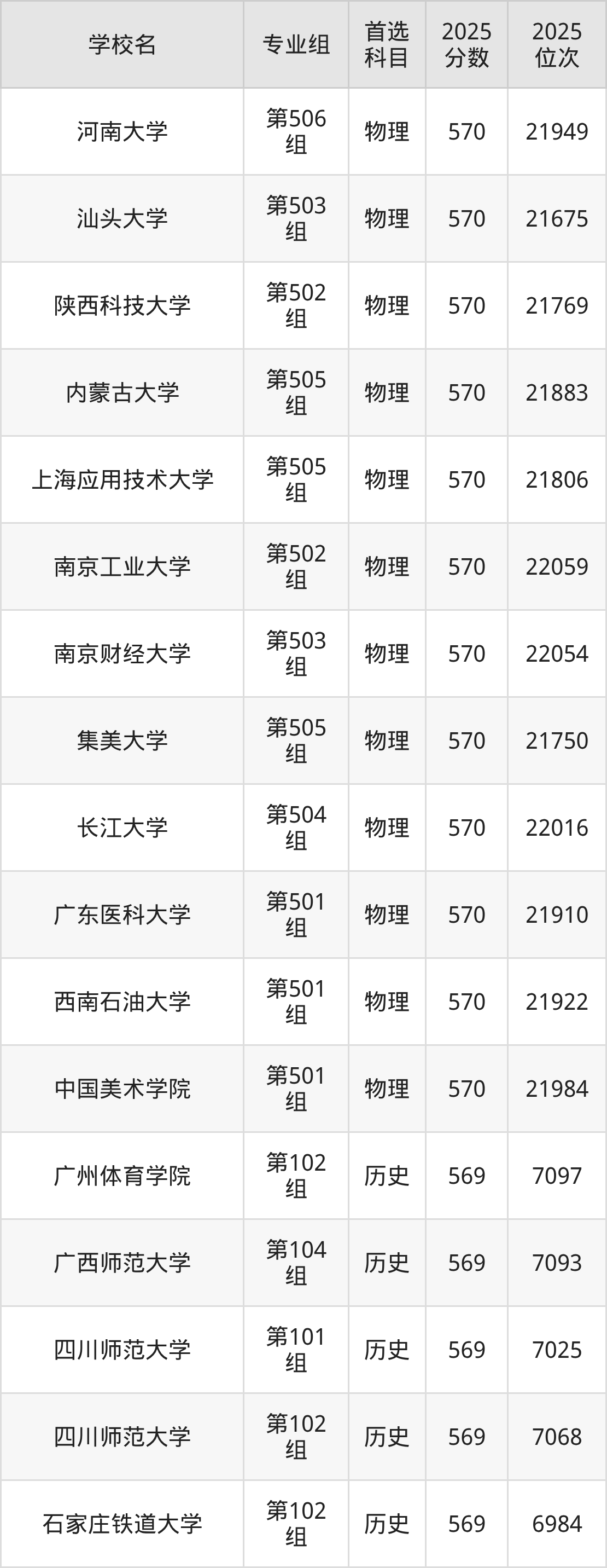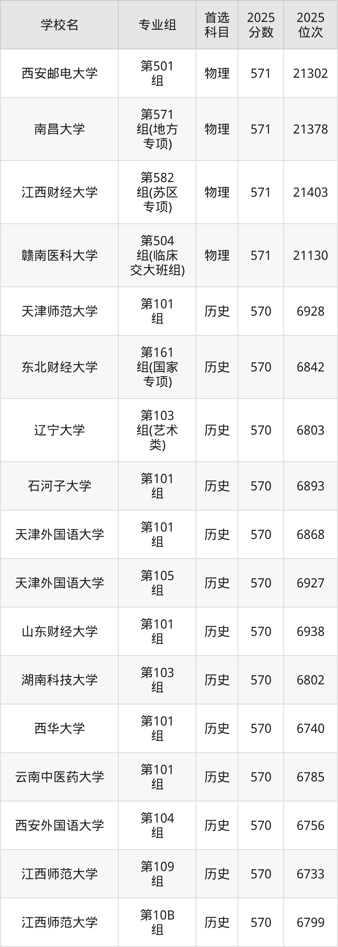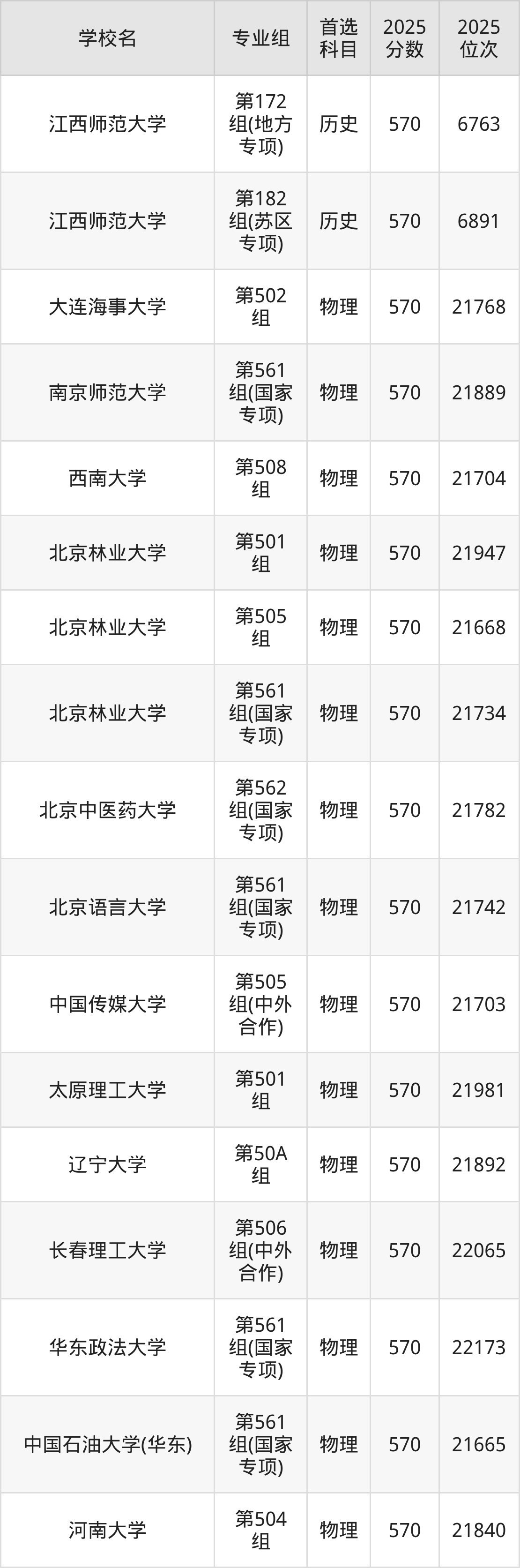 江西高考历史类570分对应的位次排名是6733名-6938名,物理类570分对应的位次排名是21665名-22173名,因此建议2026年位次排在这附近的同学考虑这些大学。