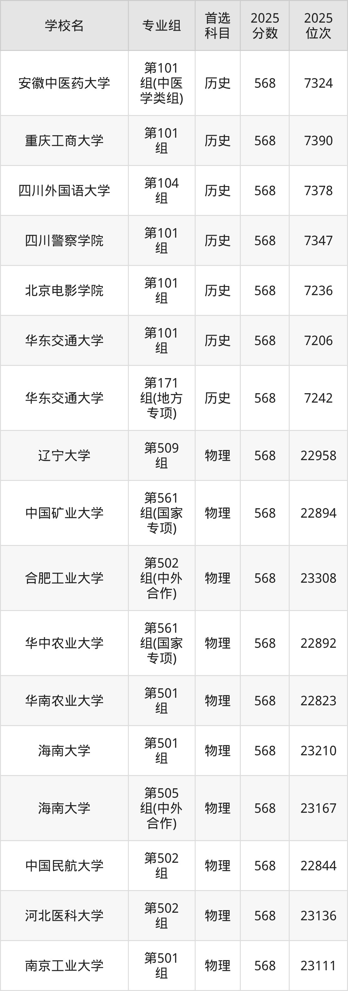 2025年在江西高考历史类录取分数线是570分的大学有天津师范大学、东北财经大学、辽宁大学、石河子大学、天津外国语大学、山东财经大学、湖南科技大学、西华大学、云南中医药大学、西安外国语大学等。物理类录取分数线是570分的大学有大连海事大学、南京师范大学、西南大学、北京林业大学、北京中医药大学、北京语言大学、中国传媒大学、太原理工大学、辽宁大学、长春理工大学等。