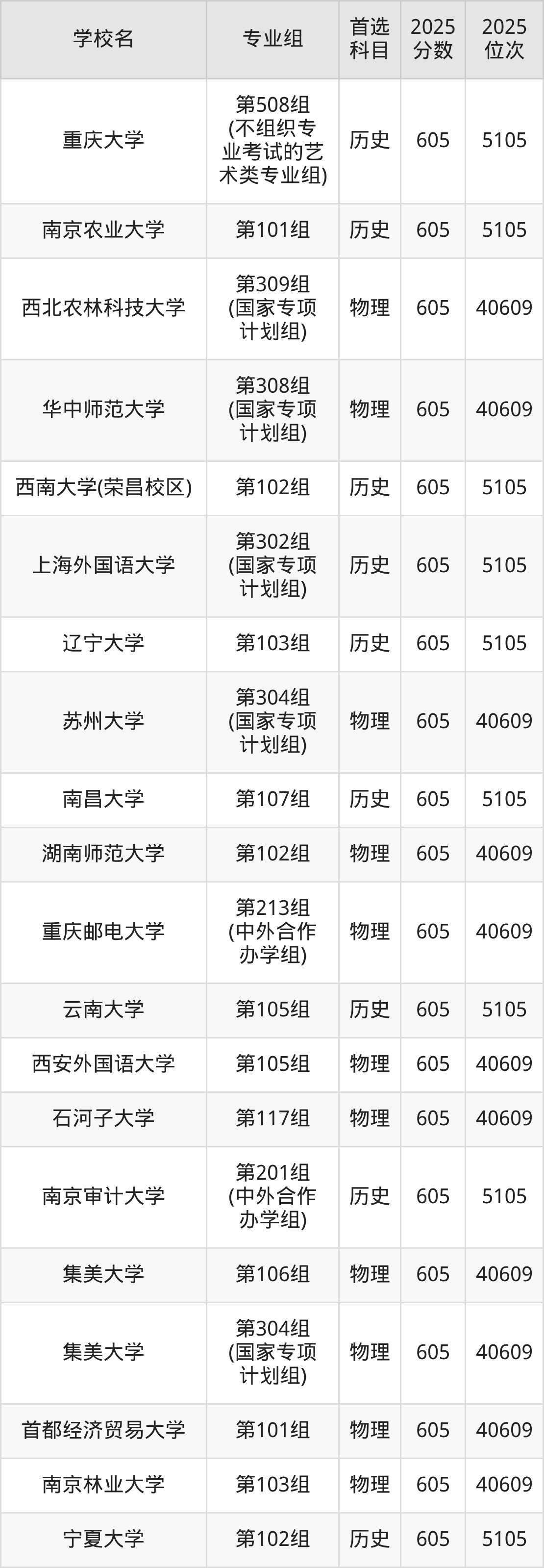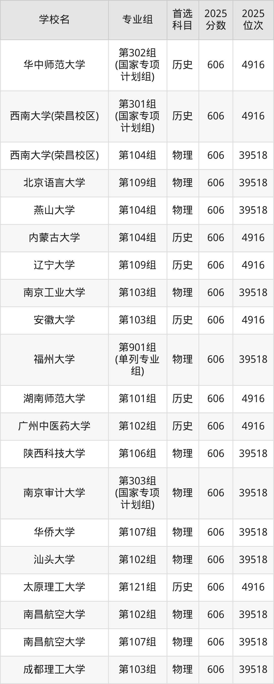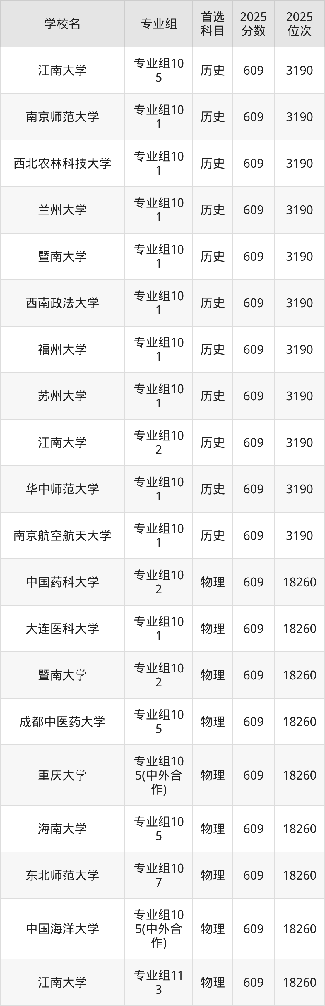 历史类607分可以冲的大学:西南交通大学609分、中国地质大学(武汉)609分、南京农业大学609分、陕西师范大学609分等;较稳妥的大学:大连海事大学606分、中国地质大学(武汉)606分、华中师范大学606分、西南大学(荣昌校区)606分等。