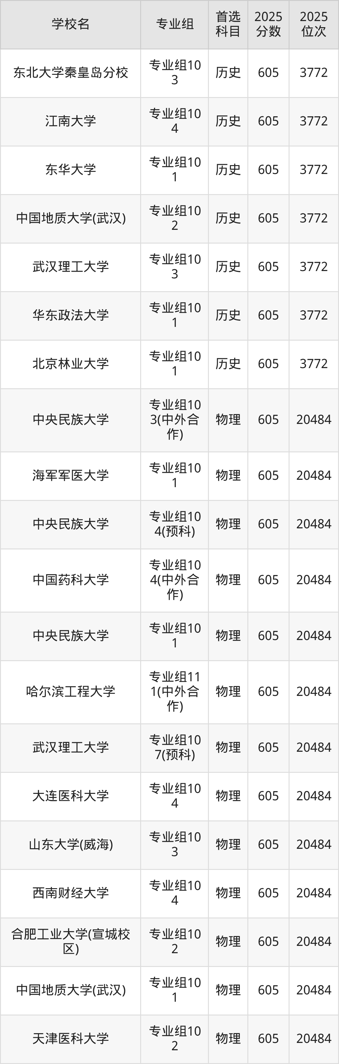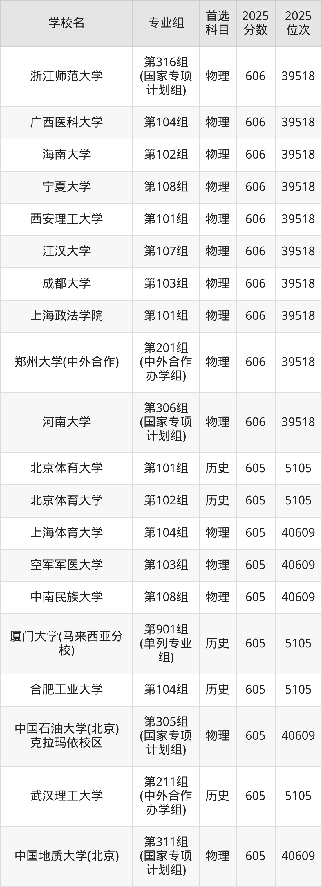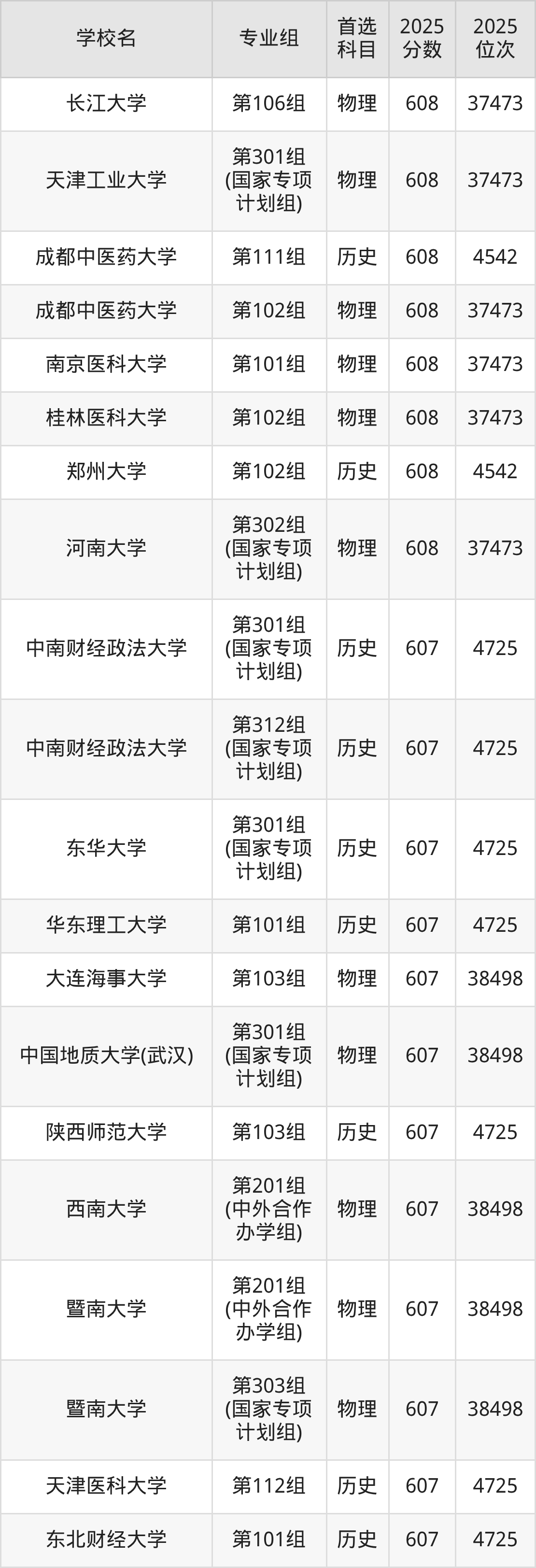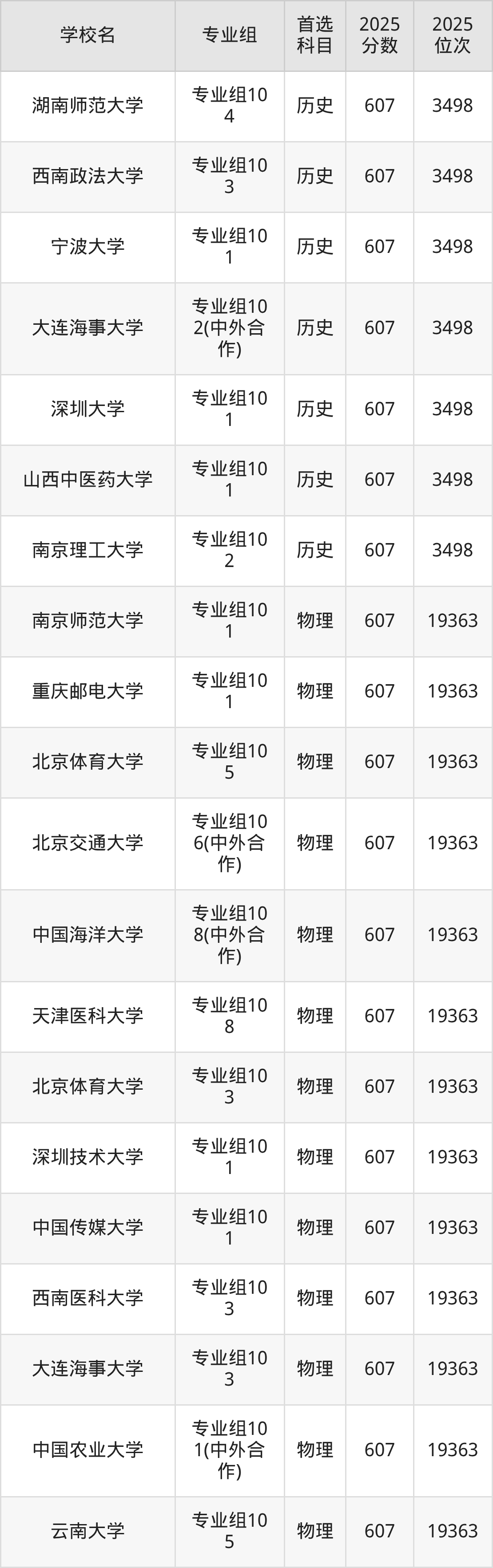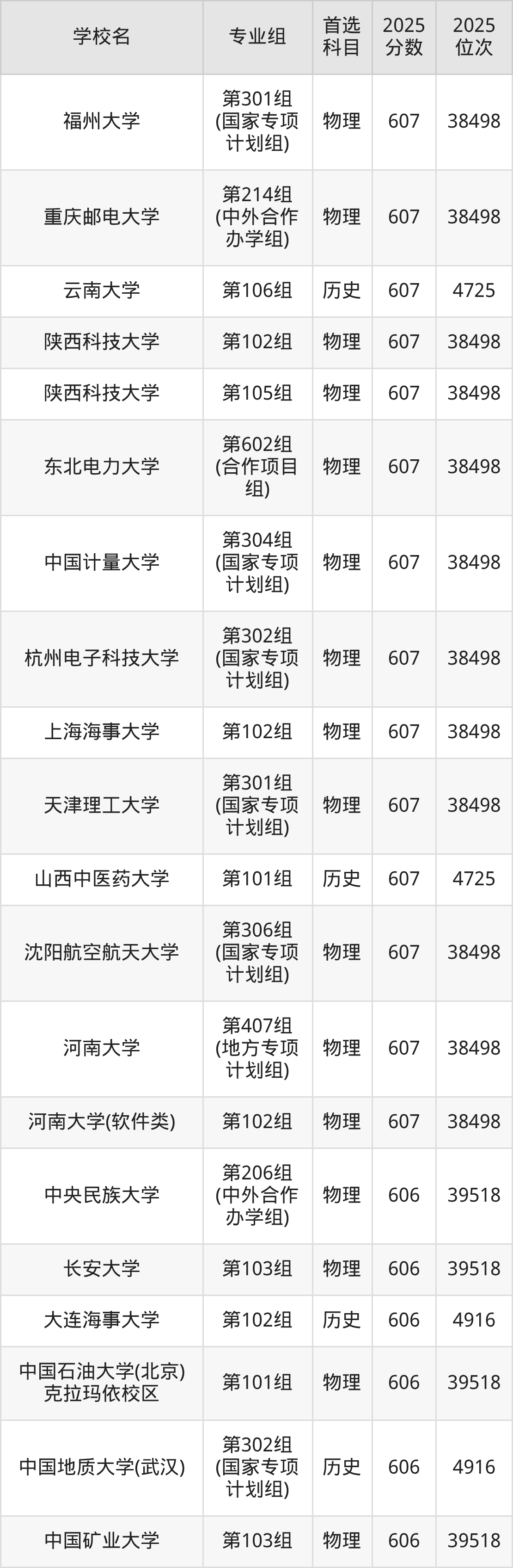 河南高考历史类607分对应的位次排名是4725名,物理类607分对应的位次排名是38498名,因此建议2026年位次排在这附近的同学考虑这些大学。