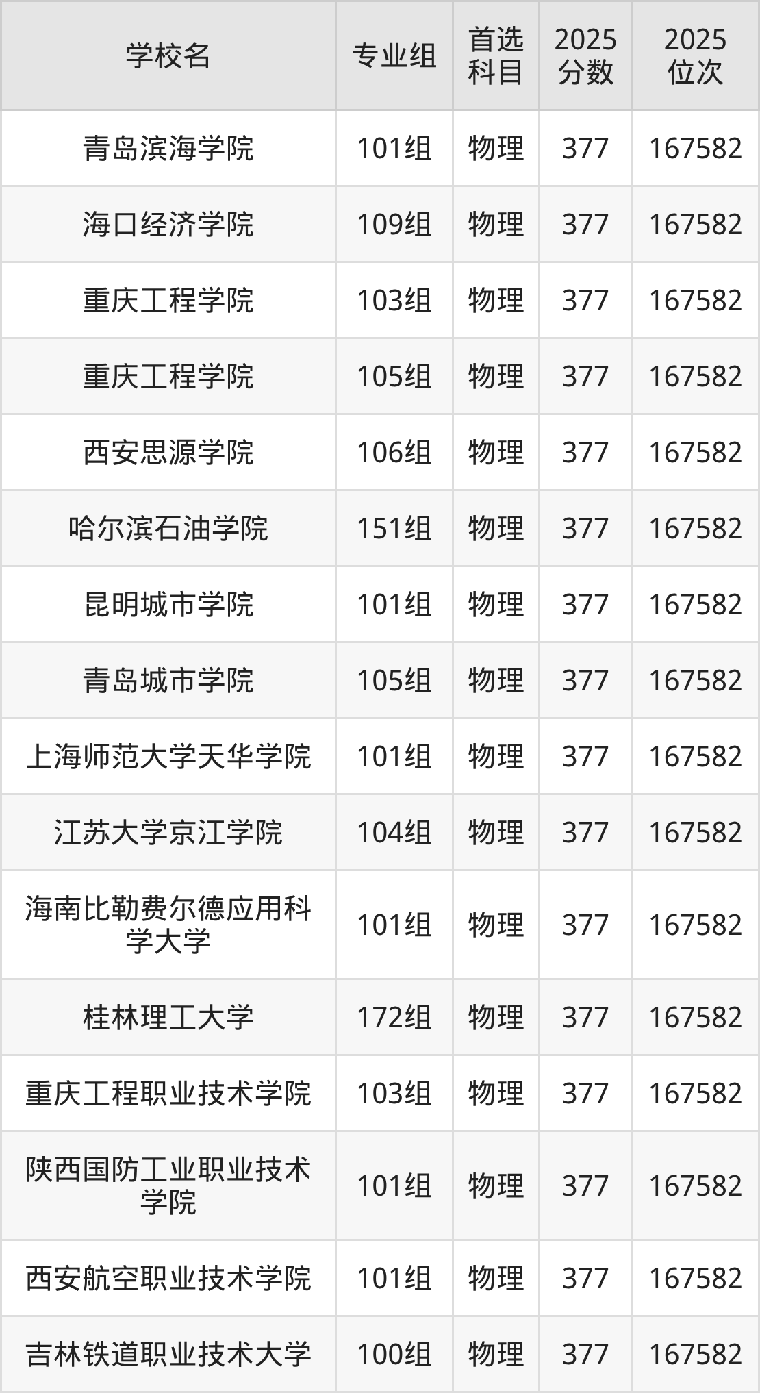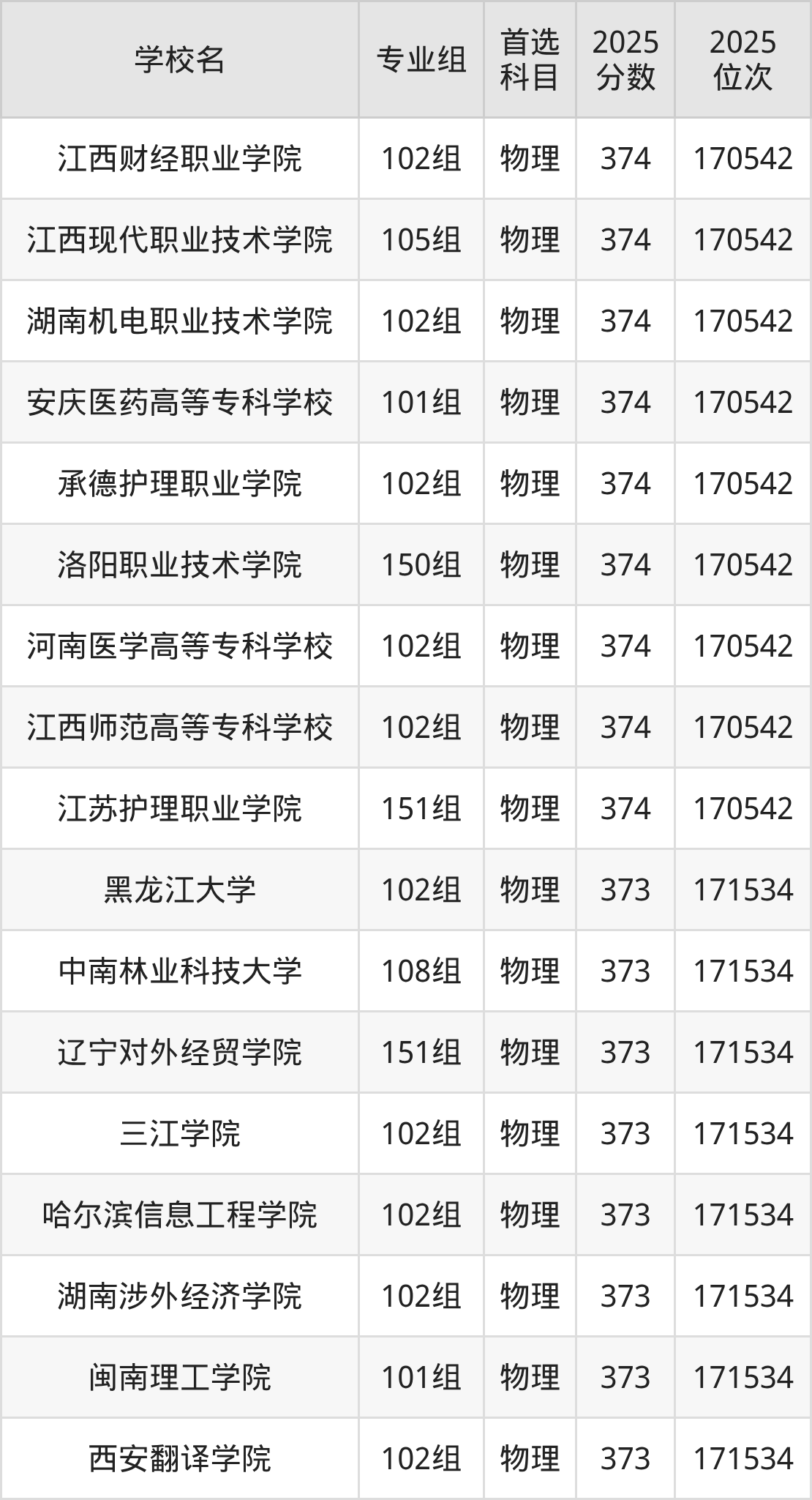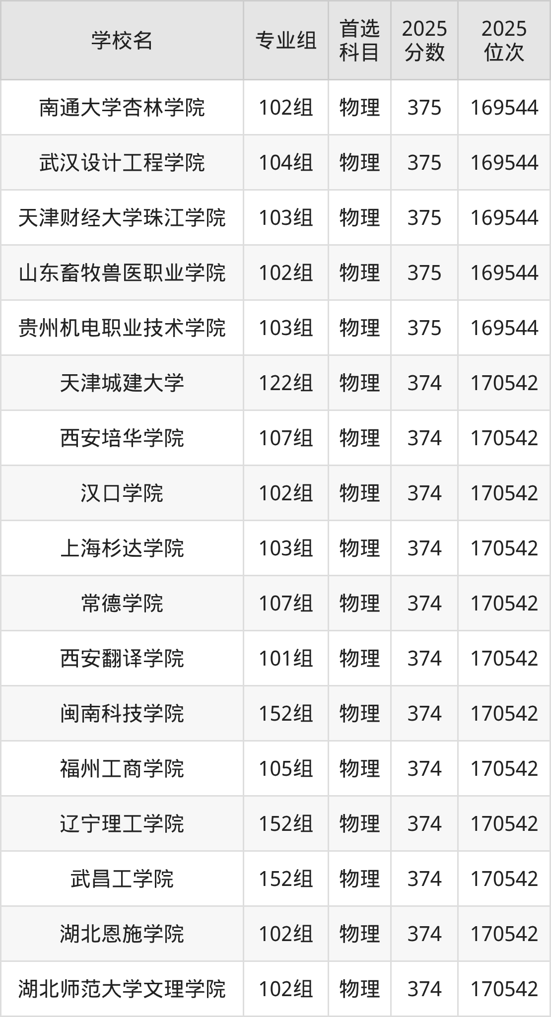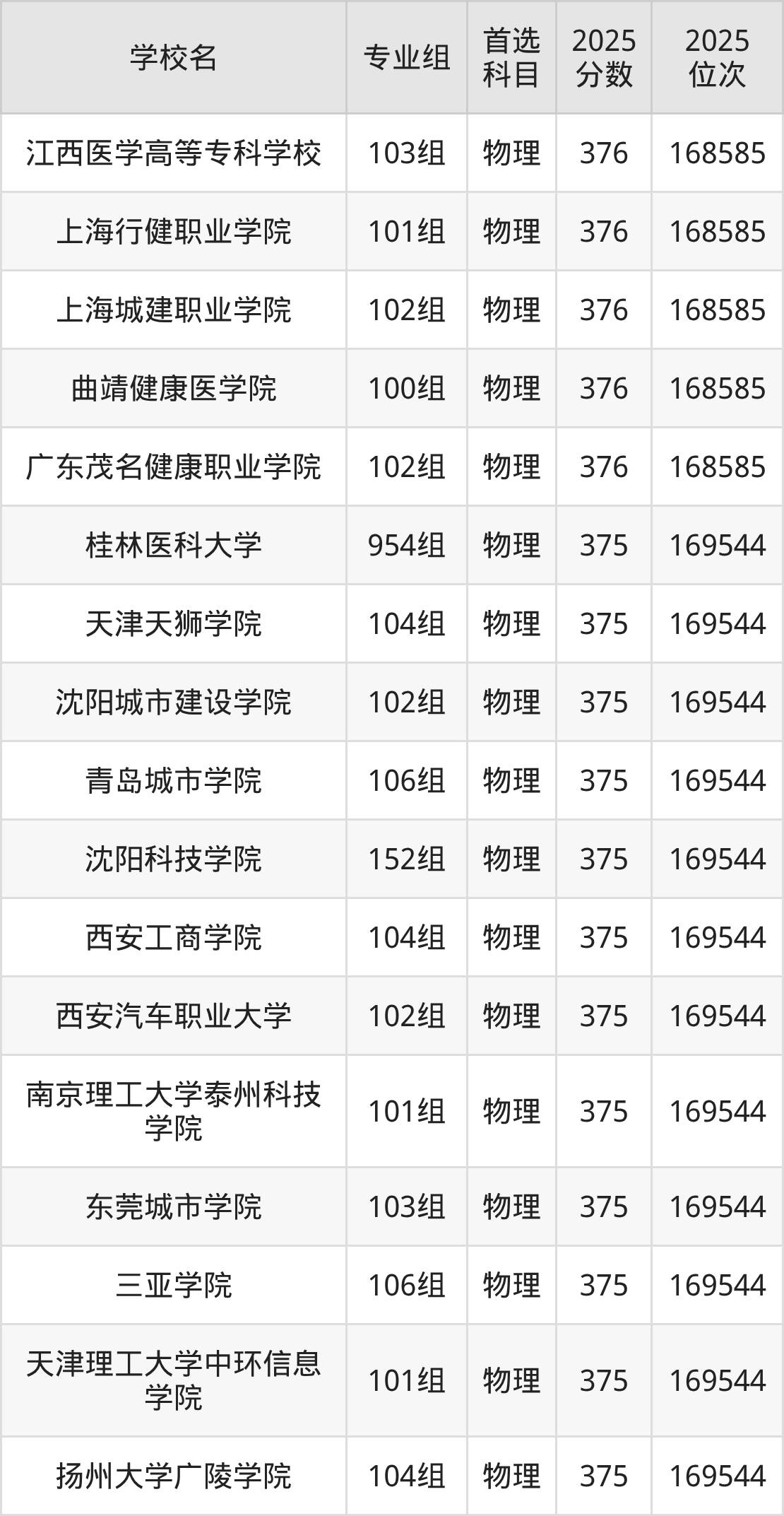 广西物理类375分对应的位次排名是169544名,因此建议2026年位次排在这附近的考生考虑这些大学。