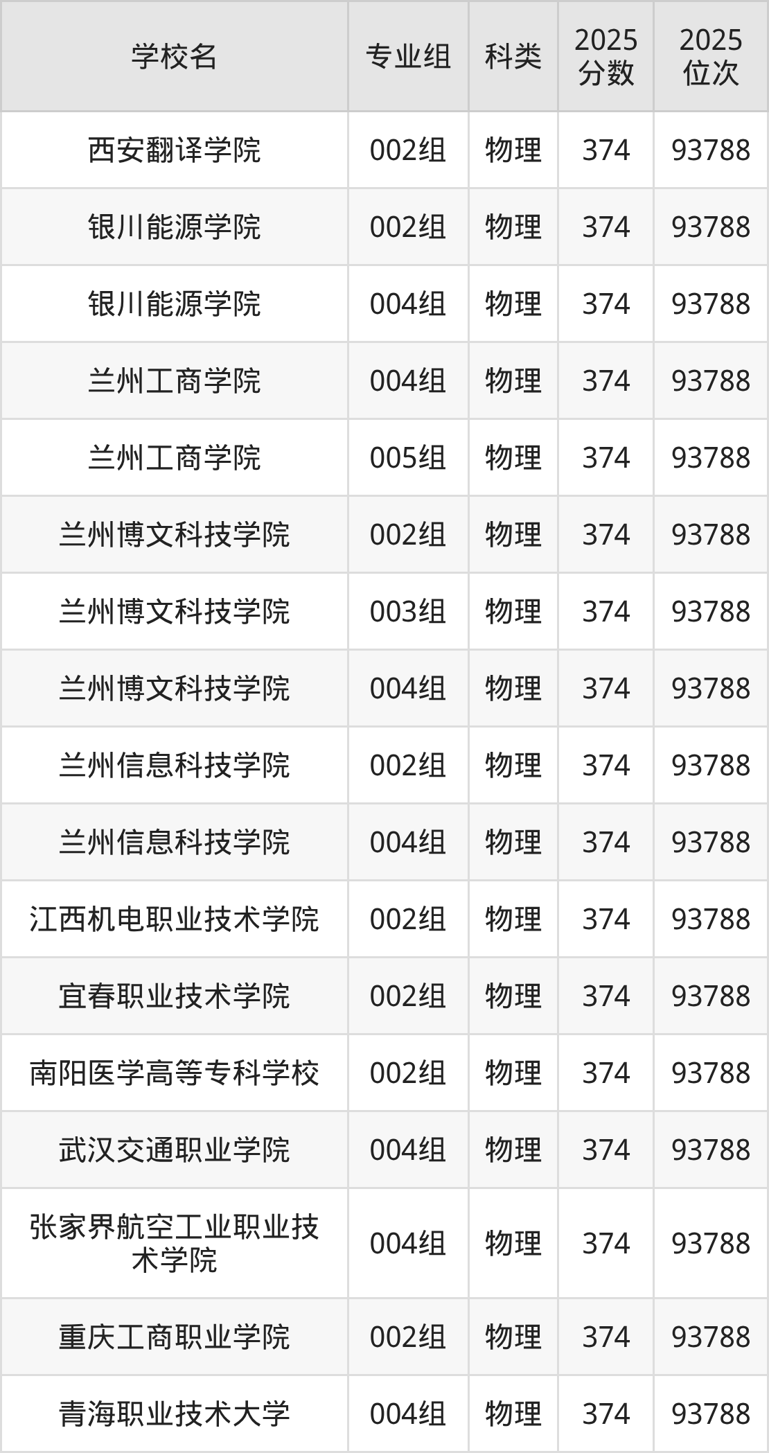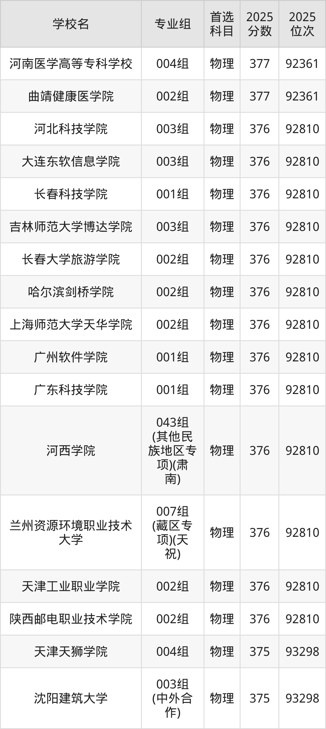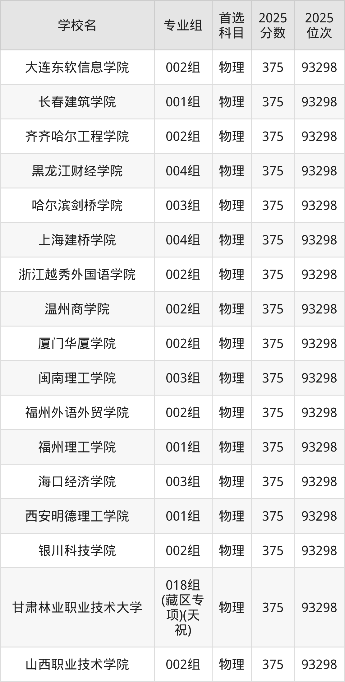 甘肃物理类375分对应的位次排名是93298名,因此建议2026年位次排在这附近的考生考虑这些大学。