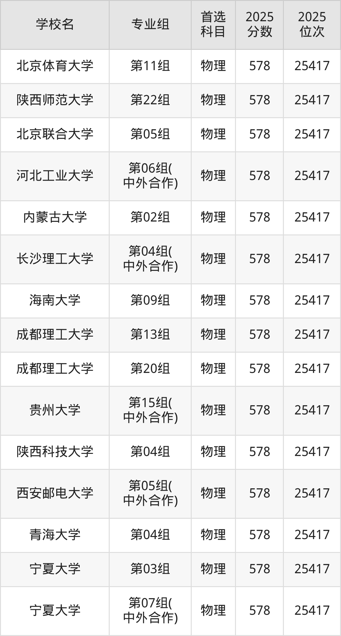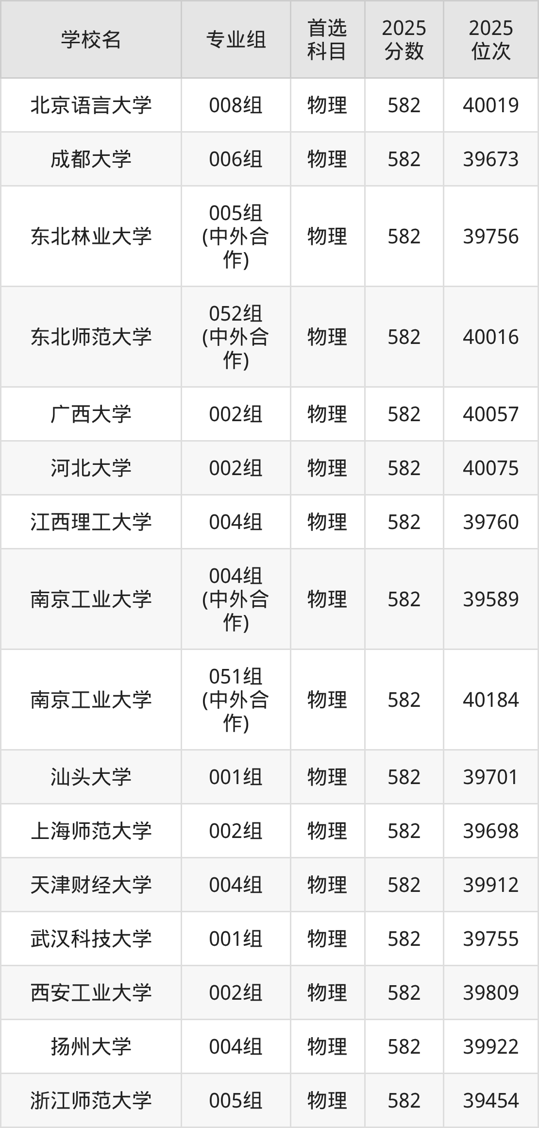 物理类580分可以冲的大学:北京化工大学582分、北京语言大学582分、北京体育大学582分、上海外国语大学582分等;较稳妥的大学:北京林业大学579分、北京中医药大学579分、东北师范大学579分、湖北大学579分等。