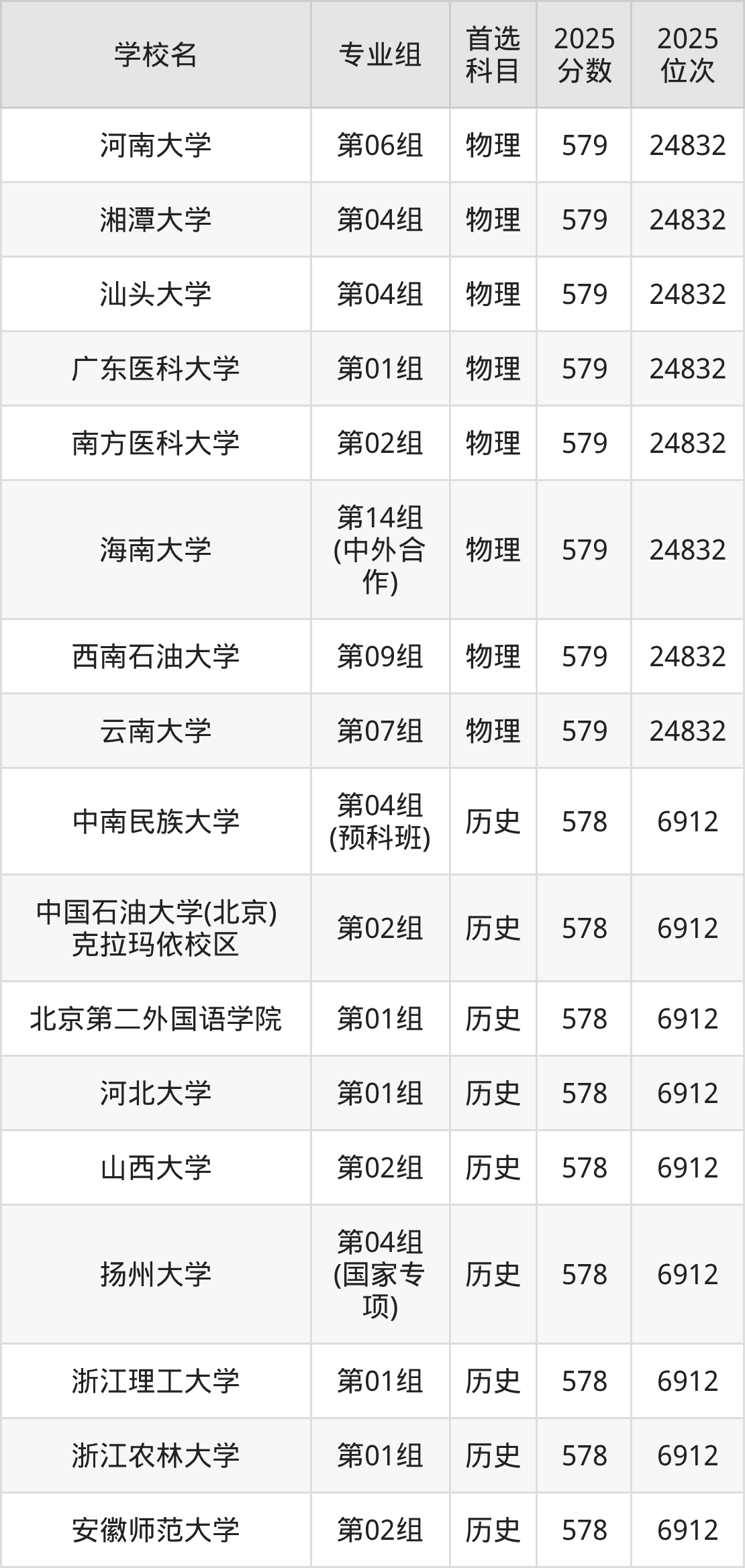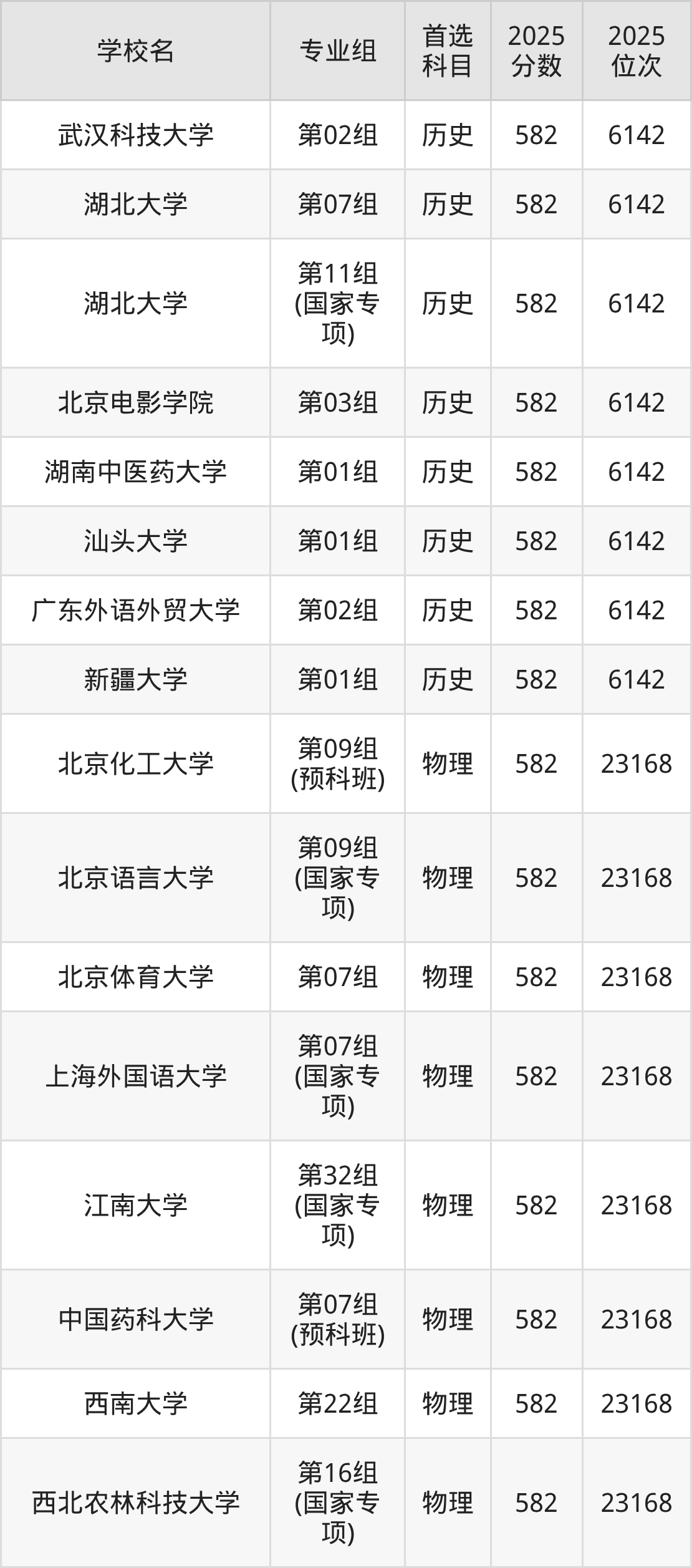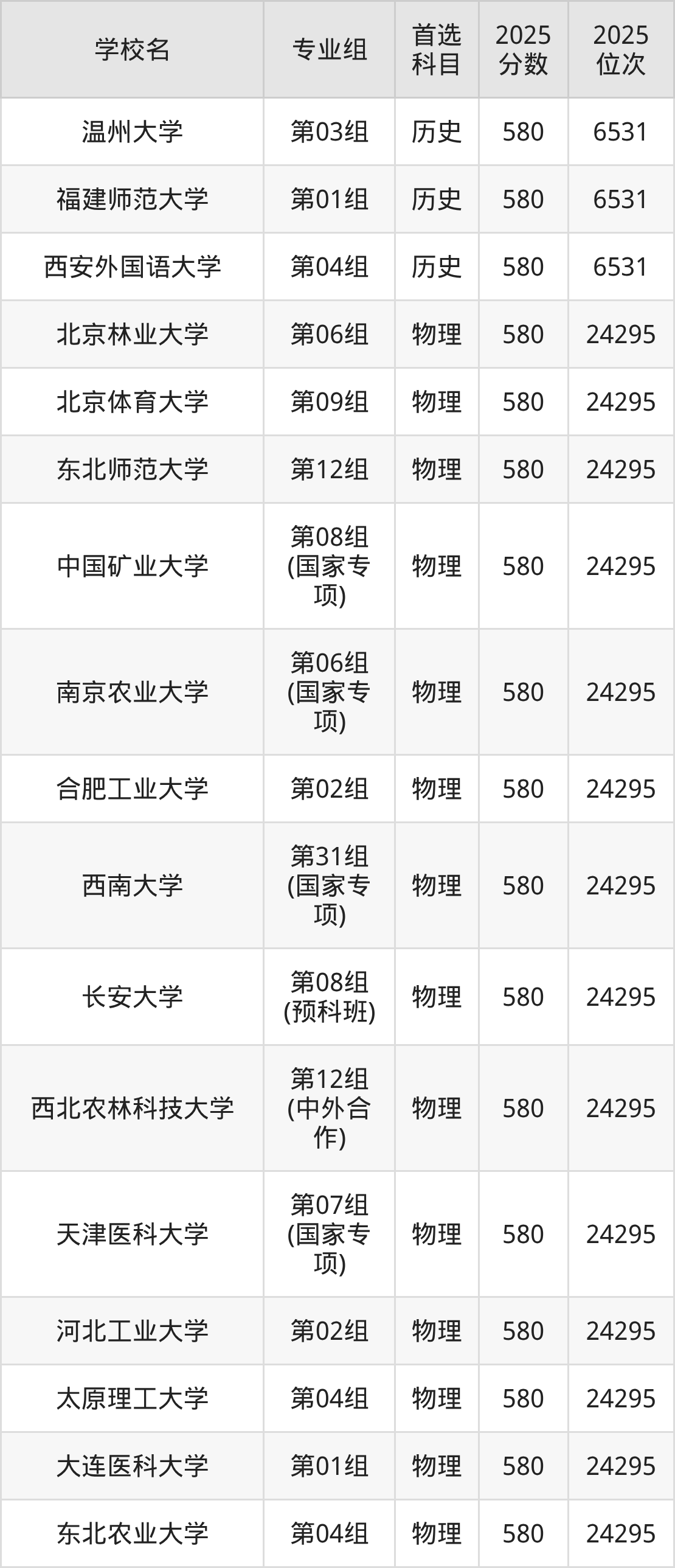 2025年在湖北高考历史类录取分数线是580分的大学有湖北大学、北京联合大学、天津中医药大学、天津师范大学、上海师范大学、南京工业大学、苏州科技大学、温州大学、福建师范大学、西安外国语大学。物理类录取分数线是580分的大学有北京林业大学、北京体育大学、东北师范大学、中国矿业大学、南京农业大学、合肥工业大学、西南大学、长安大学、西北农林科技大学、天津医科大学等。