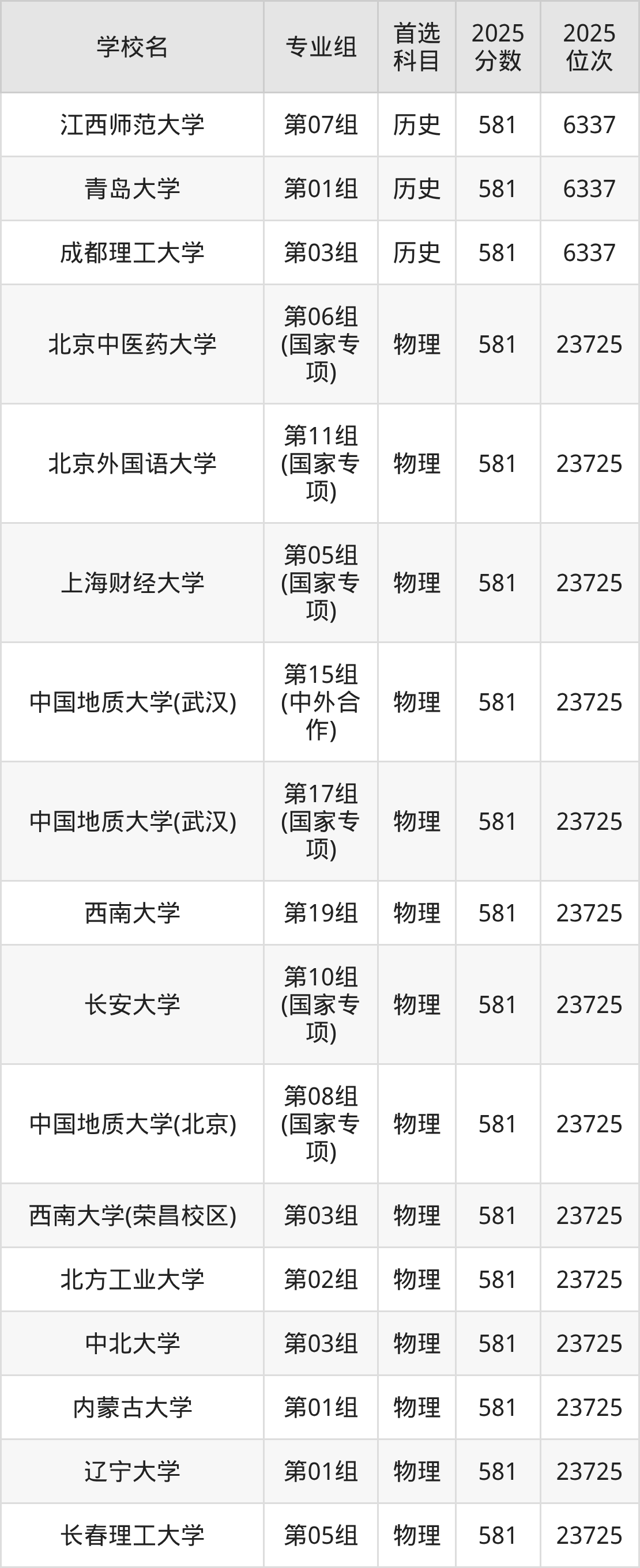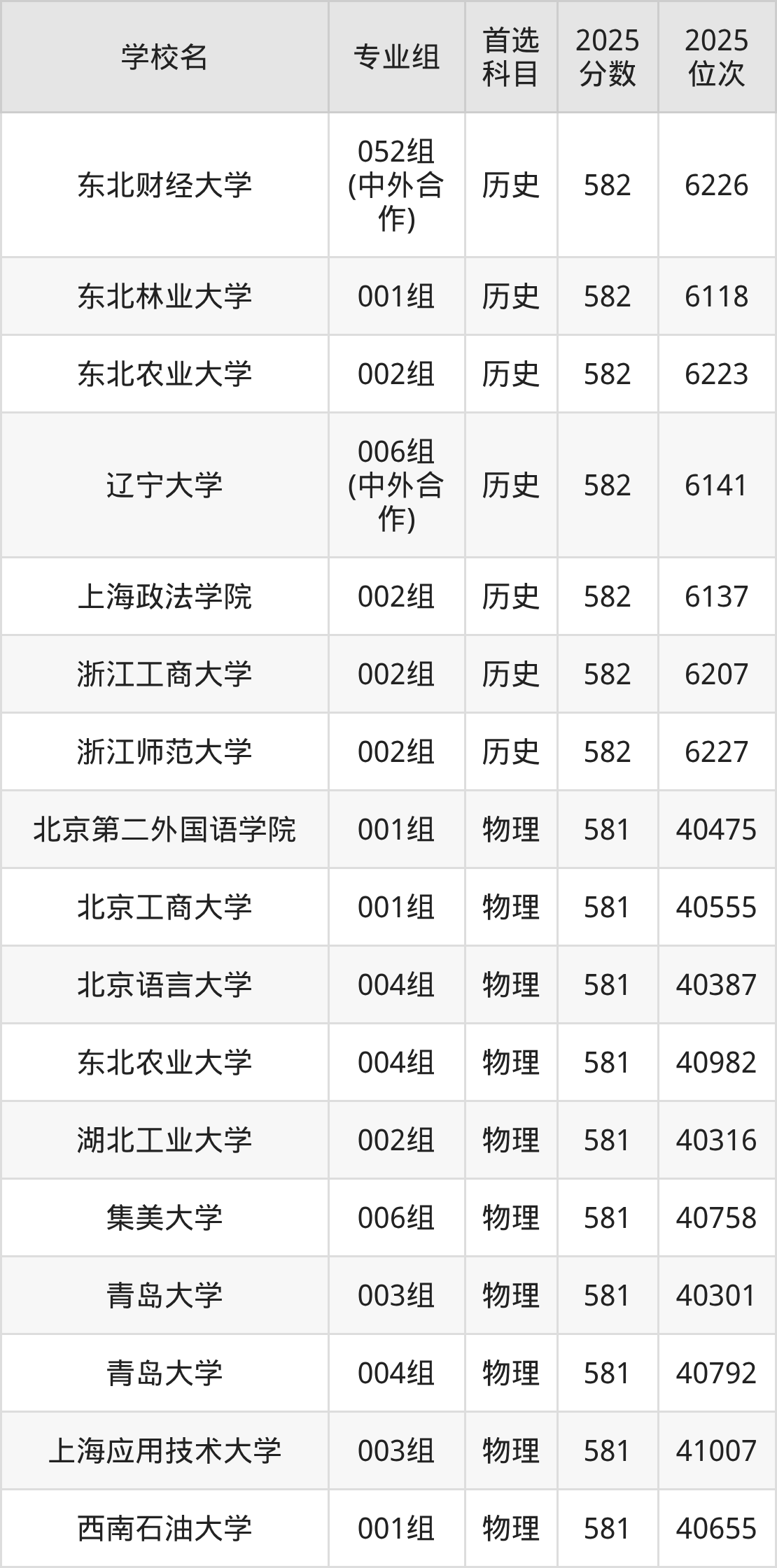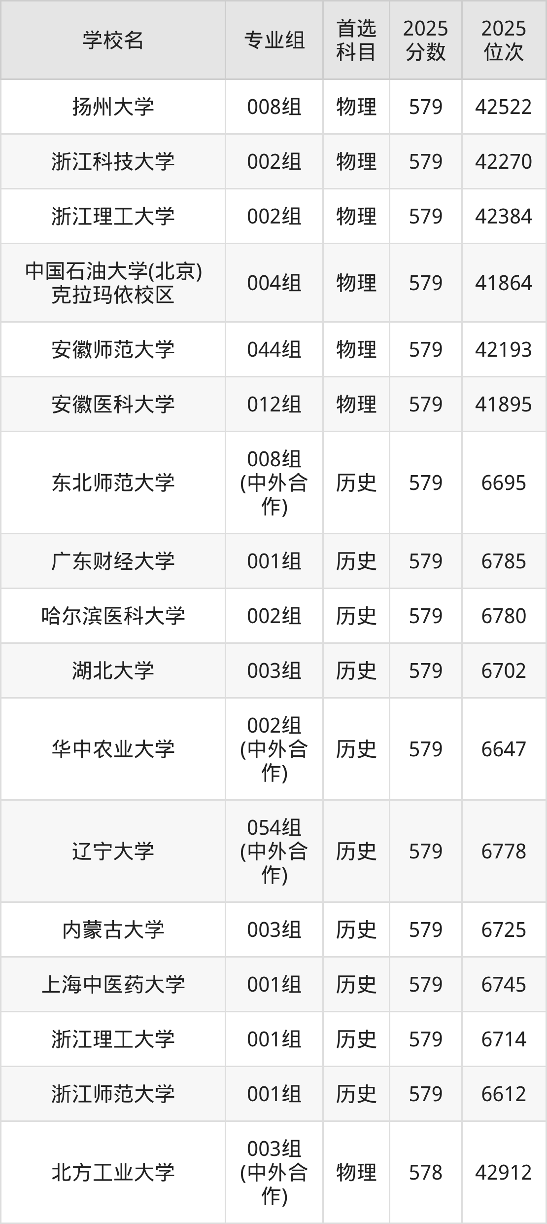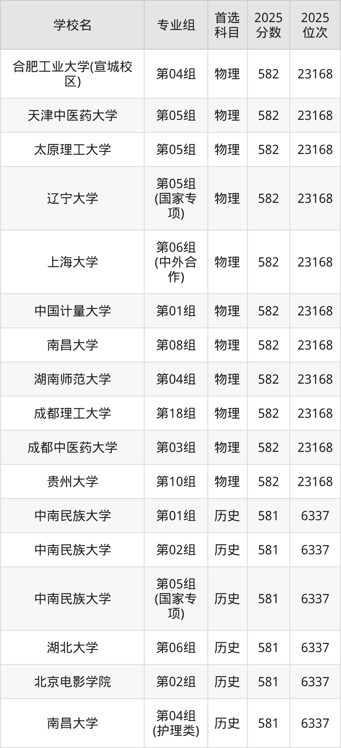 2025年在湖北高考历史类录取分数线是580分的大学有湖北大学、北京联合大学、天津中医药大学、天津师范大学、上海师范大学、南京工业大学、苏州科技大学、温州大学、福建师范大学、西安外国语大学。物理类录取分数线是580分的大学有北京林业大学、北京体育大学、东北师范大学、中国矿业大学、南京农业大学、合肥工业大学、西南大学、长安大学、西北农林科技大学、天津医科大学等。