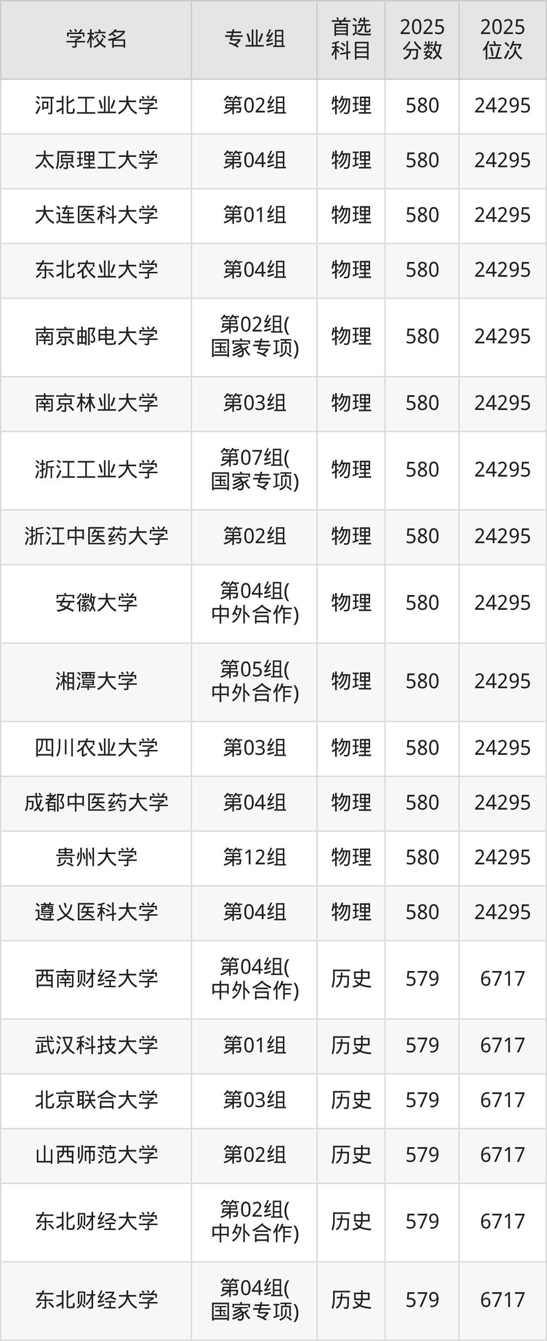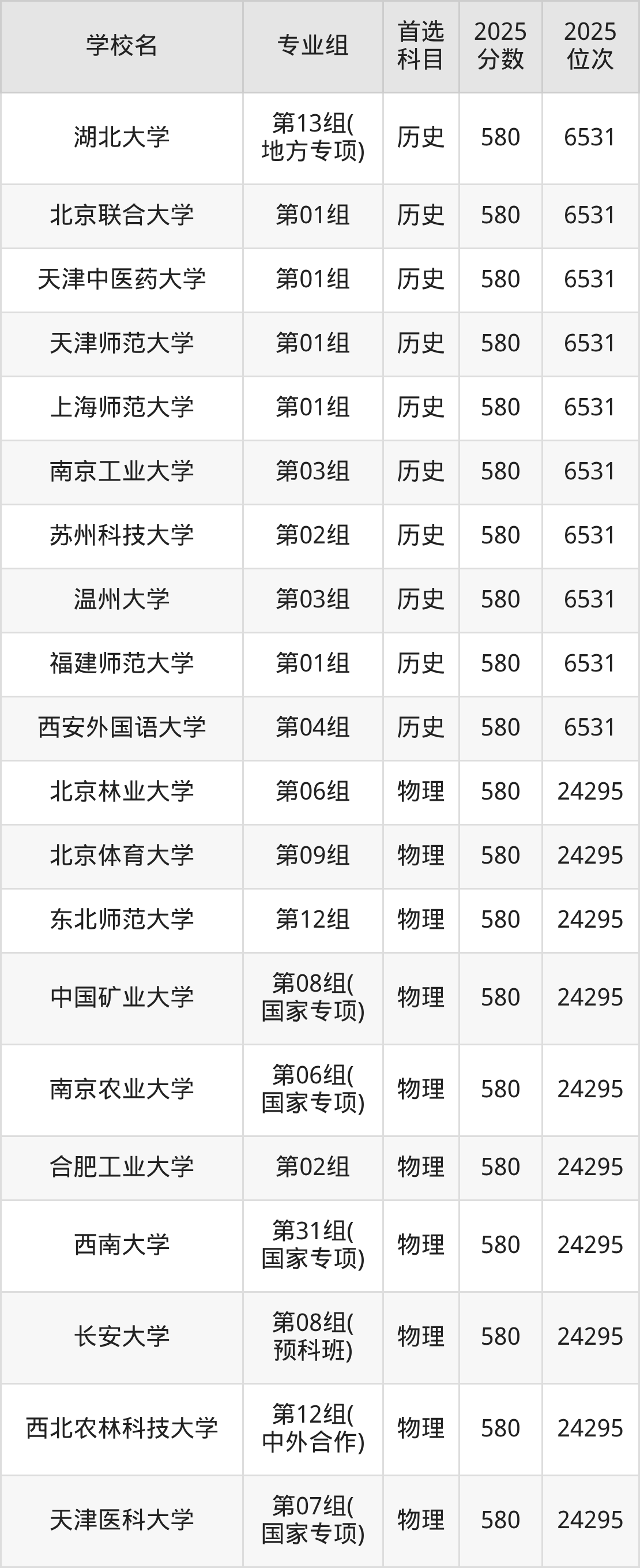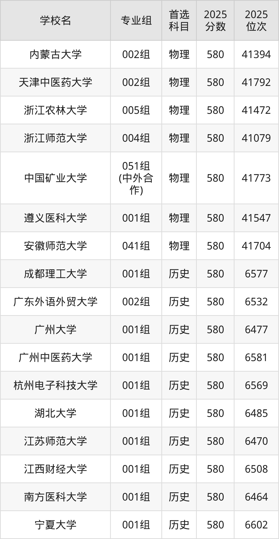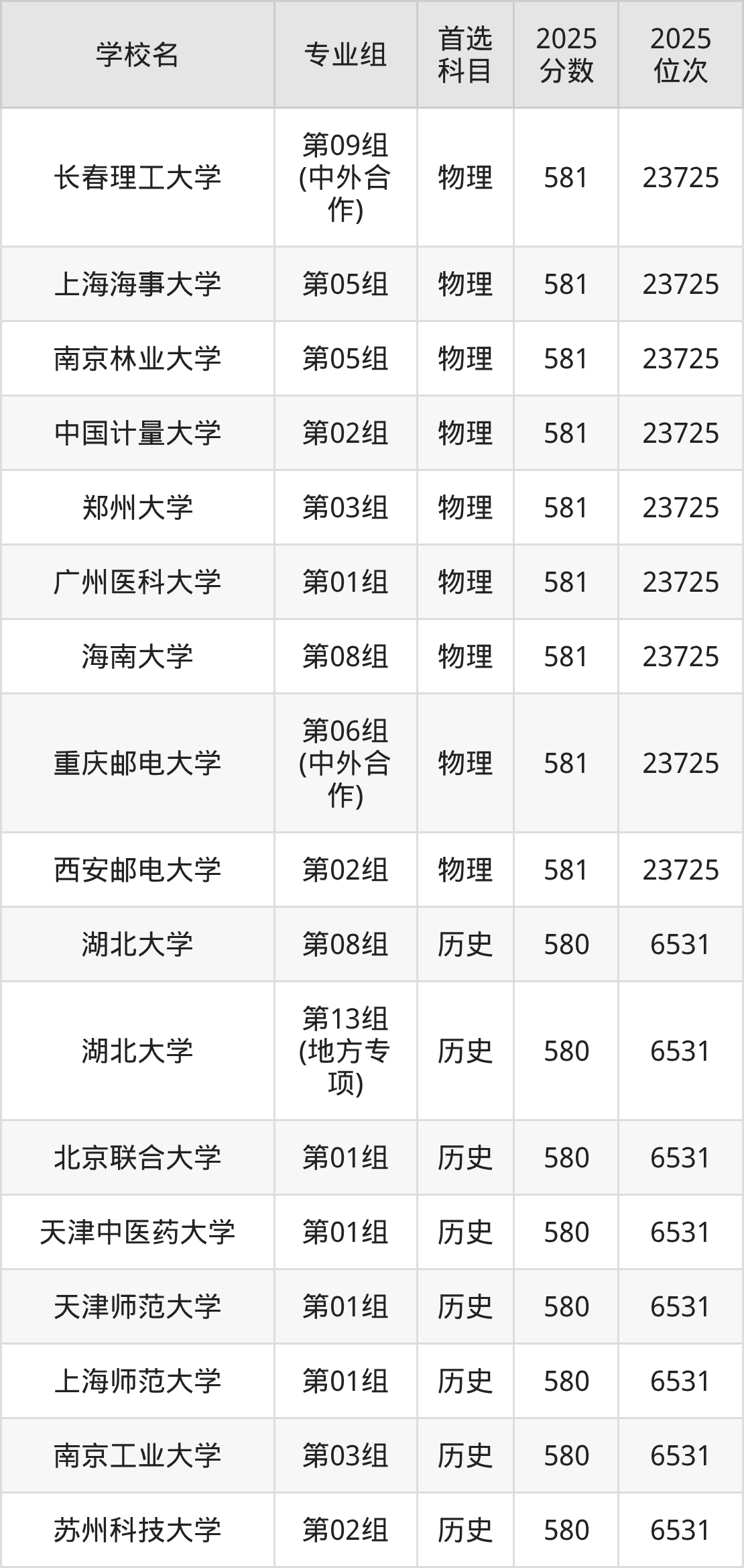 湖北高考历史类580分对应的位次排名是6531名,物理类580分对应的位次排名是24295名,因此建议2026年位次排在这附近的同学考虑这些大学。