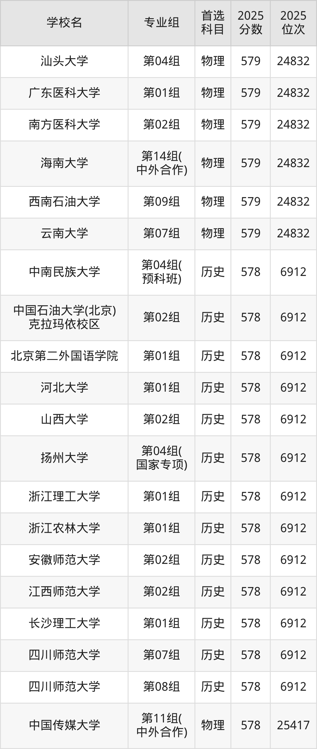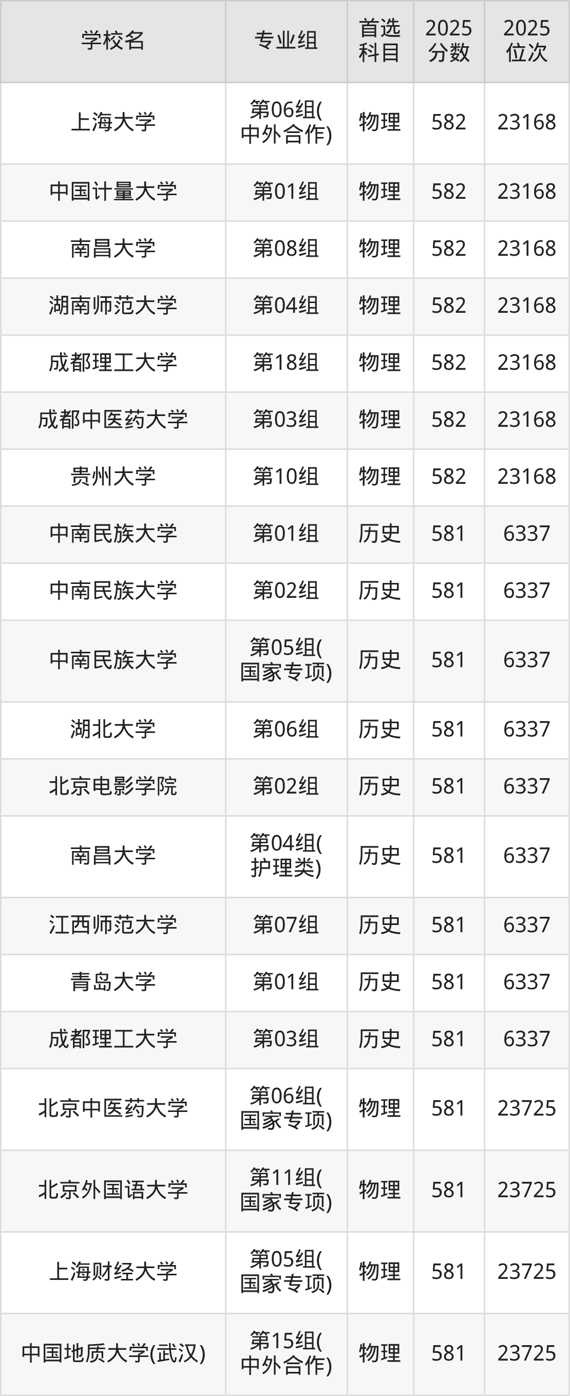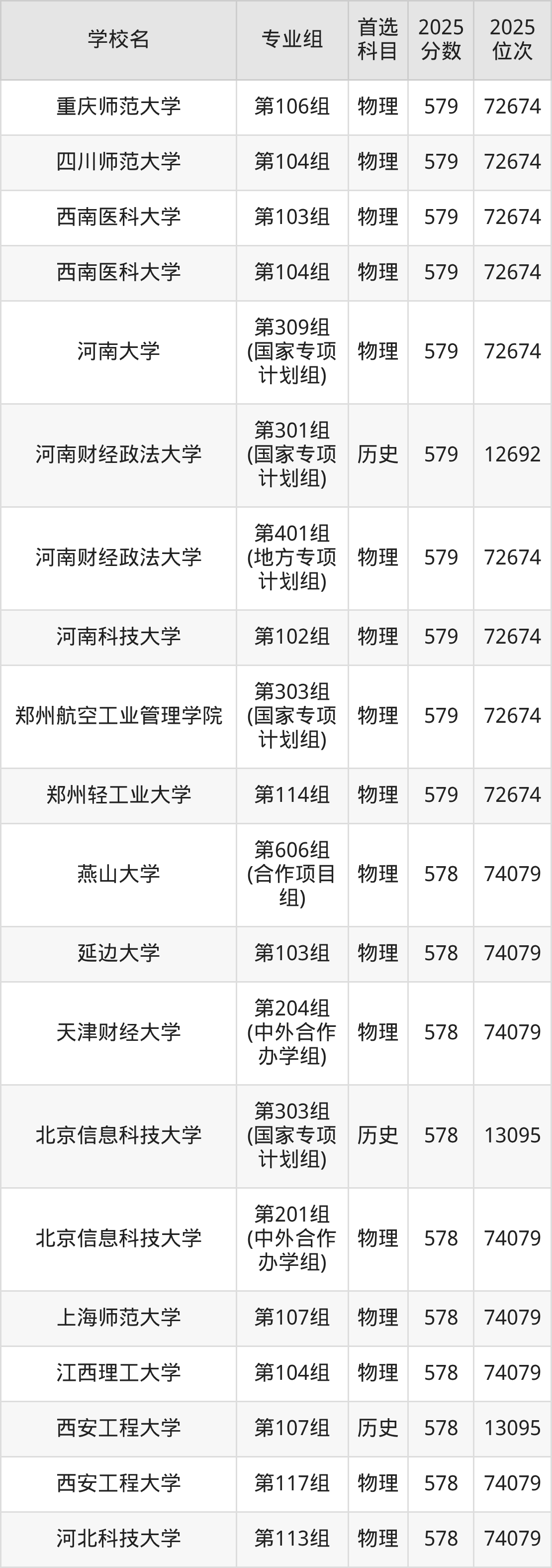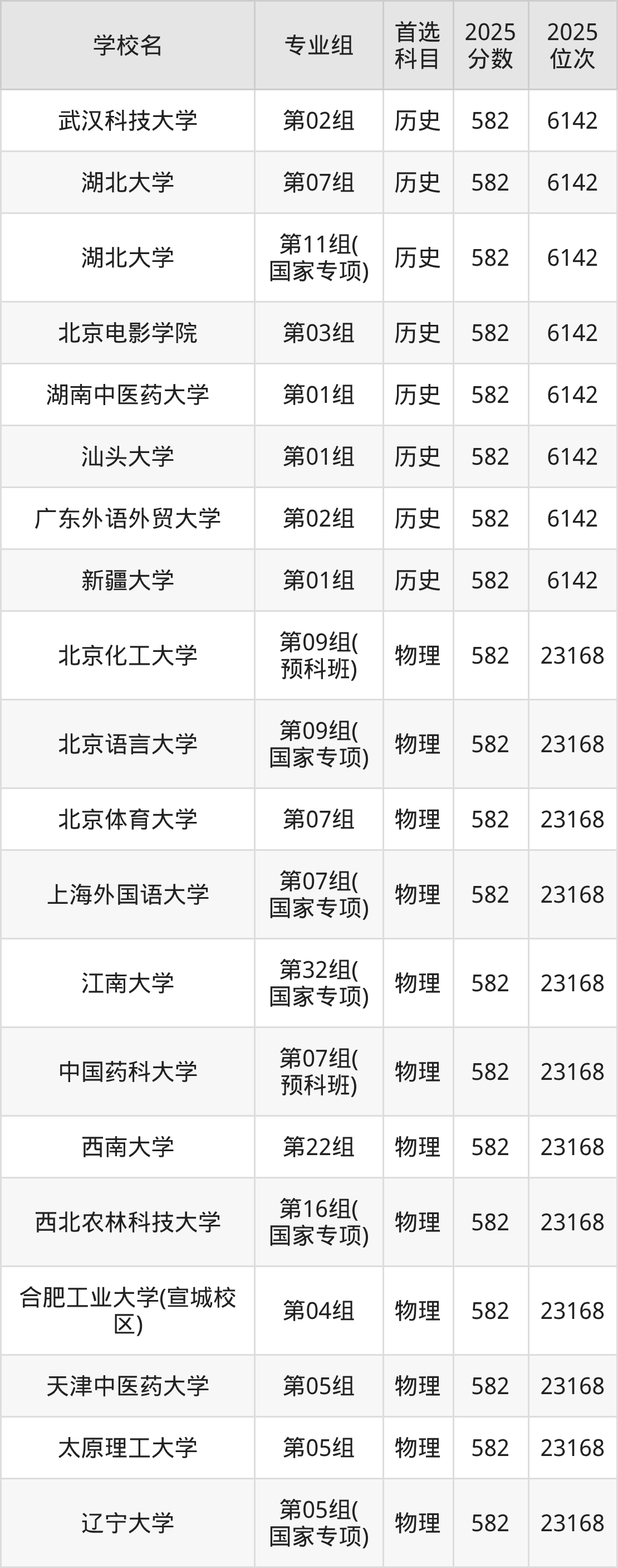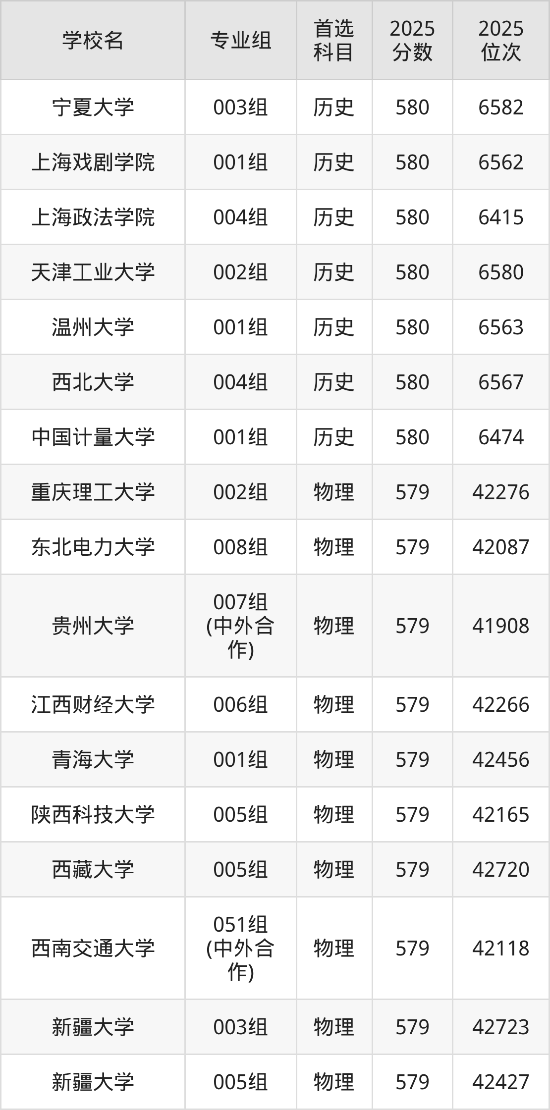 历史类580分可以冲的大学:武汉科技大学582分、湖北大学582分、北京电影学院582分、湖南中医药大学582分等;较稳妥的大学:西南财经大学579分、武汉科技大学579分、北京联合大学579分、山西师范大学579分等。