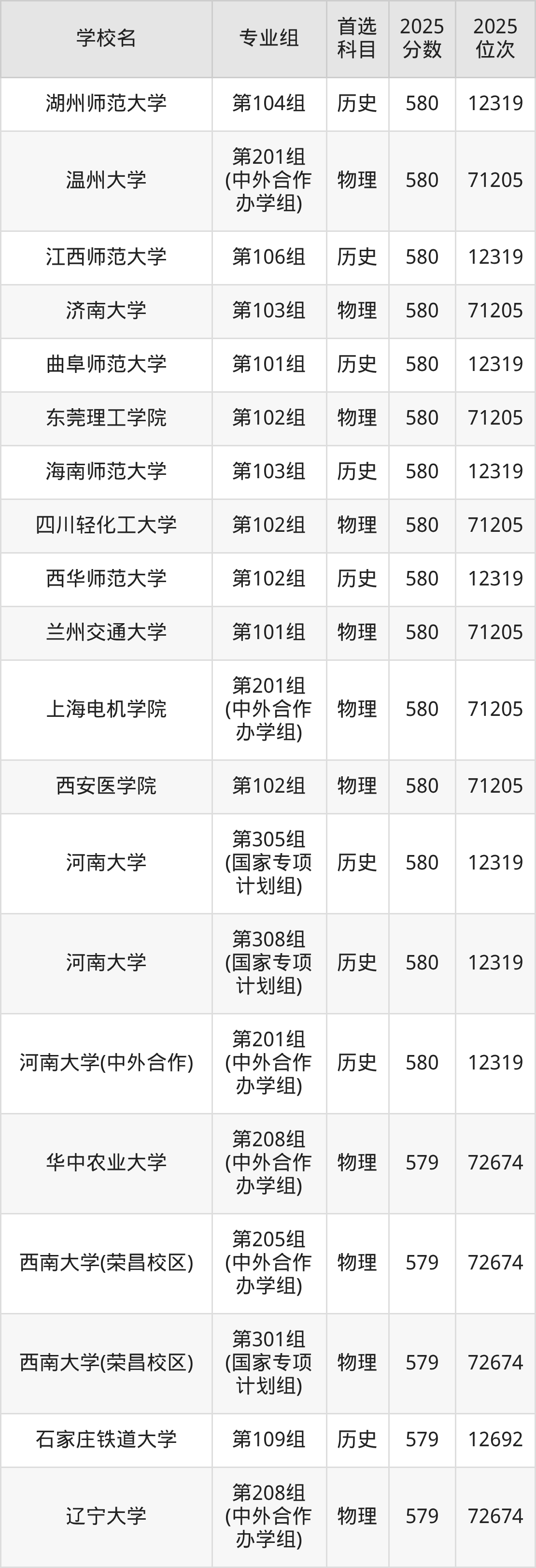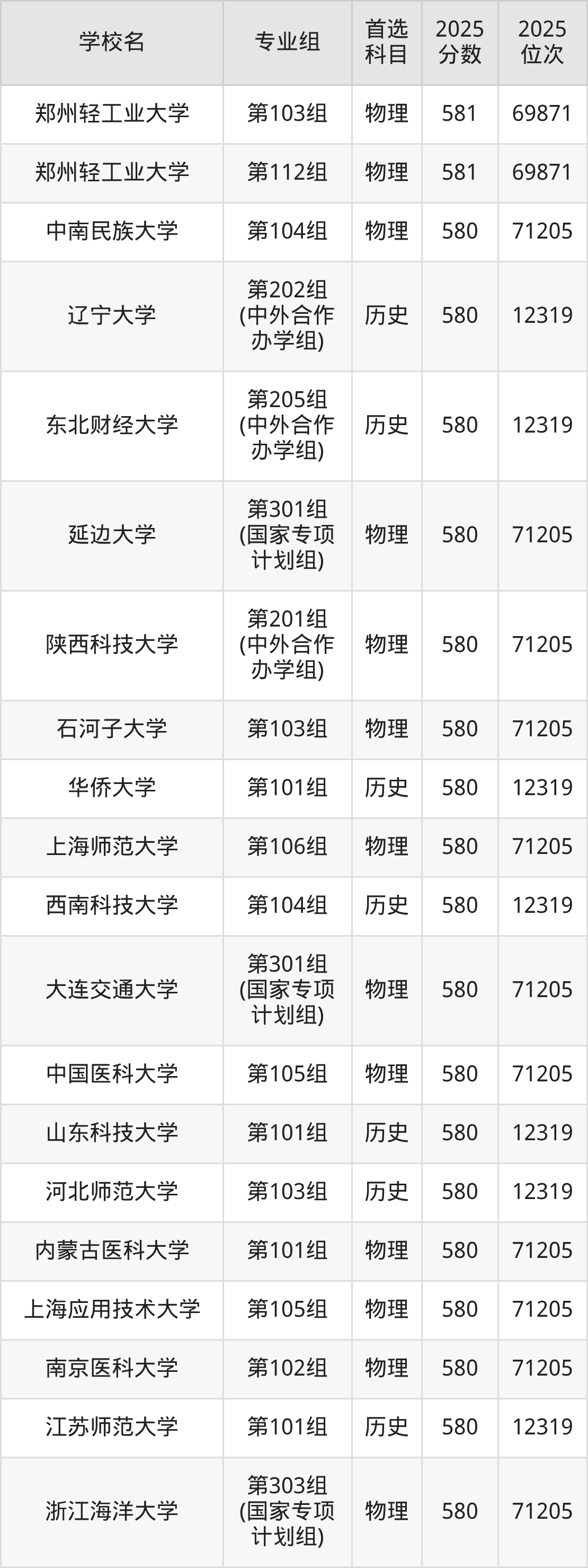 河南高考物理类580分对应的位次排名是71205名,历史类580分对应的位次排名是12319名,因此建议2026年位次排在这附近的同学考虑这些大学。