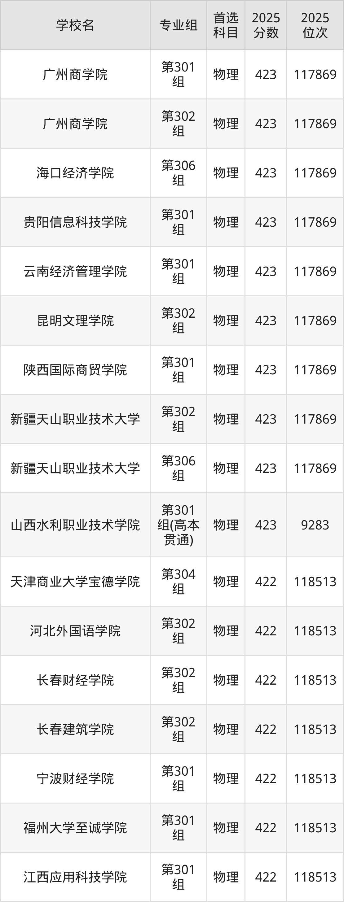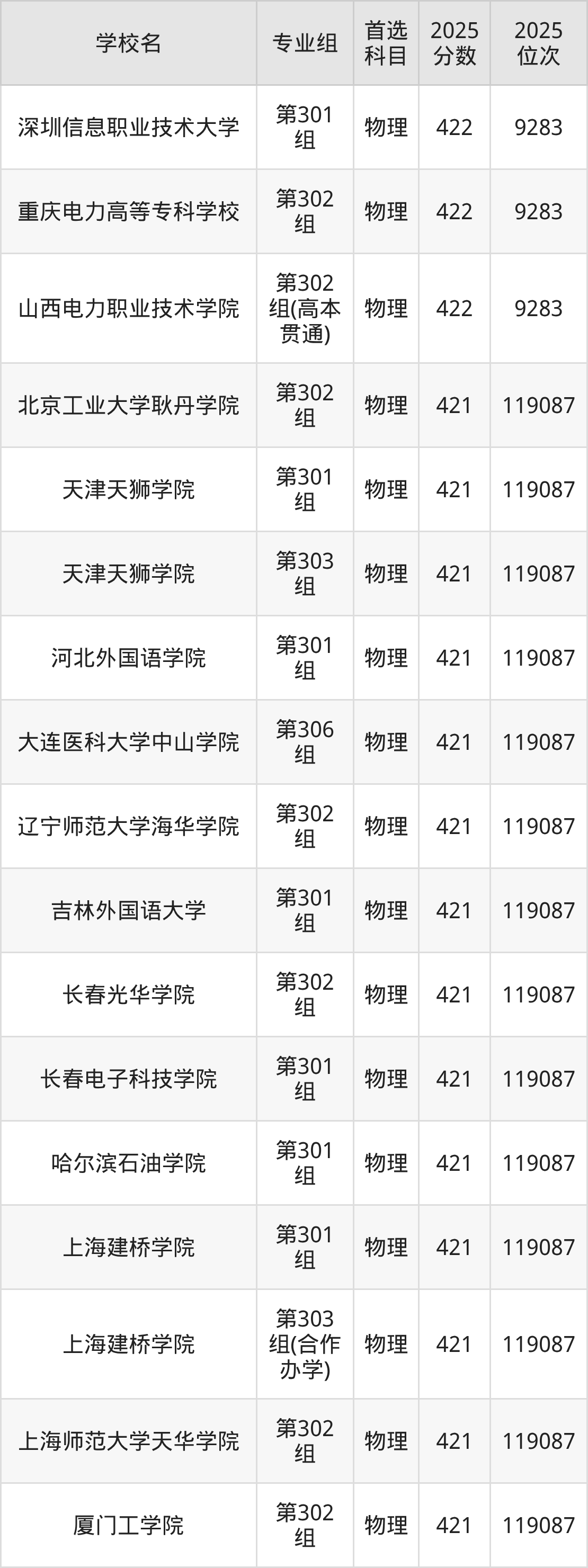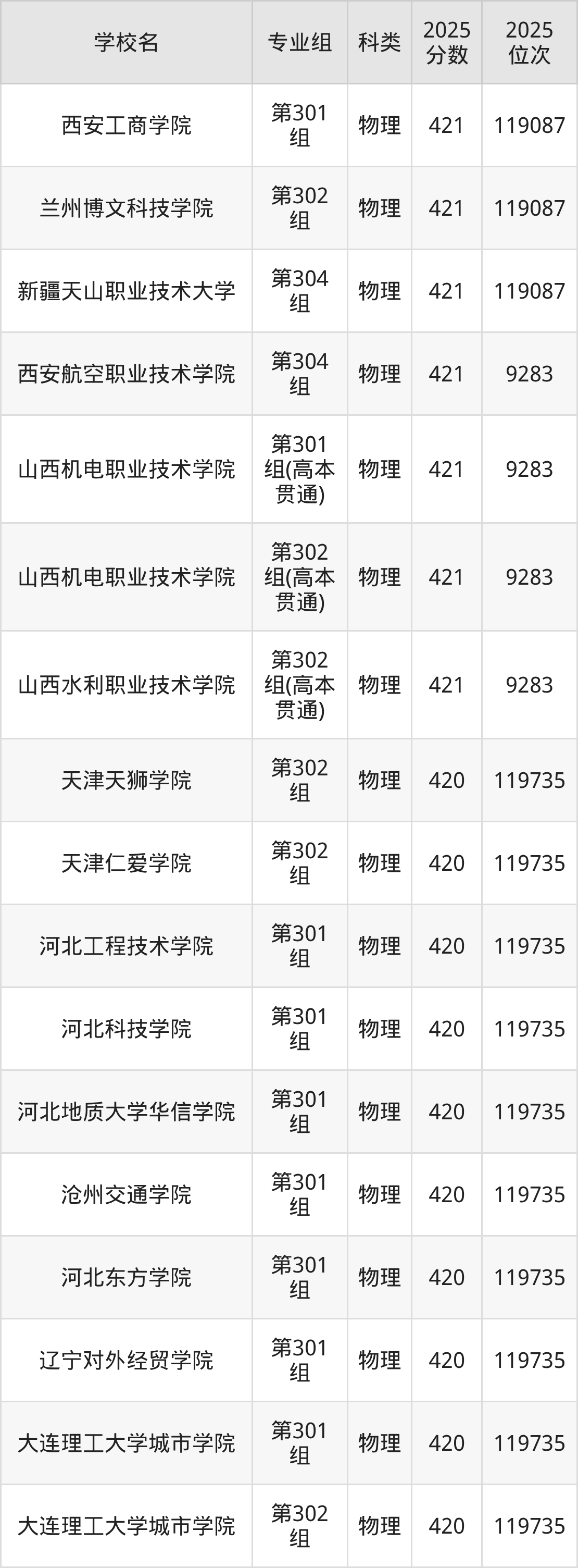山西物理类421分对应的位次排名是9283名-119087名,因此建议2026年位次排在这附近的考生考虑这些大学。