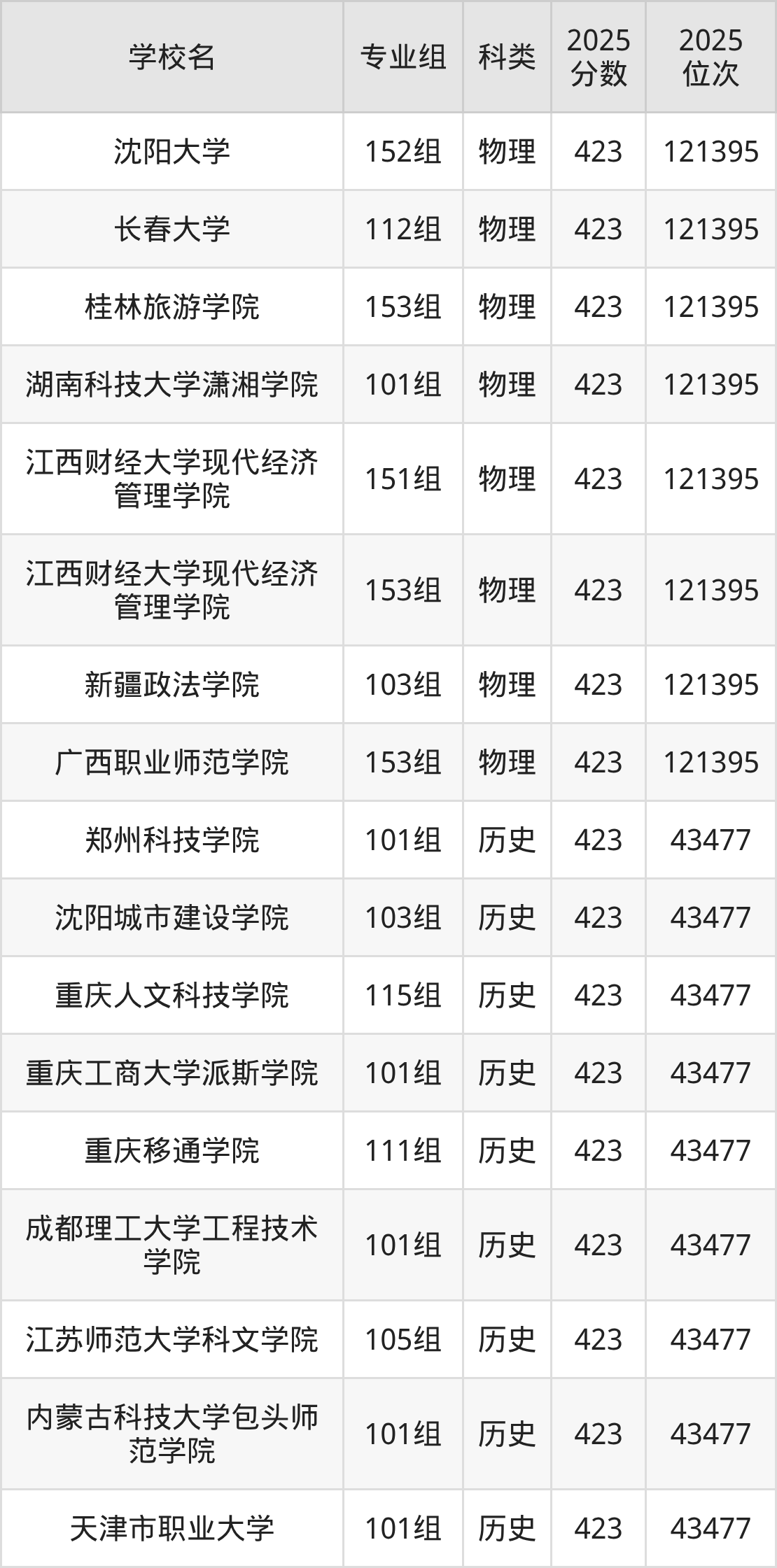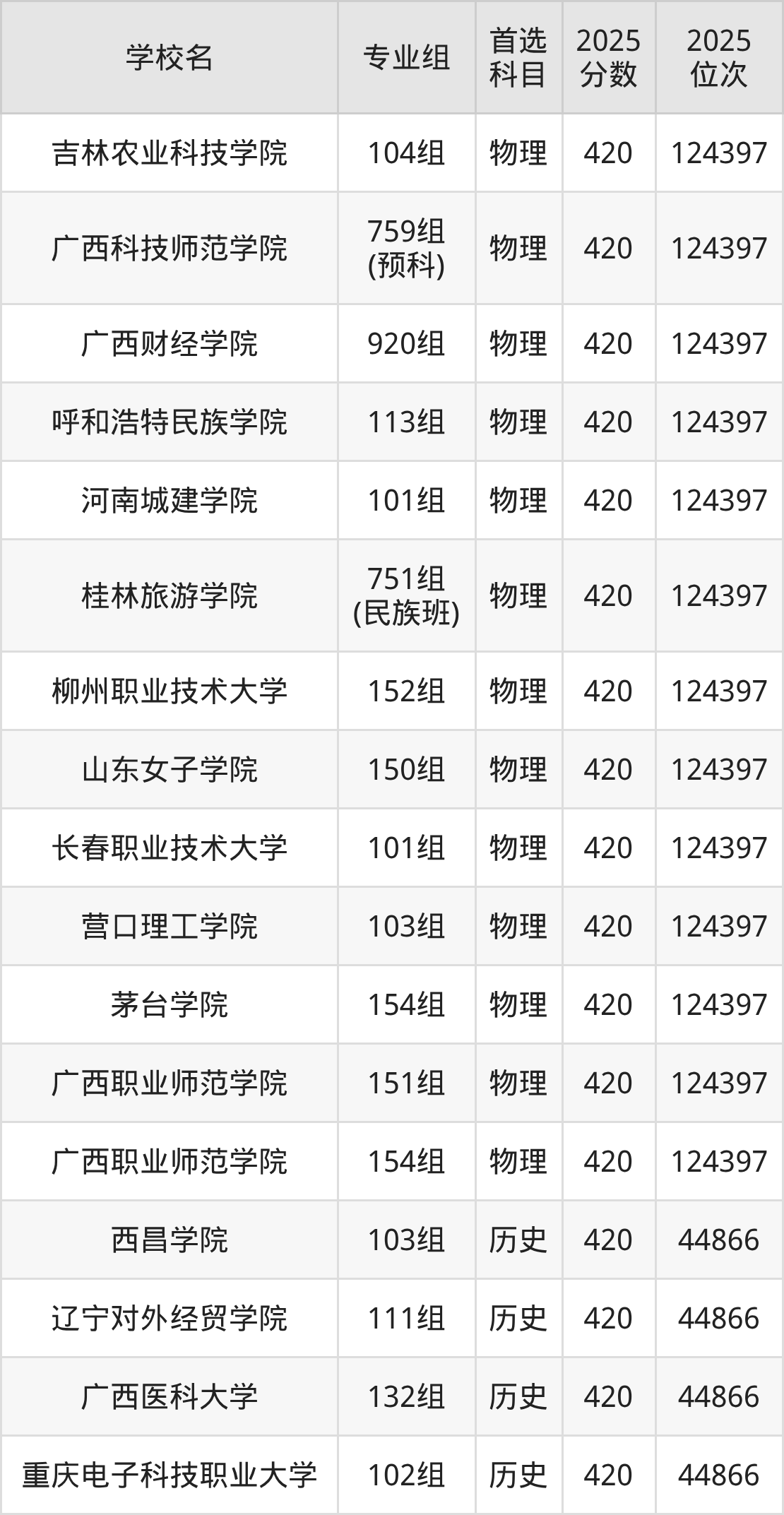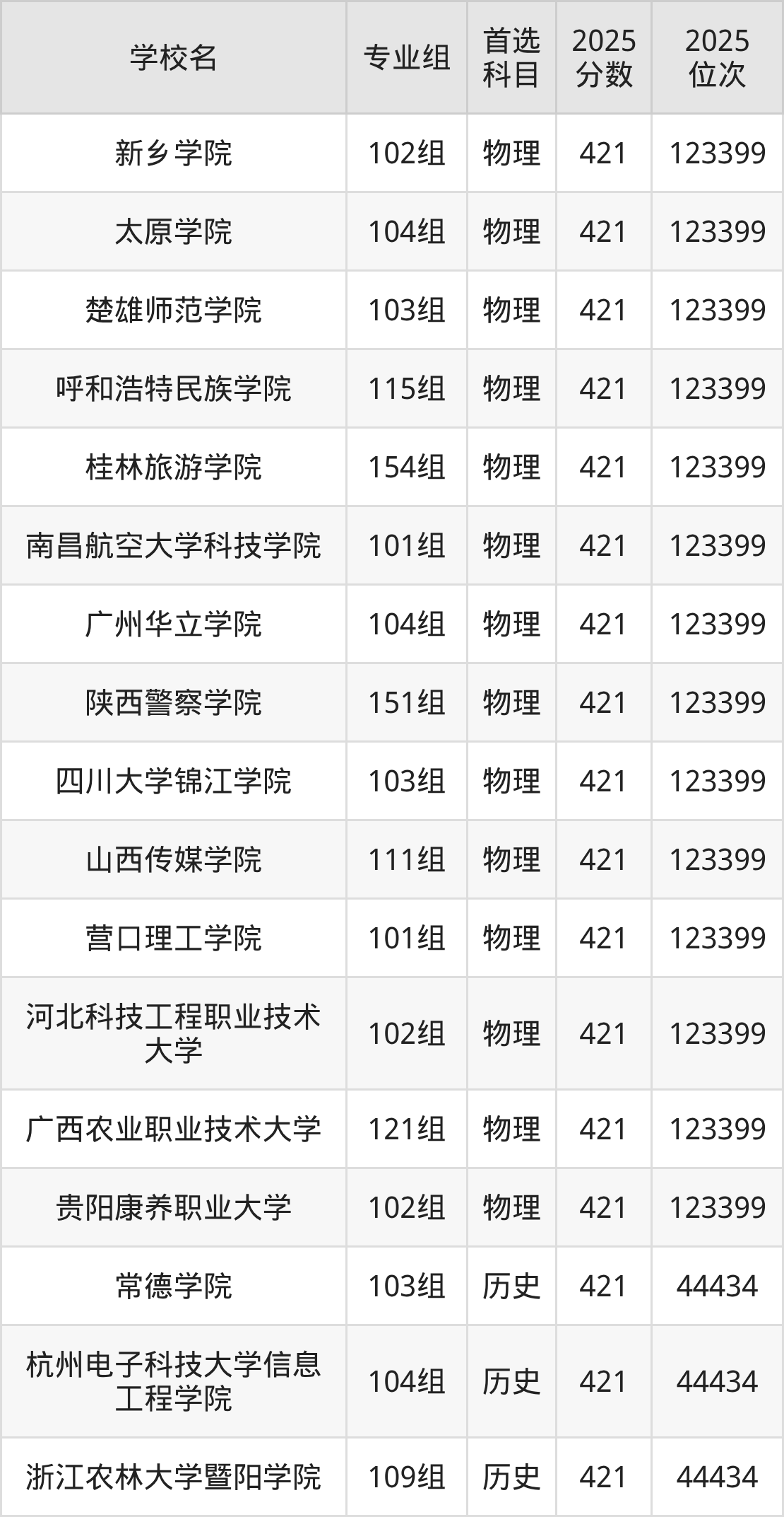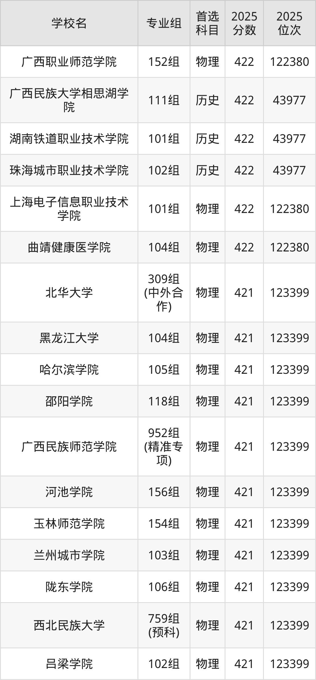 广西高考物理类421分对应的位次排名是123399名,历史类421分对应的位次排名是44434名,因此建议2026年位次排在这附近的同学考虑这些大学。