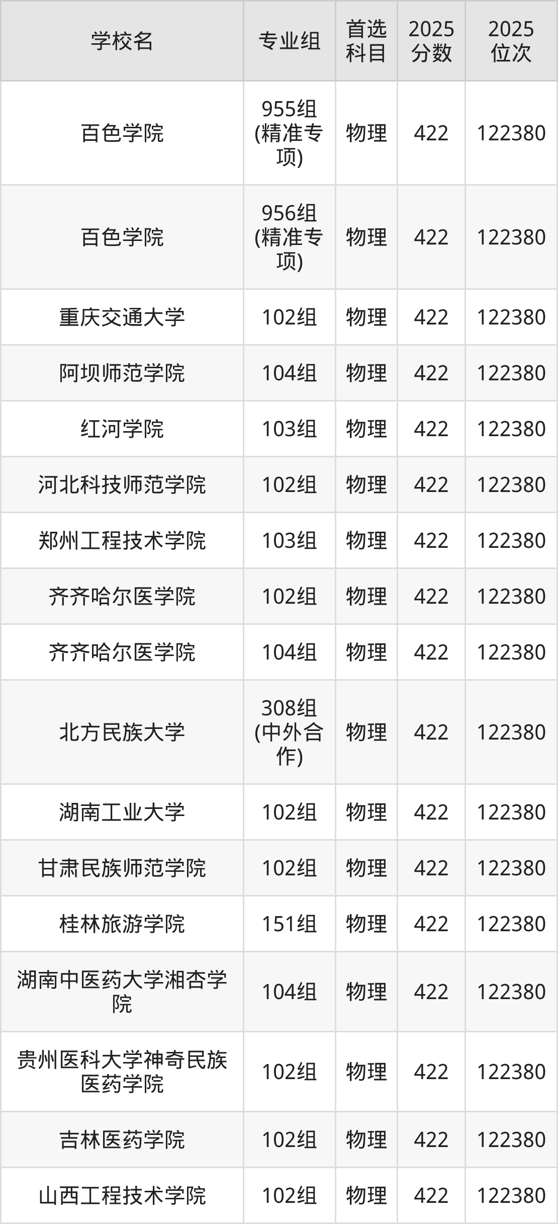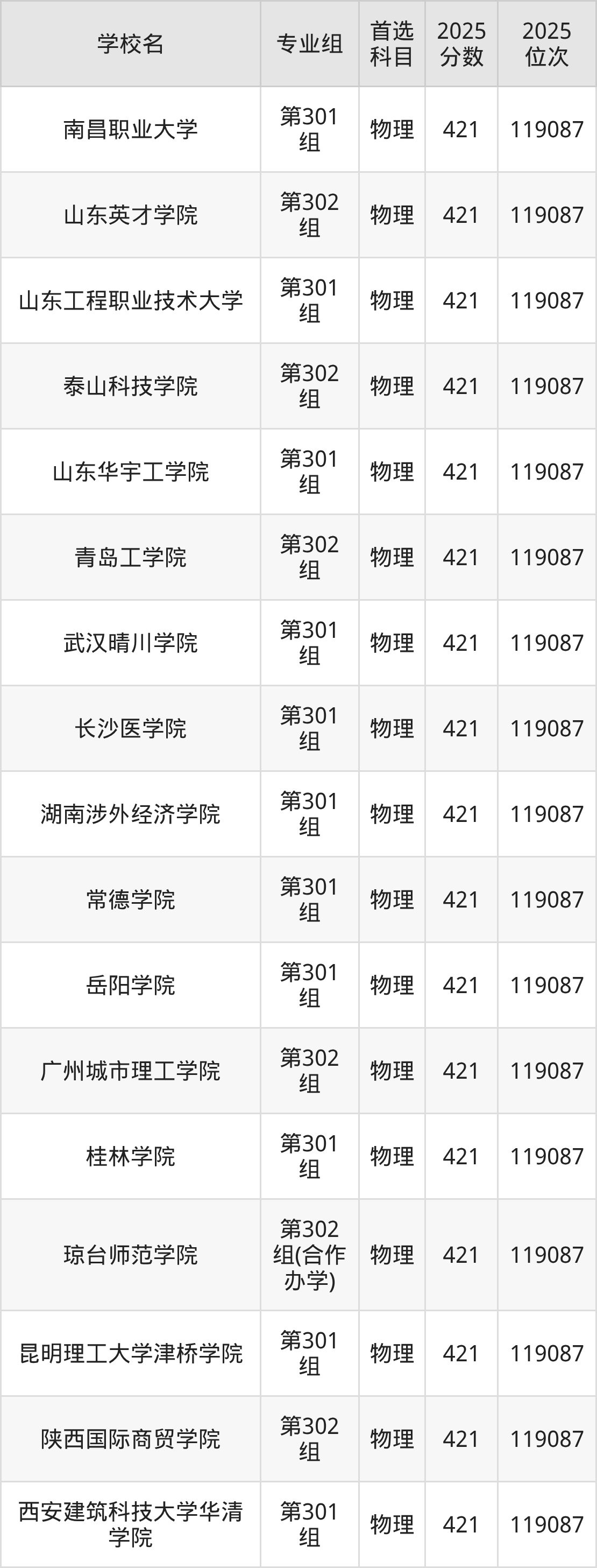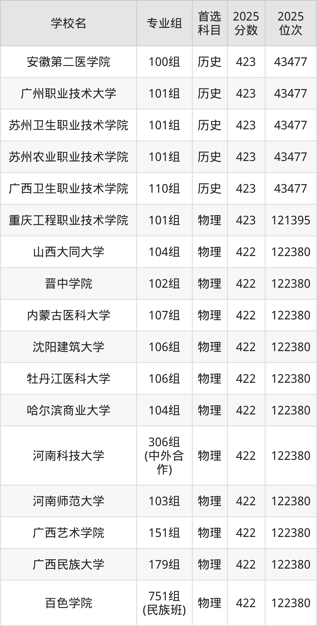 广西高考物理类421分对应的位次排名是123399名,历史类421分对应的位次排名是44434名,因此建议2026年位次排在这附近的同学考虑这些大学。