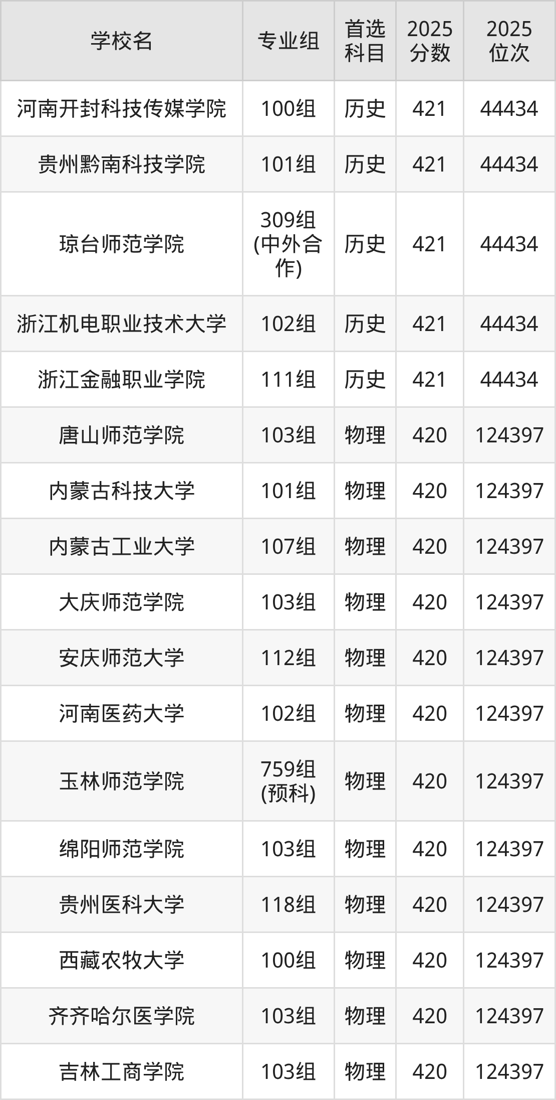 2025年在广西高考物理类录取分数线是421分的大学有北华大学、黑龙江大学、哈尔滨学院、邵阳学院、广西民族师范学院、河池学院、玉林师范学院、兰州城市学院、陇东学院、西北民族大学等。历史类录取分数线是421分的大学有常德学院、杭州电子科技大学信息工程学院、浙江农林大学暨阳学院、河南开封科技传媒学院、贵州黔南科技学院、琼台师范学院、浙江机电职业技术大学、浙江金融职业学院。
