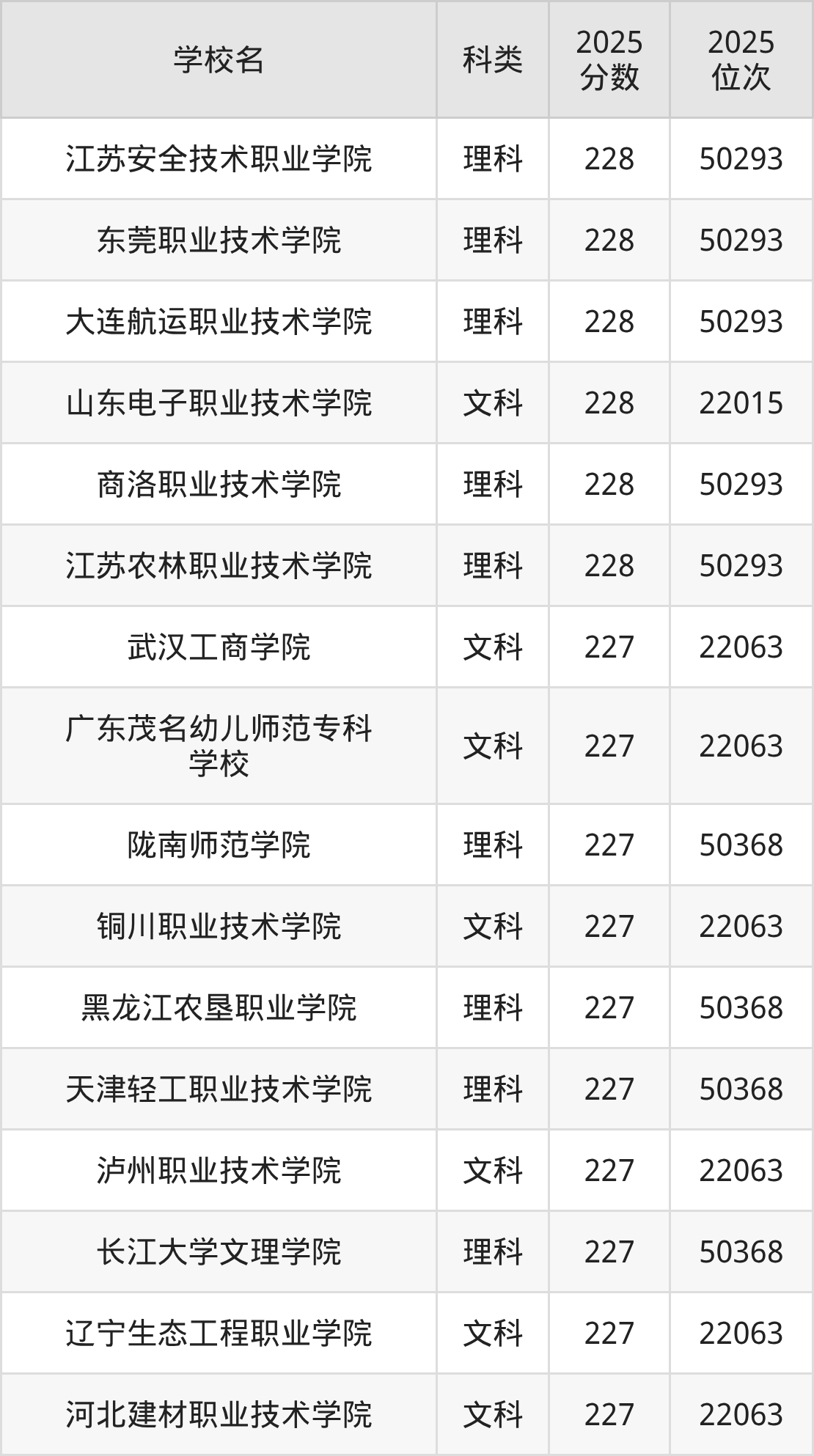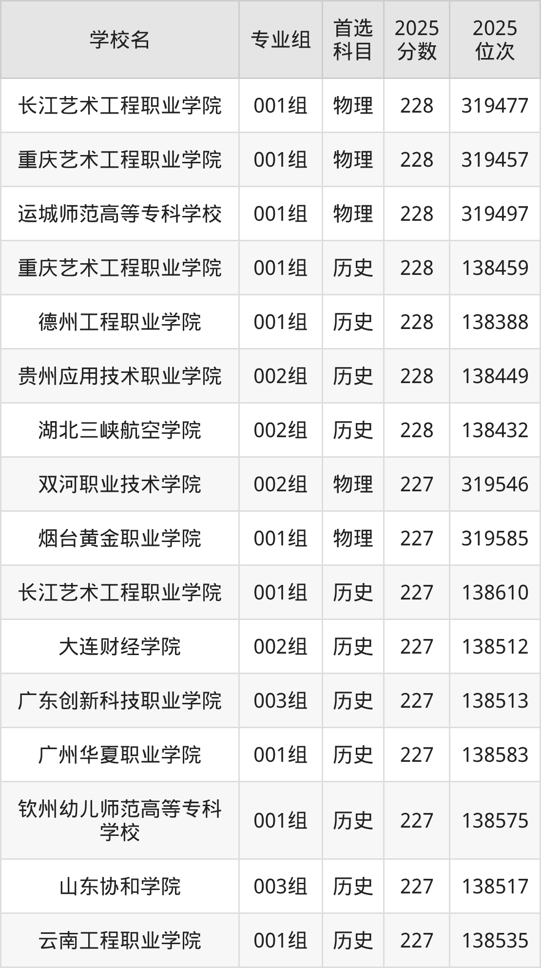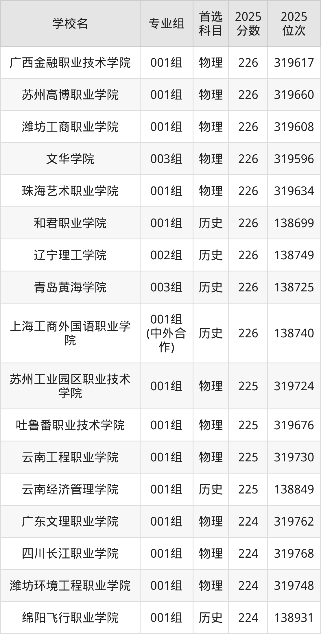 下面老师将以上文整理的其中两个省份为例,为大家具体展示226分左右能上的专科大学名单。
