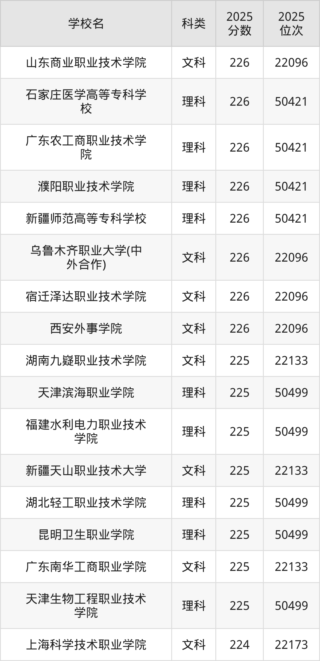 从2025年划定的批次线来看,226分在以下地区可以上专科大学,2025年专科线不超过226分的地区有22个,具体如下: