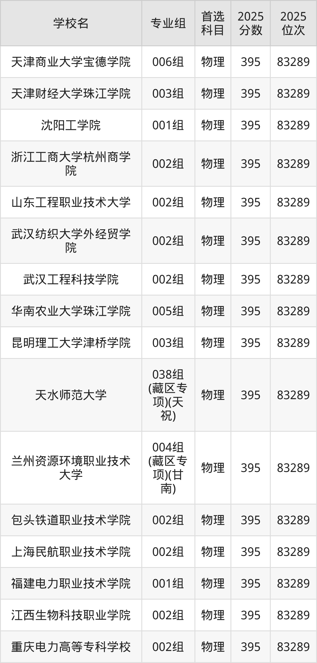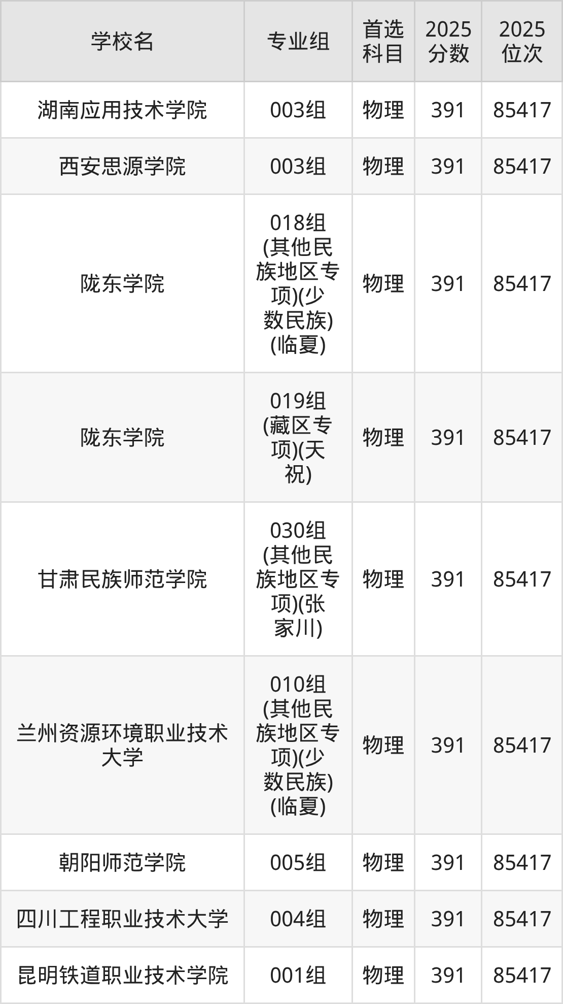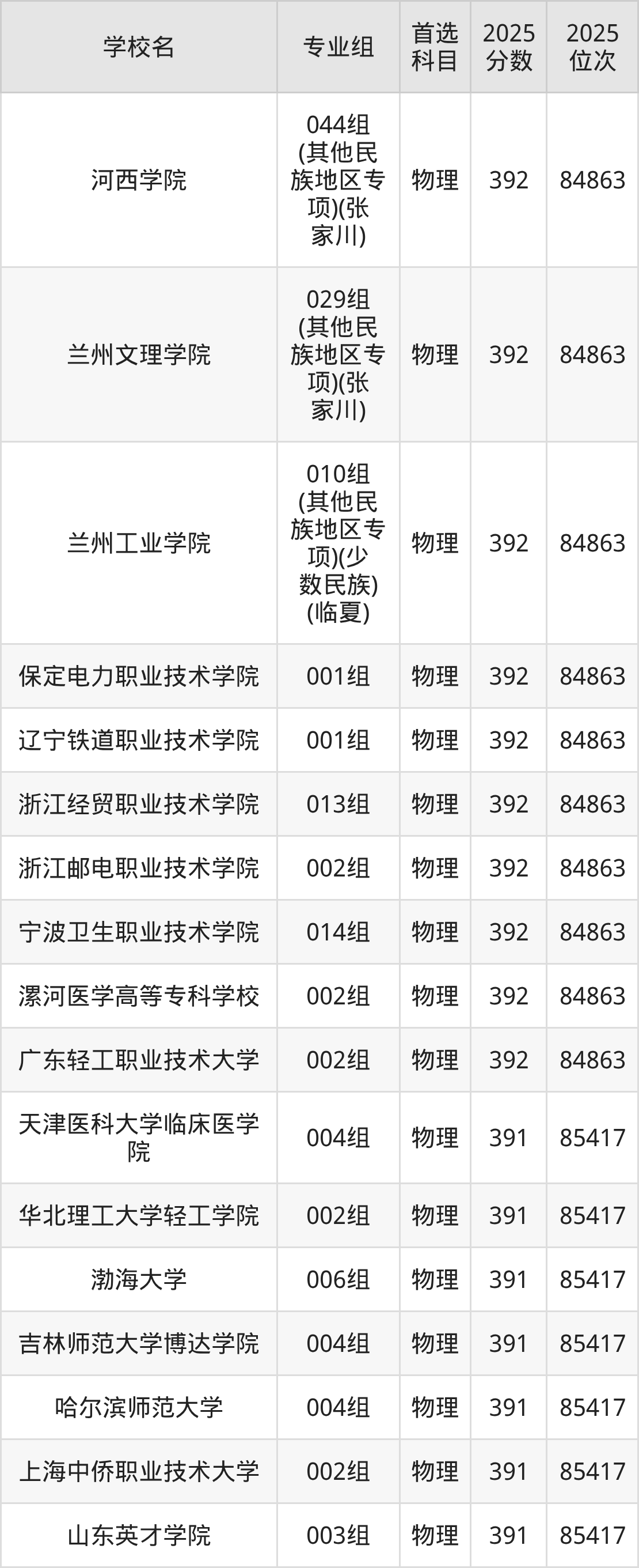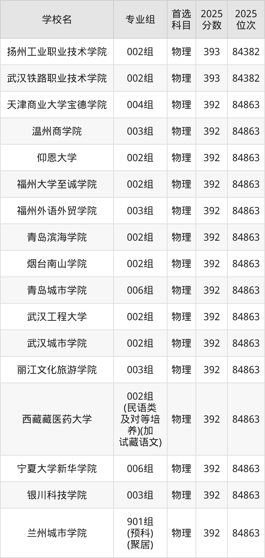 甘肃物理类393分对应的位次排名是84382名,因此建议2026年位次排在这附近的考生考虑这些大学。