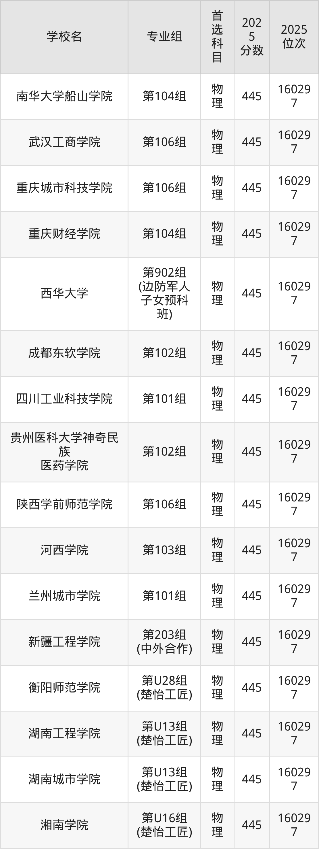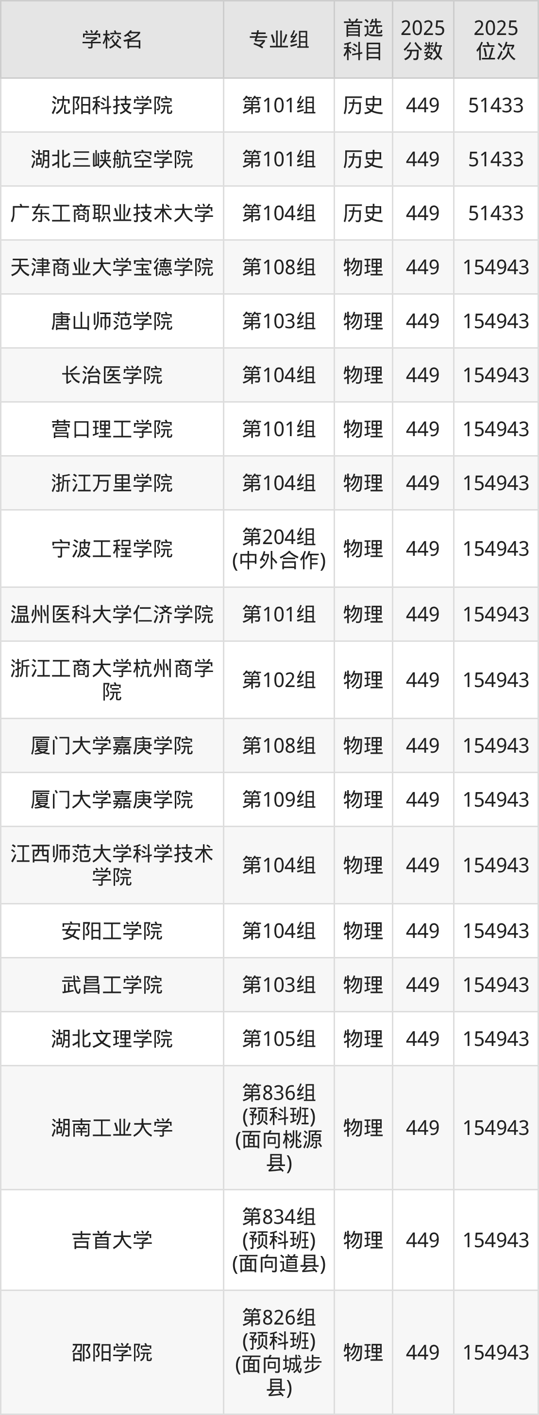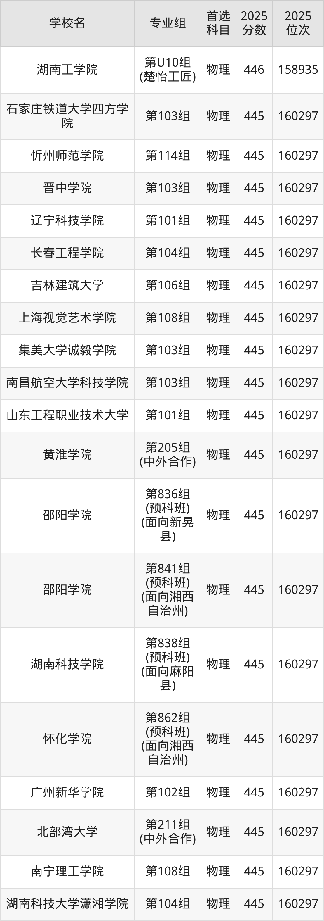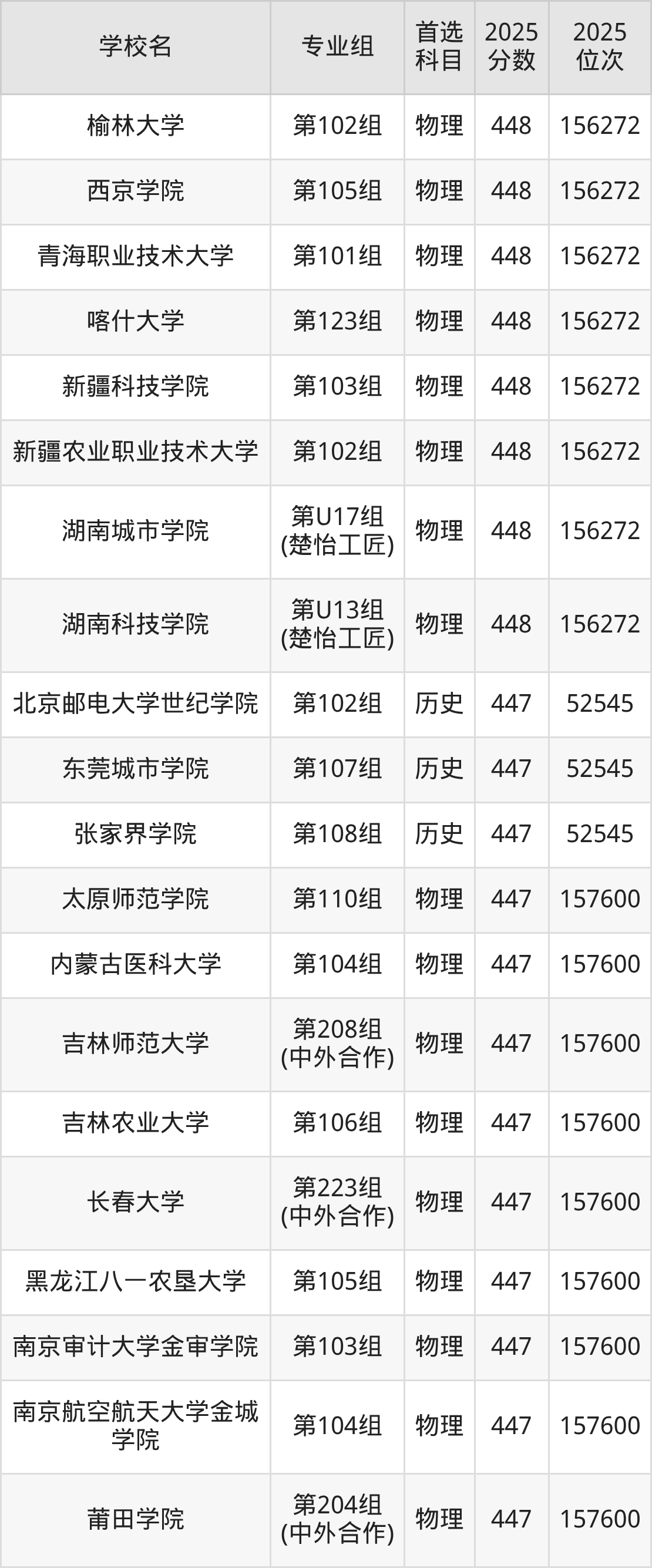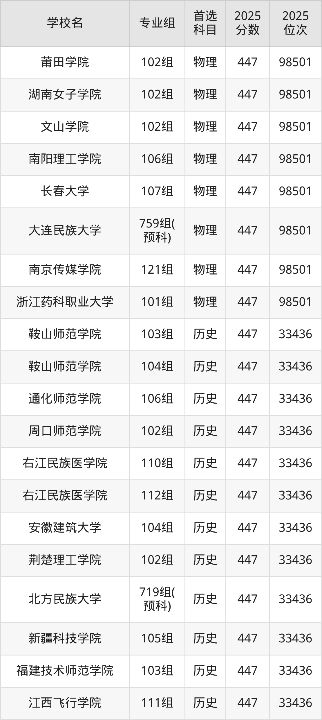 2025年在湖南高考历史类录取分数线是447分的大学有北京邮电大学世纪学院、东莞城市学院、张家界学院。物理类录取分数线是447分的大学有太原师范学院、内蒙古医科大学、吉林师范大学、吉林农业大学、长春大学、黑龙江八一农垦大学、南京审计大学金审学院、南京航空航天大学金城学院、莆田学院、洛阳师范学院等。