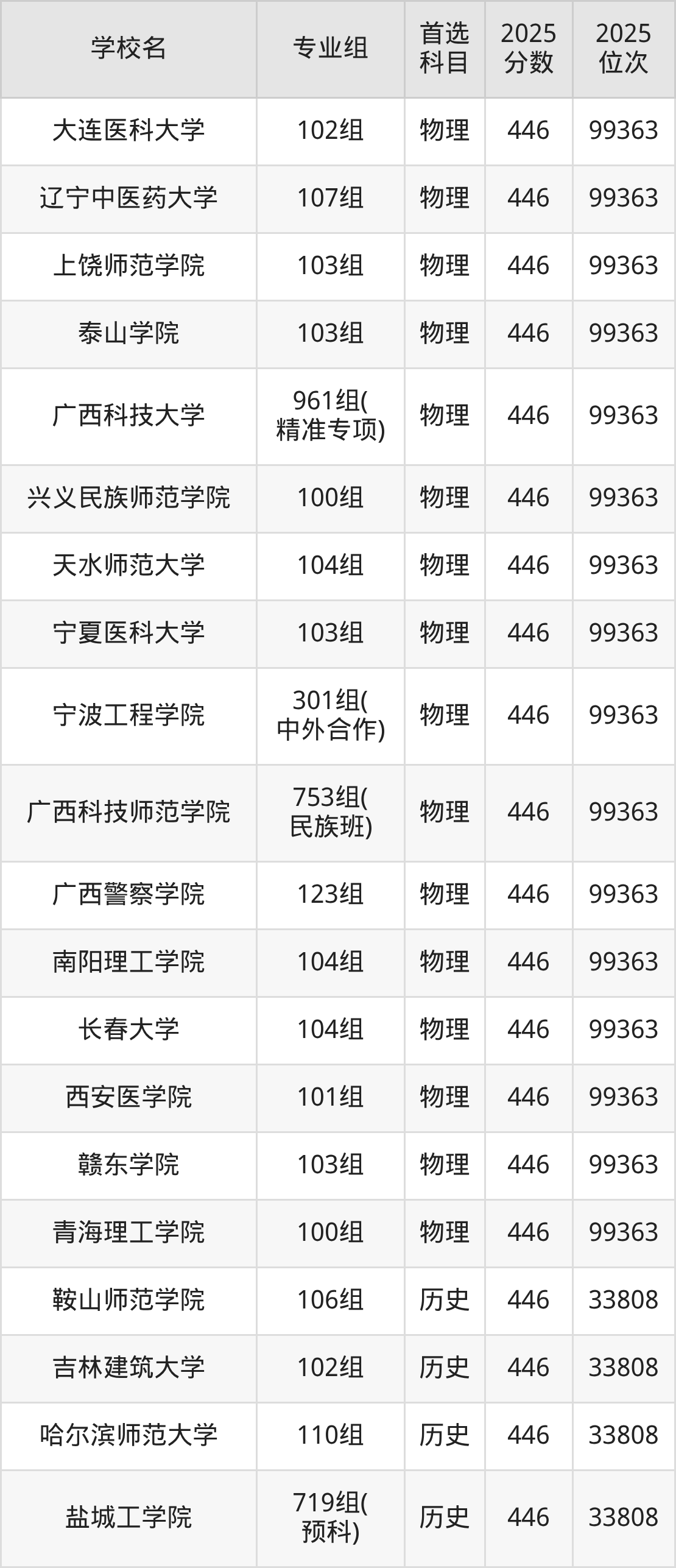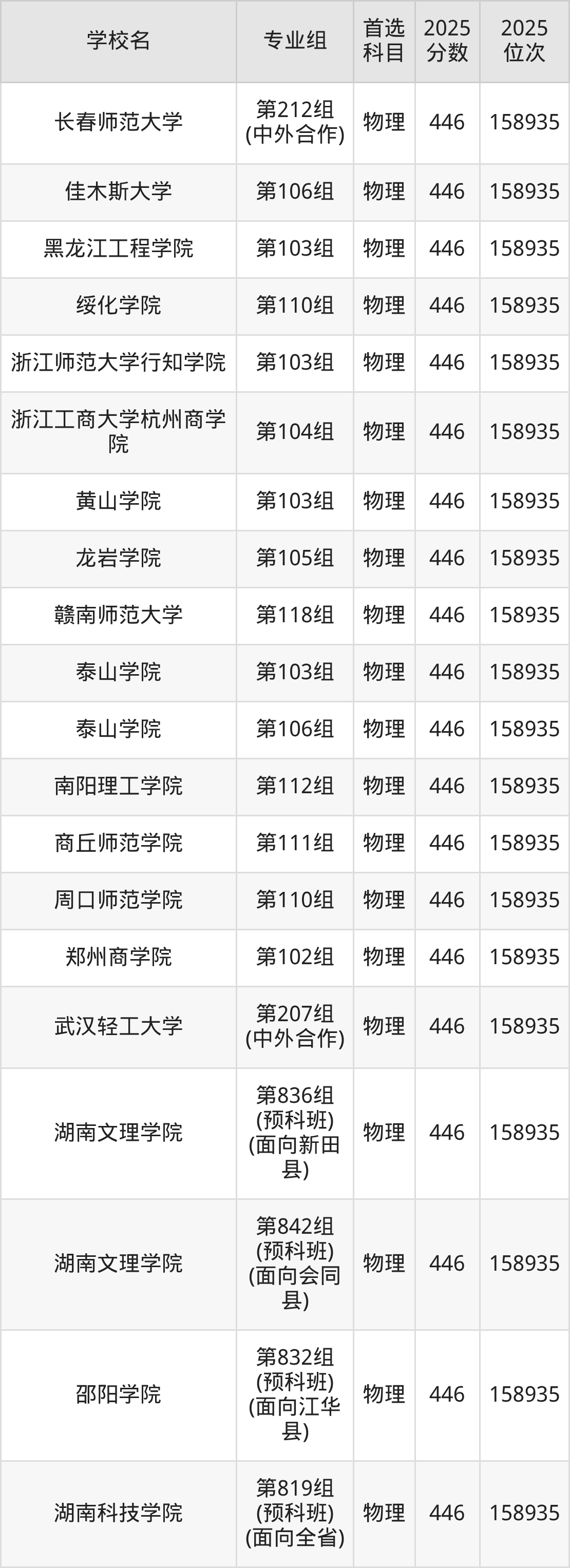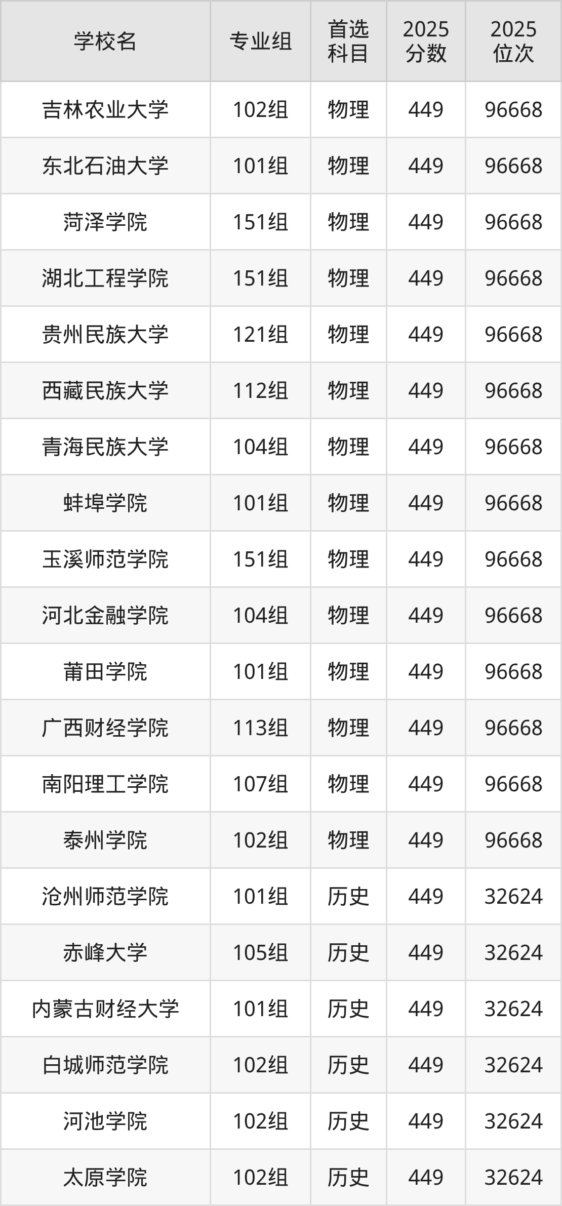 物理类447分可以冲的大学:吉林农业大学449分、东北石油大学449分、菏泽学院449分、湖北工程学院449分等;较稳妥的大学:大连医科大学446分、辽宁中医药大学446分、上饶师范学院446分、泰山学院446分等。