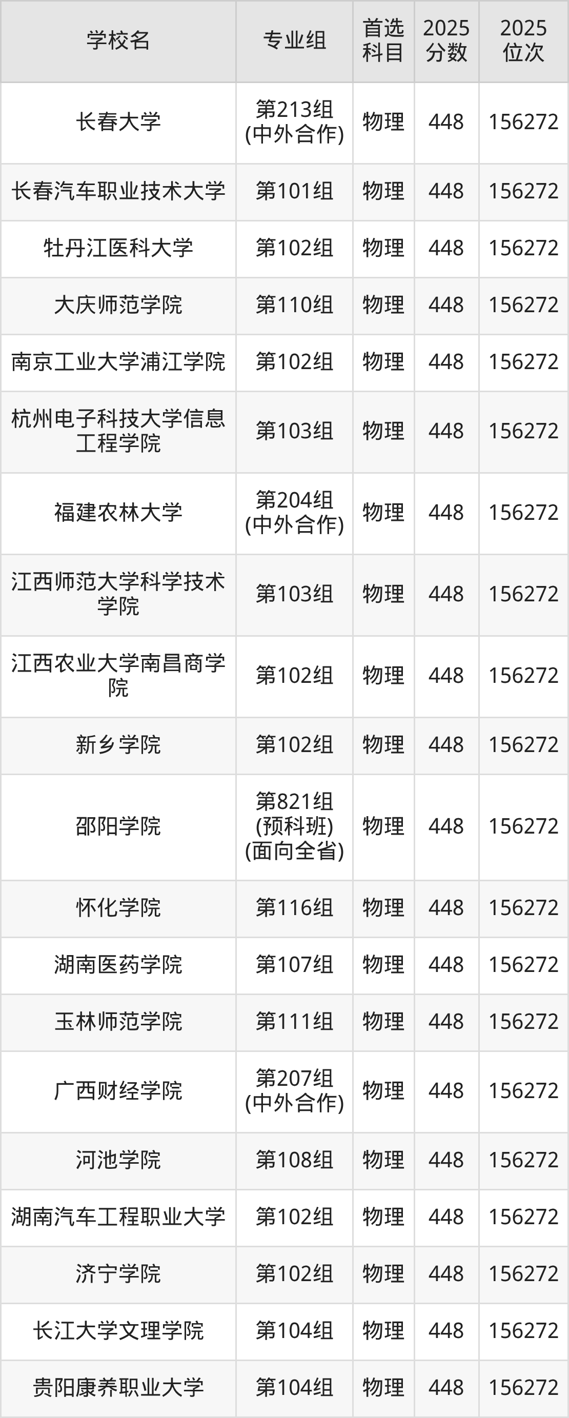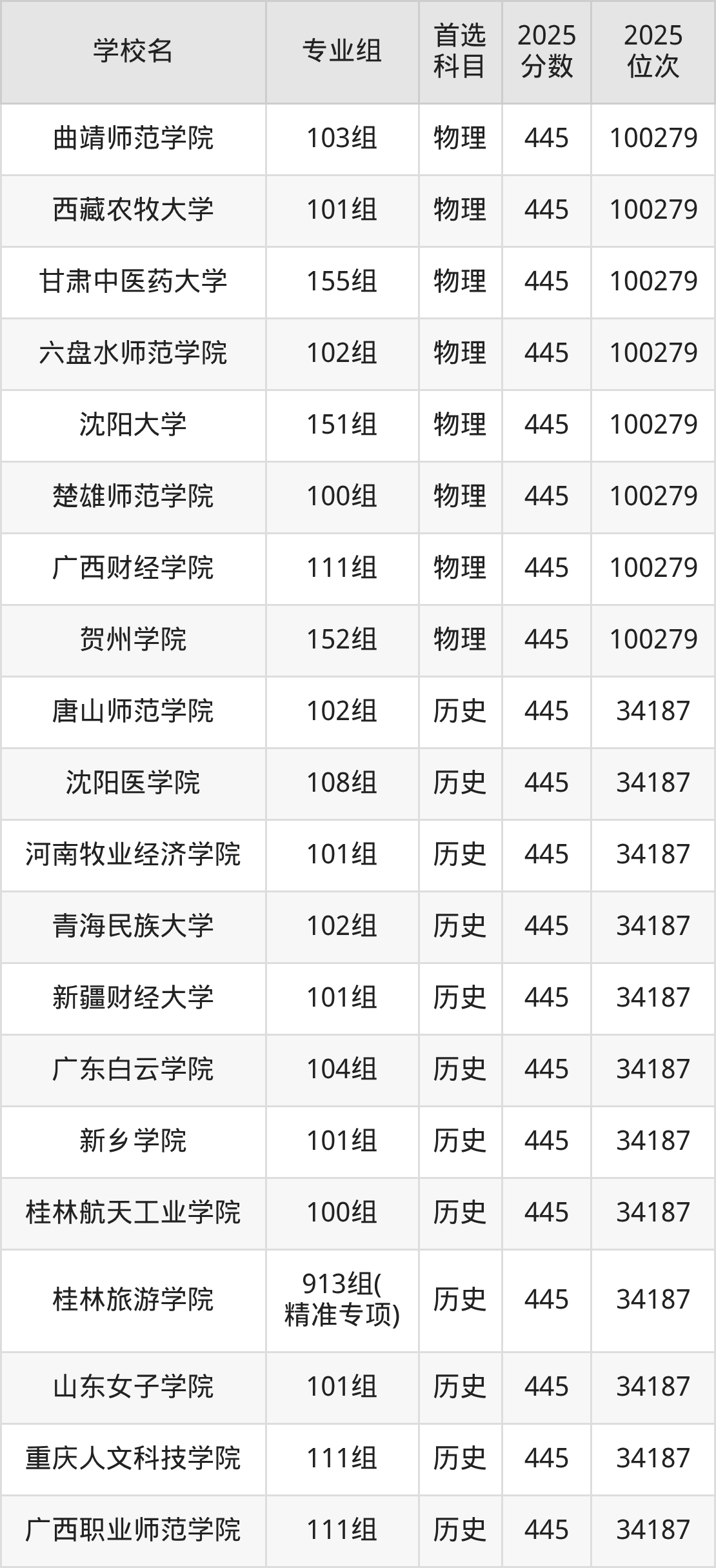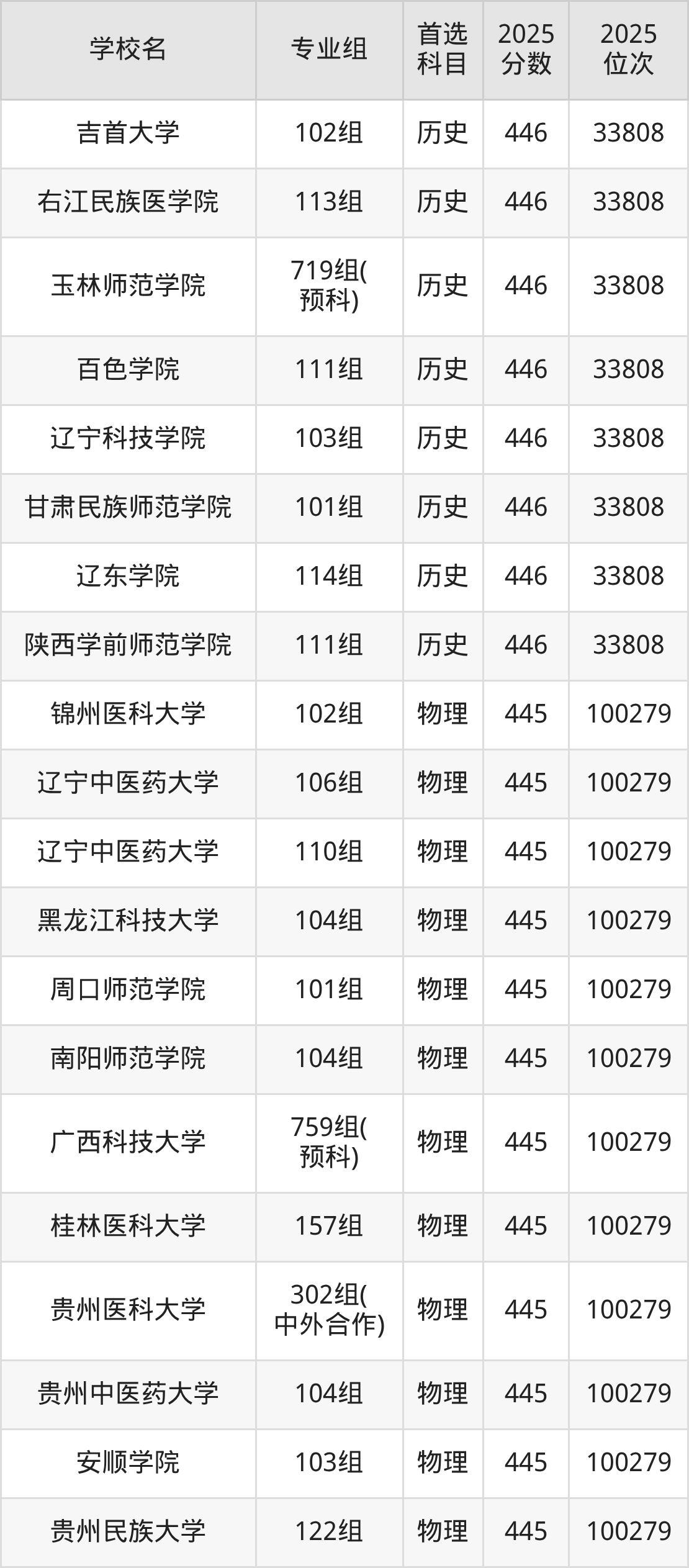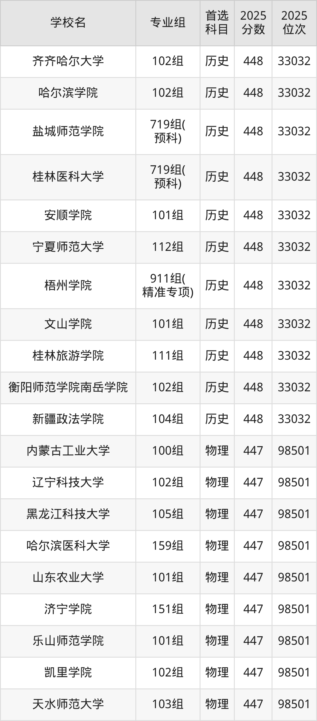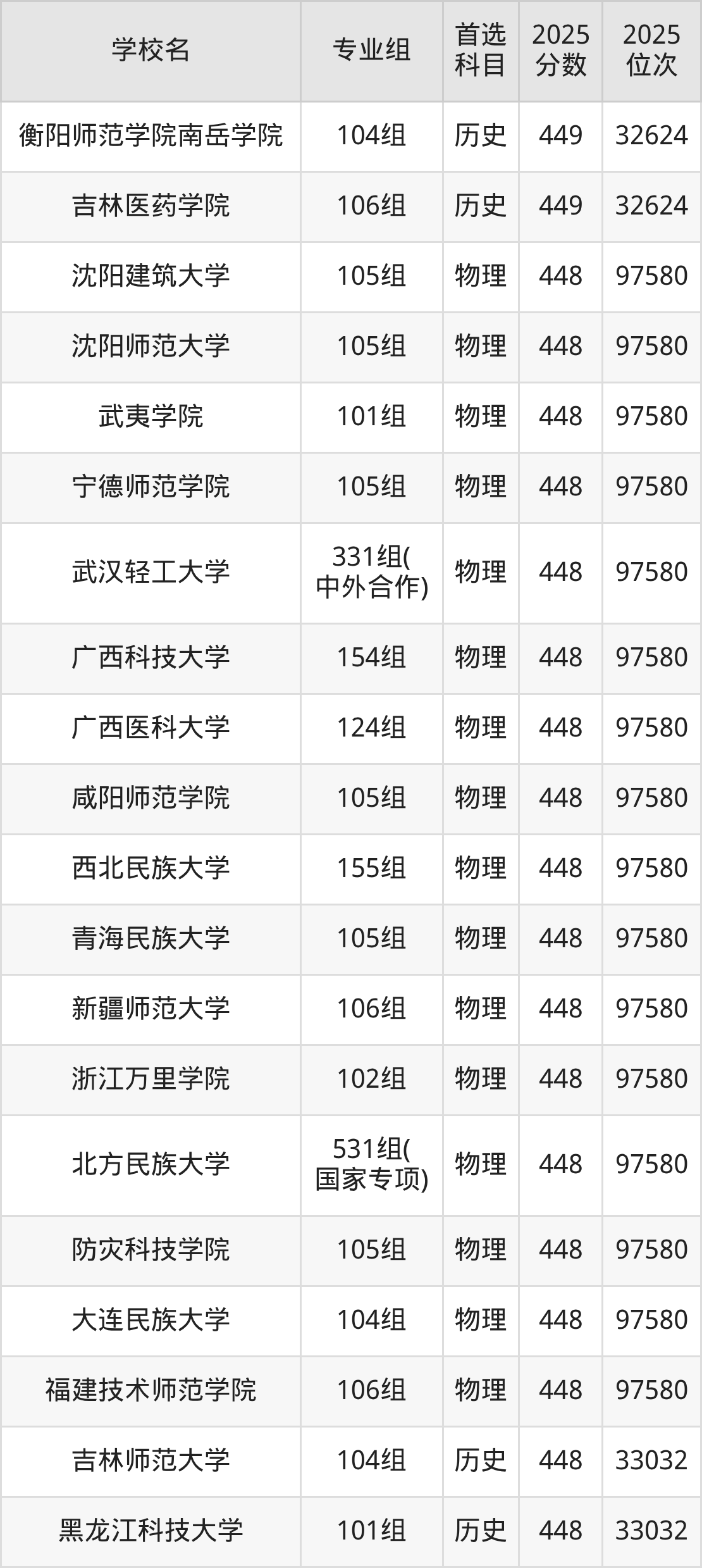 广西高考物理类447分对应的位次排名是98501名,历史类447分对应的位次排名是33436名,因此建议2026年位次排在这附近的同学考虑这些大学。