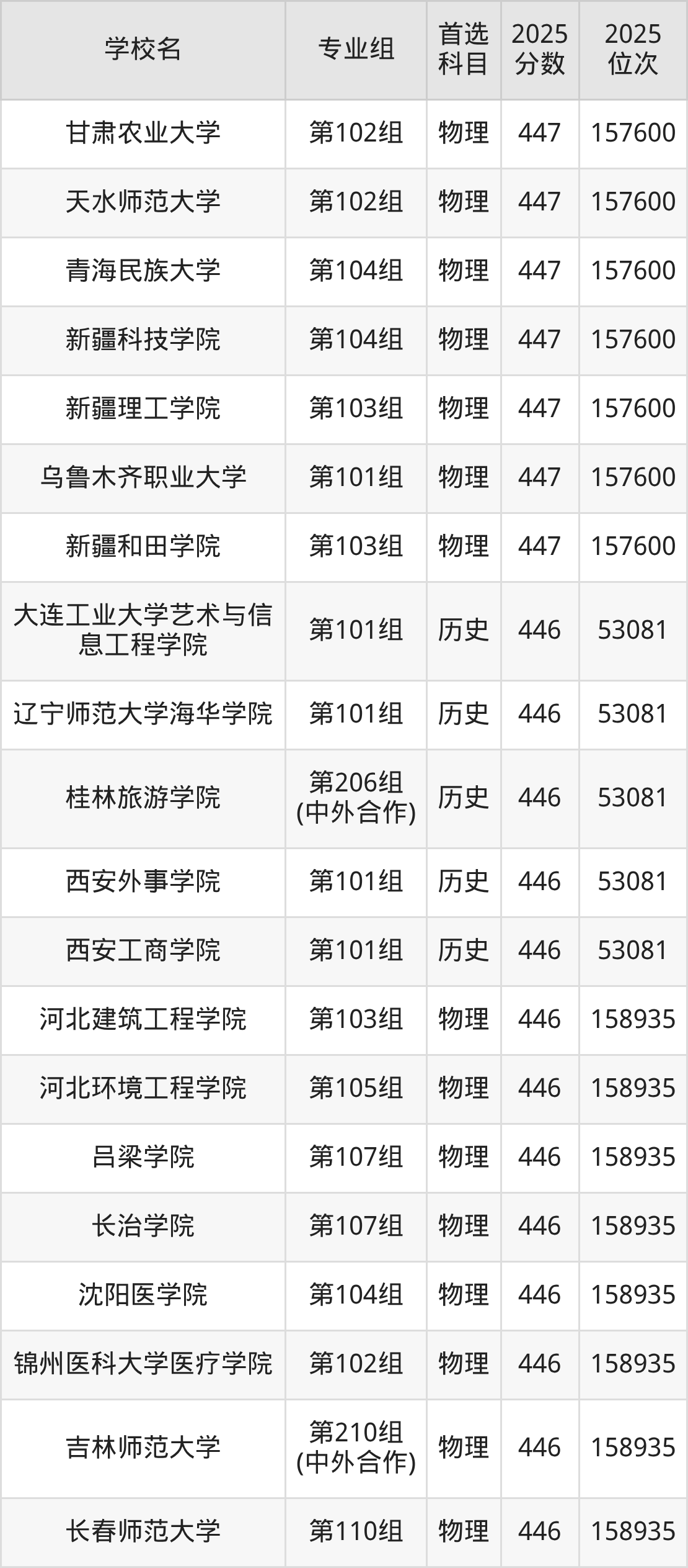 下面老师将以上文整理的其中两个省份为例,为大家具体展示447分左右能上的本科大学名单。