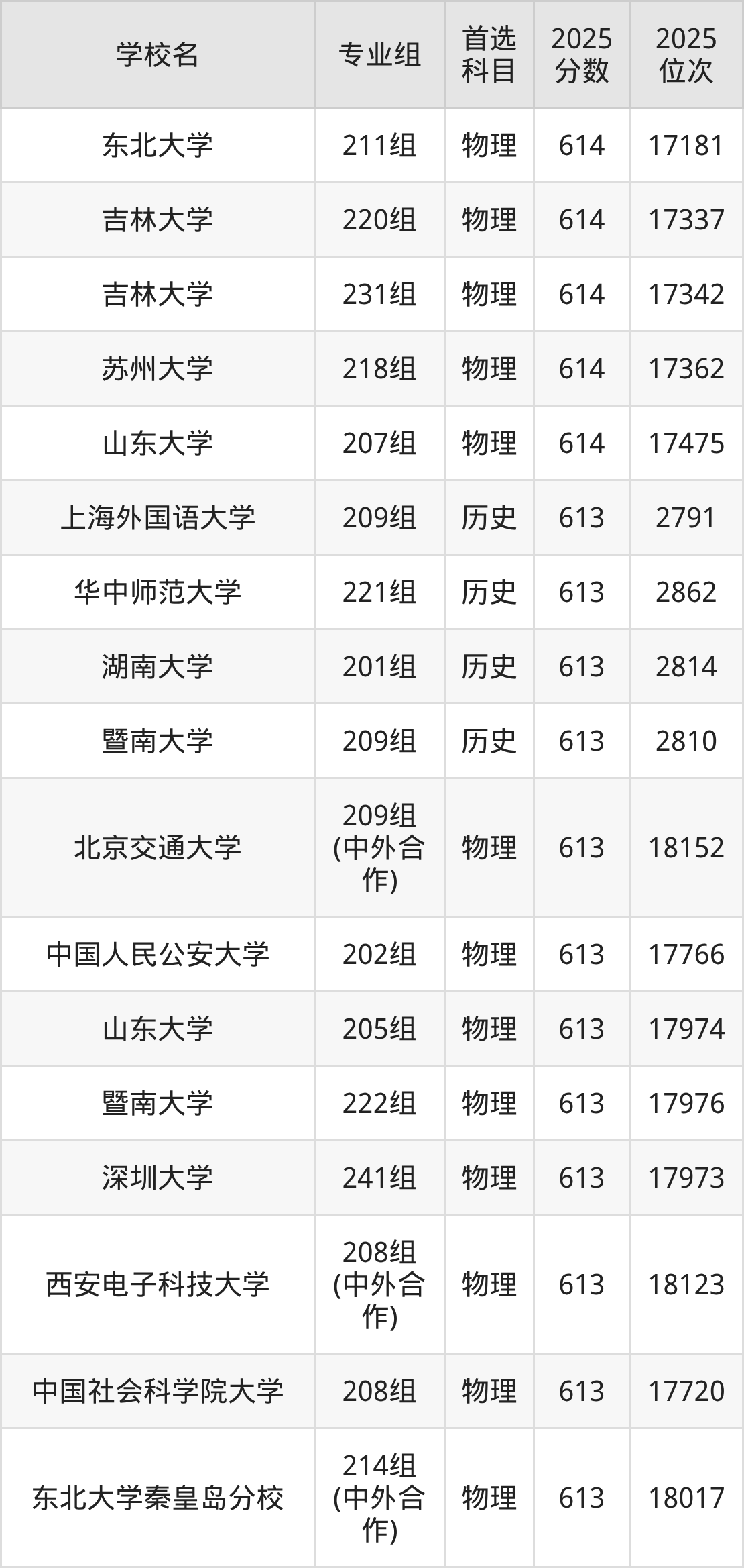 2025年在广东高考历史类录取分数线是613分的大学有上海外国语大学、华中师范大学、湖南大学、暨南大学。物理类录取分数线是613分的大学有北京交通大学、中国人民公安大学、山东大学、暨南大学、深圳大学、西安电子科技大学、中国社会科学院大学、东北大学秦皇岛分校。