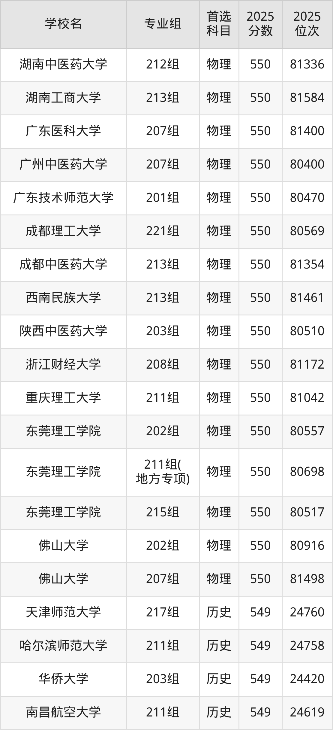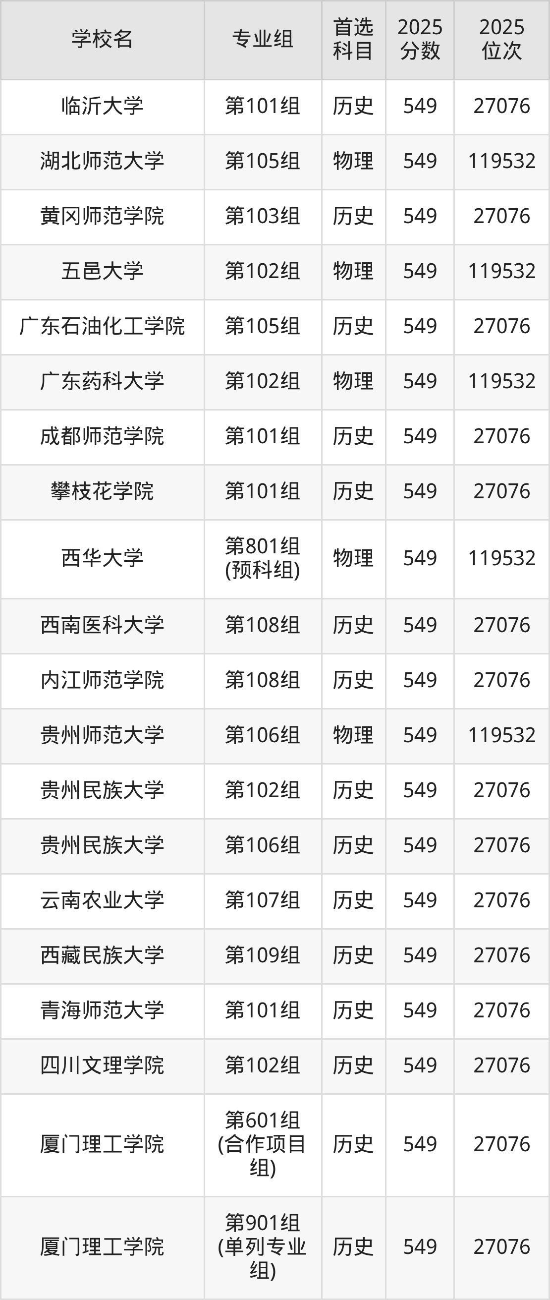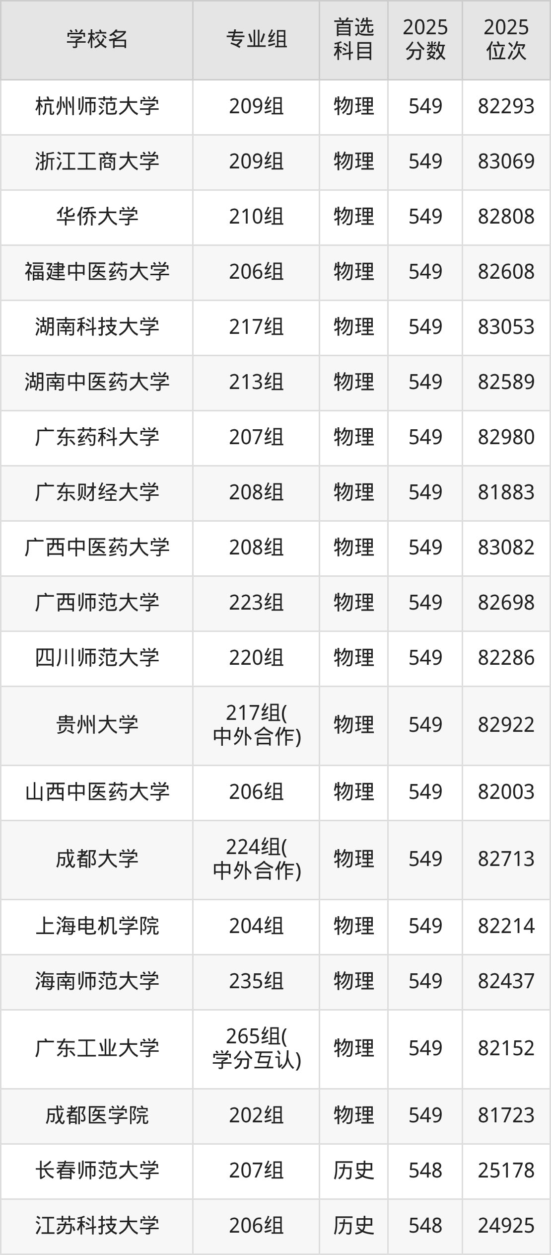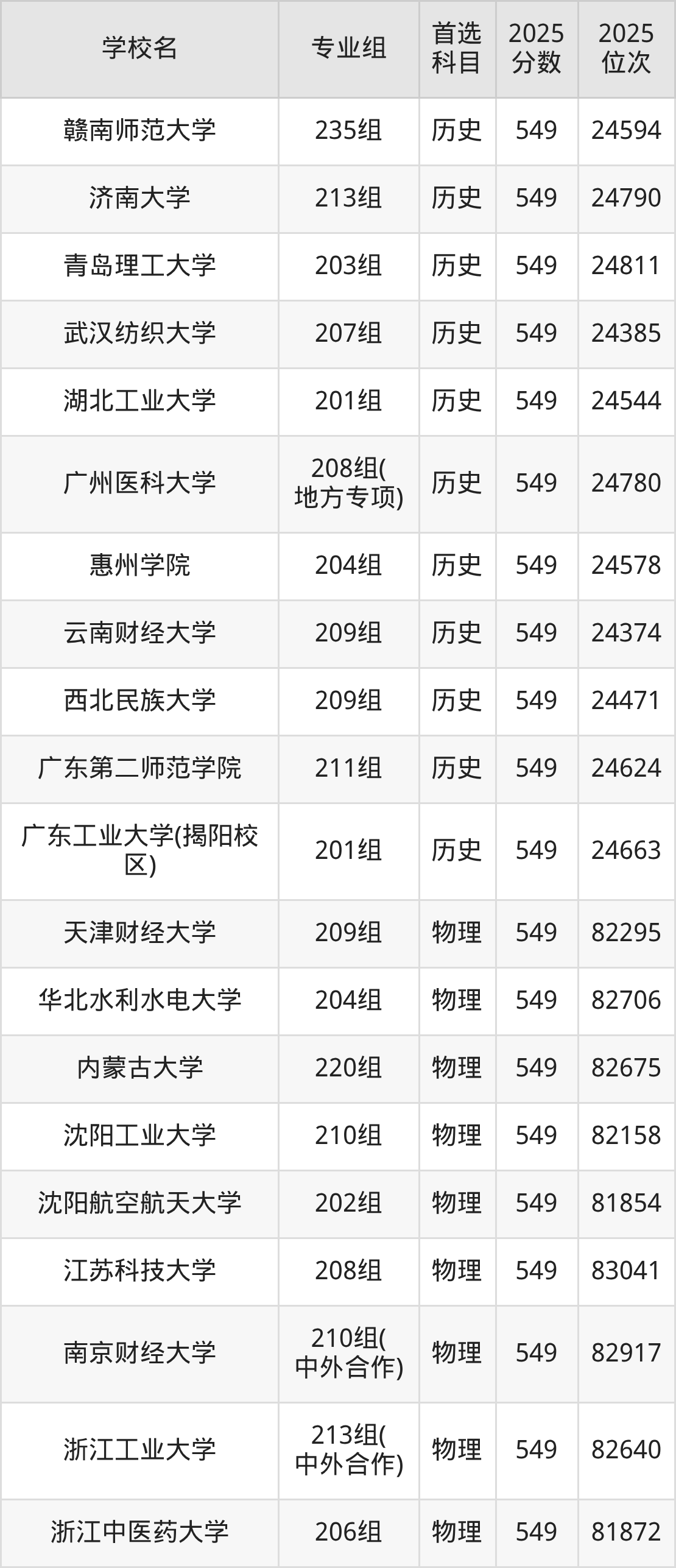 广东高考历史类549分对应的位次排名是24374名-24811名,物理类549分对应的位次排名是81723名-83082名,因此建议2026年位次排在这附近的同学考虑这些大学。