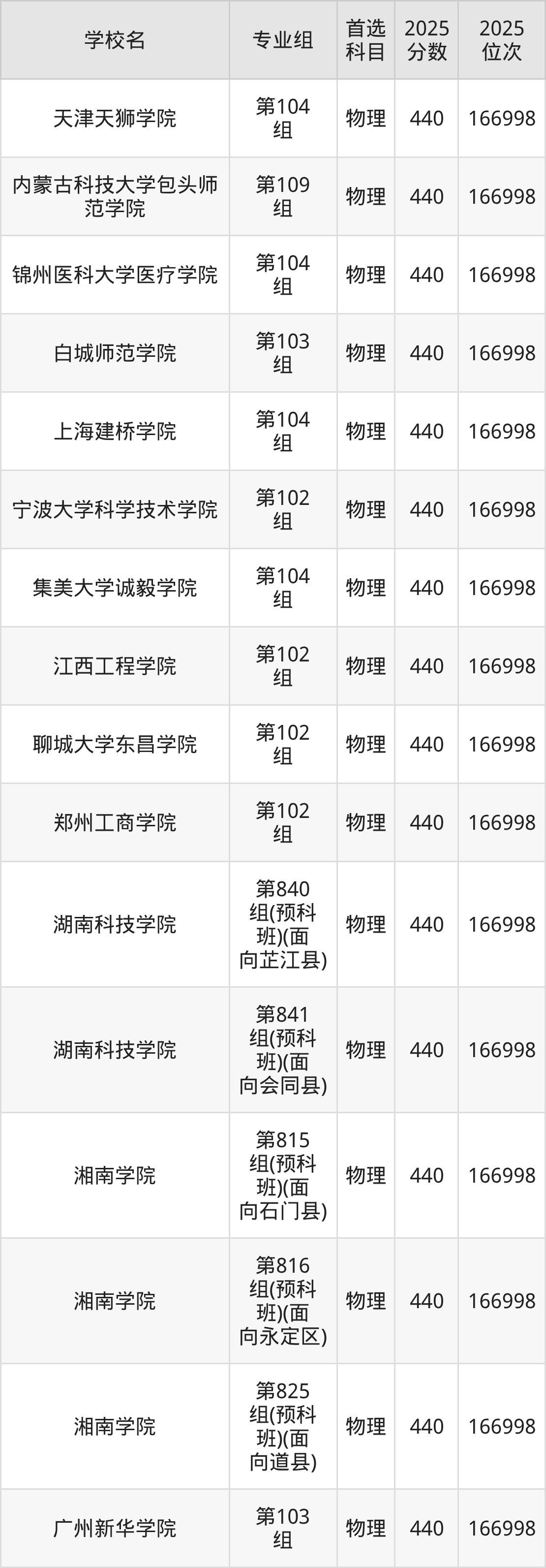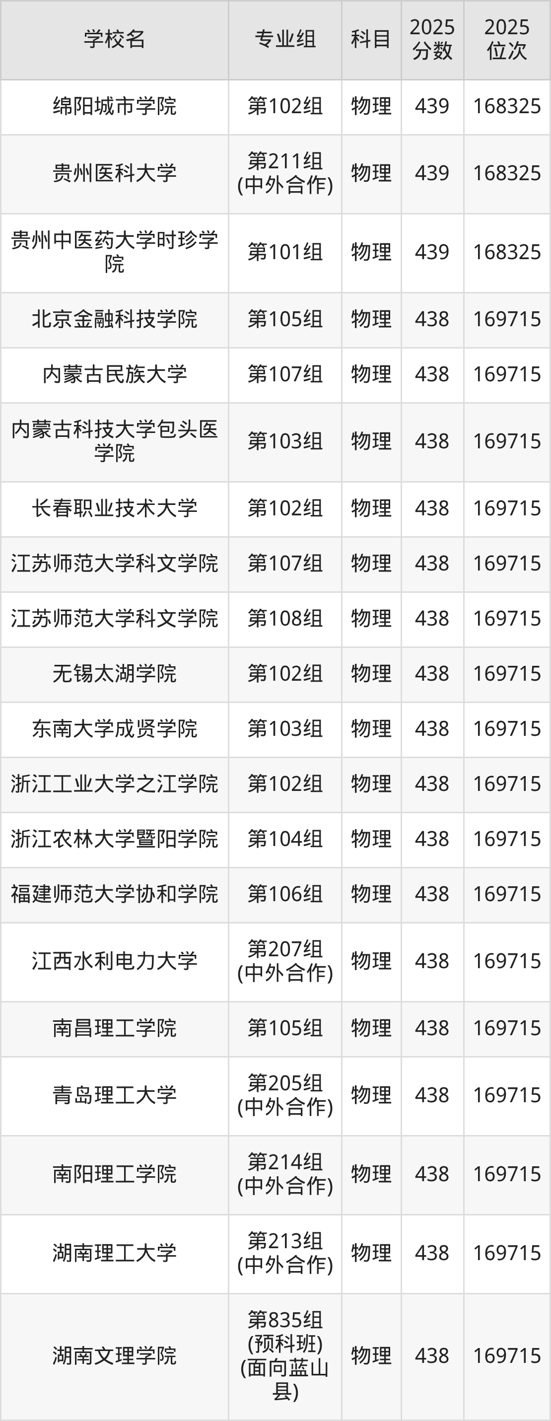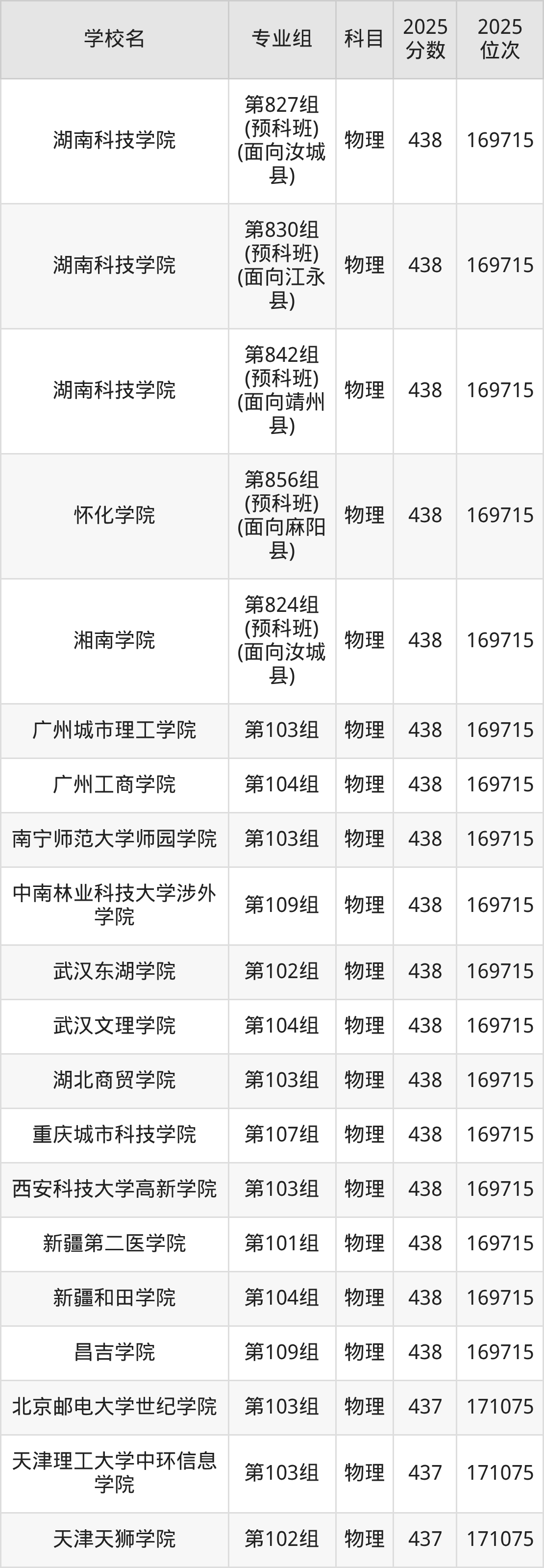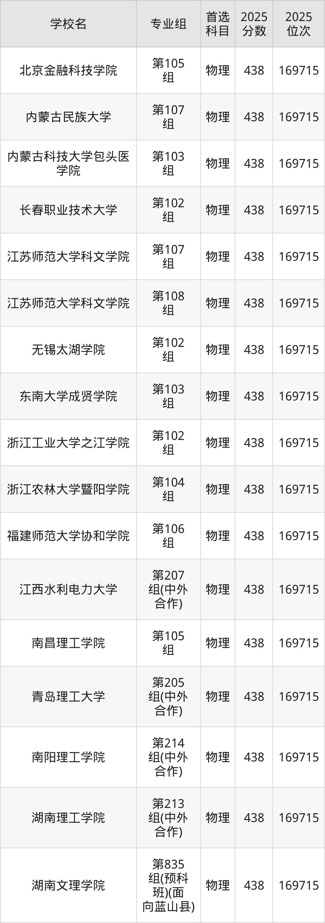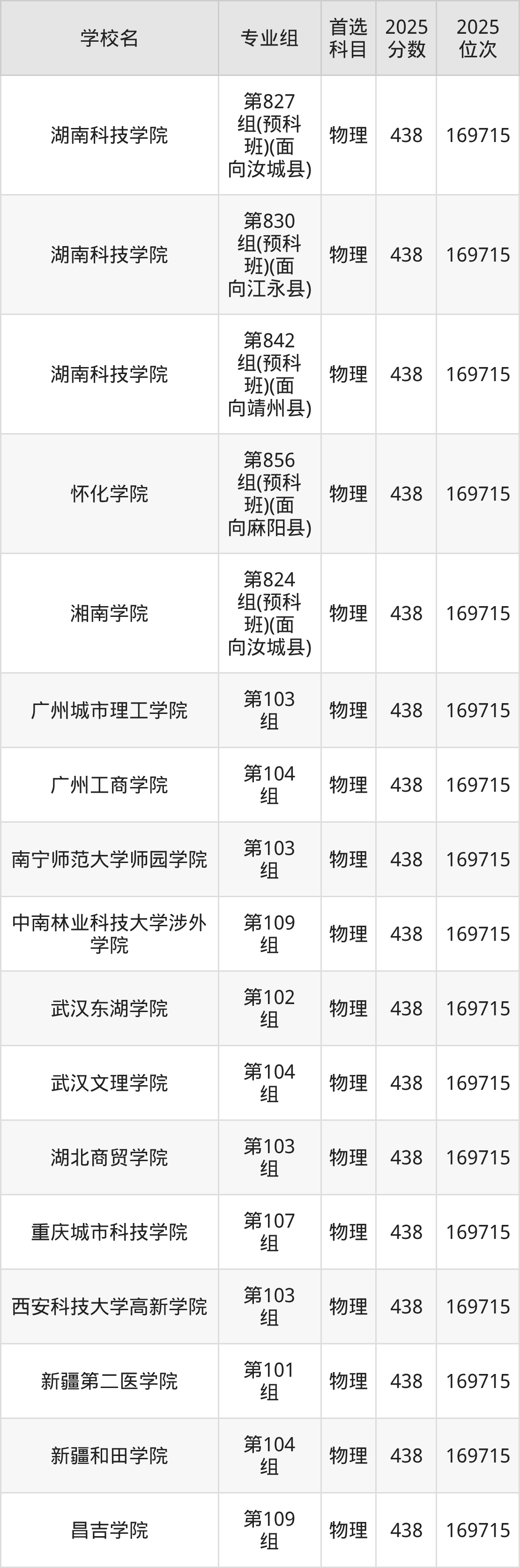 湖南物理类438分对应的位次排名是169715名,因此建议2026年位次排在这附近的考生考虑这些大学。