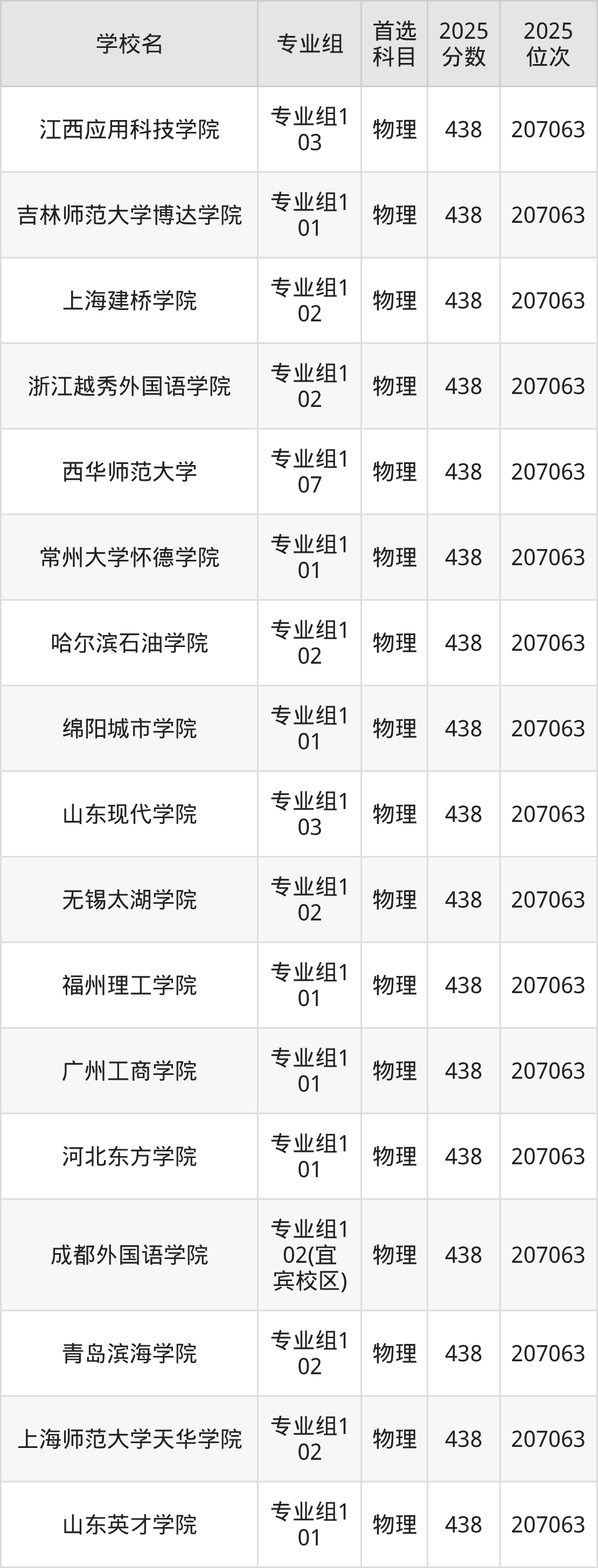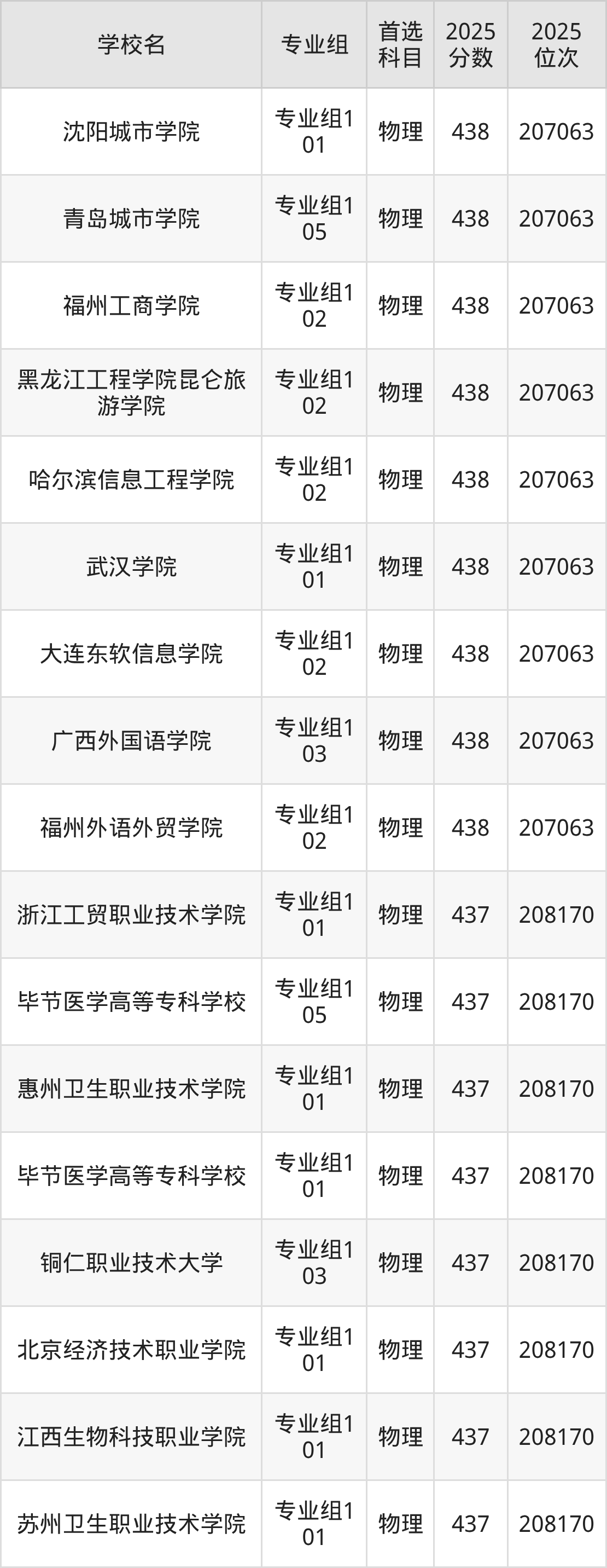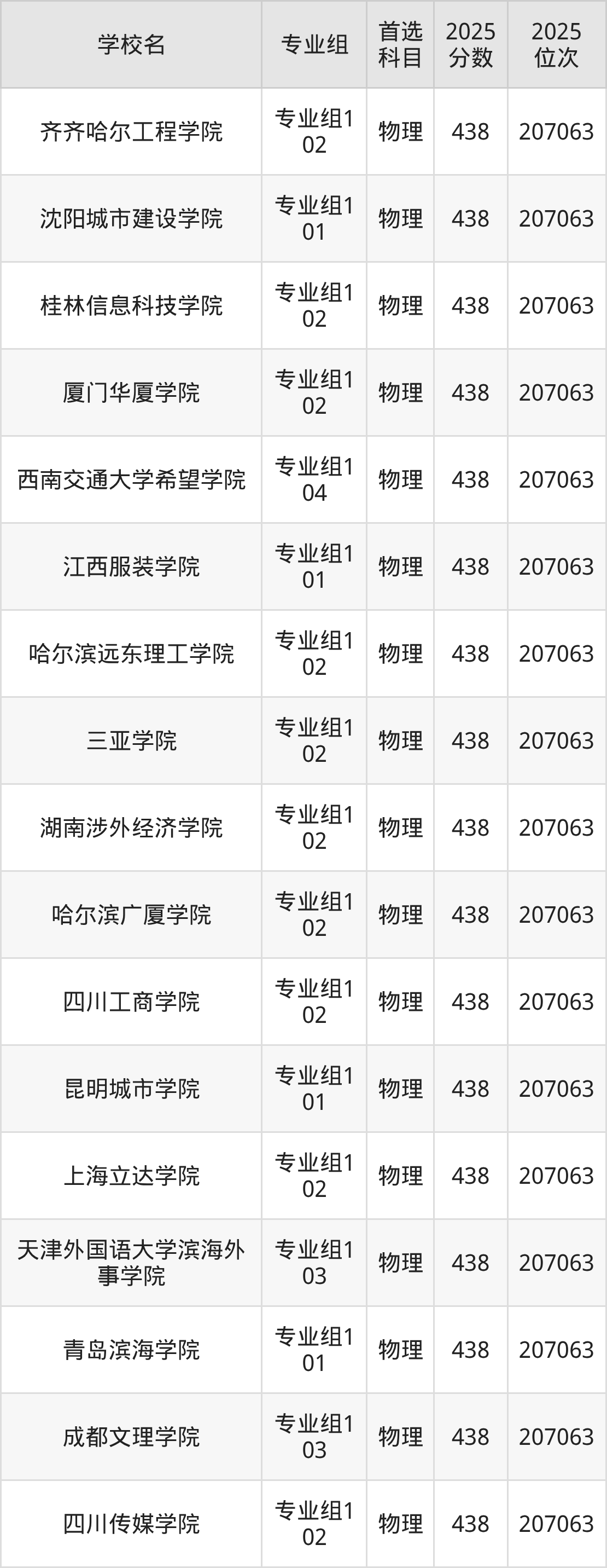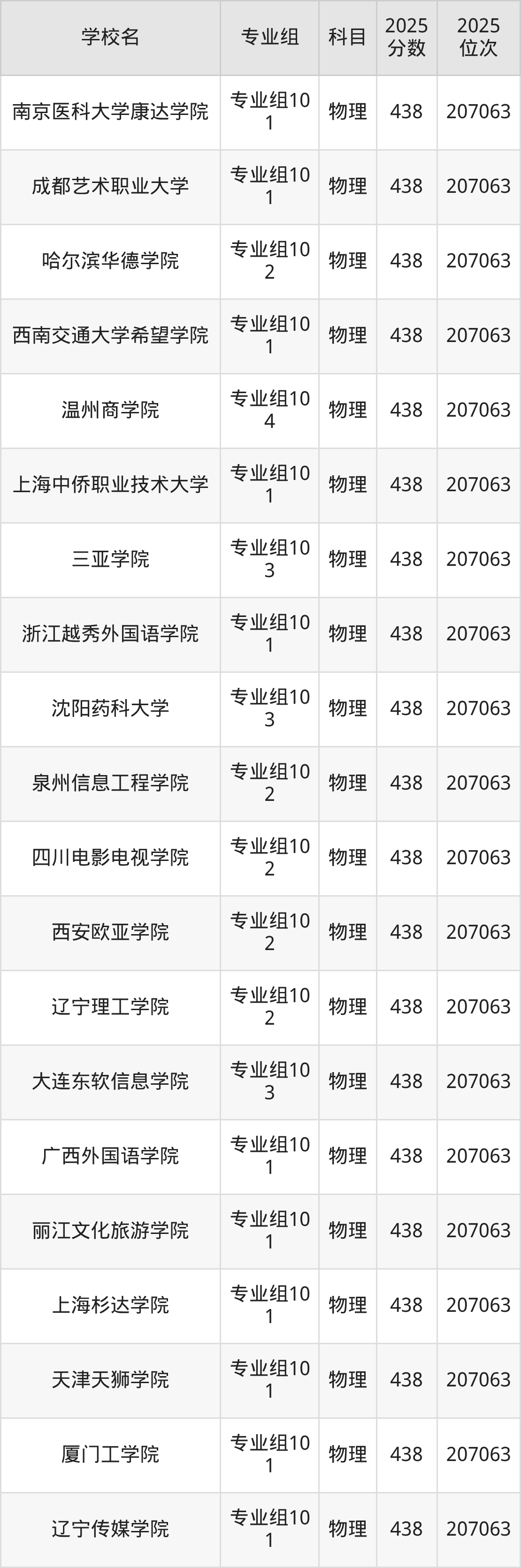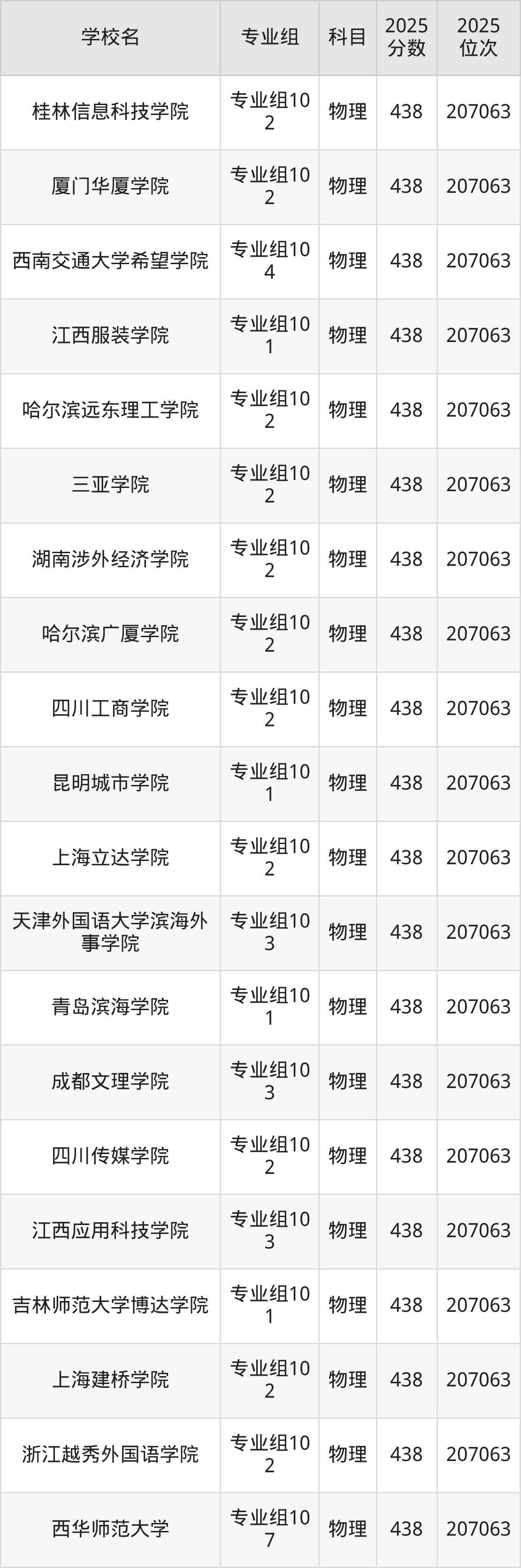 四川物理类438分对应的位次排名是207063名,因此建议2026年位次排在这附近的考生考虑这些大学。