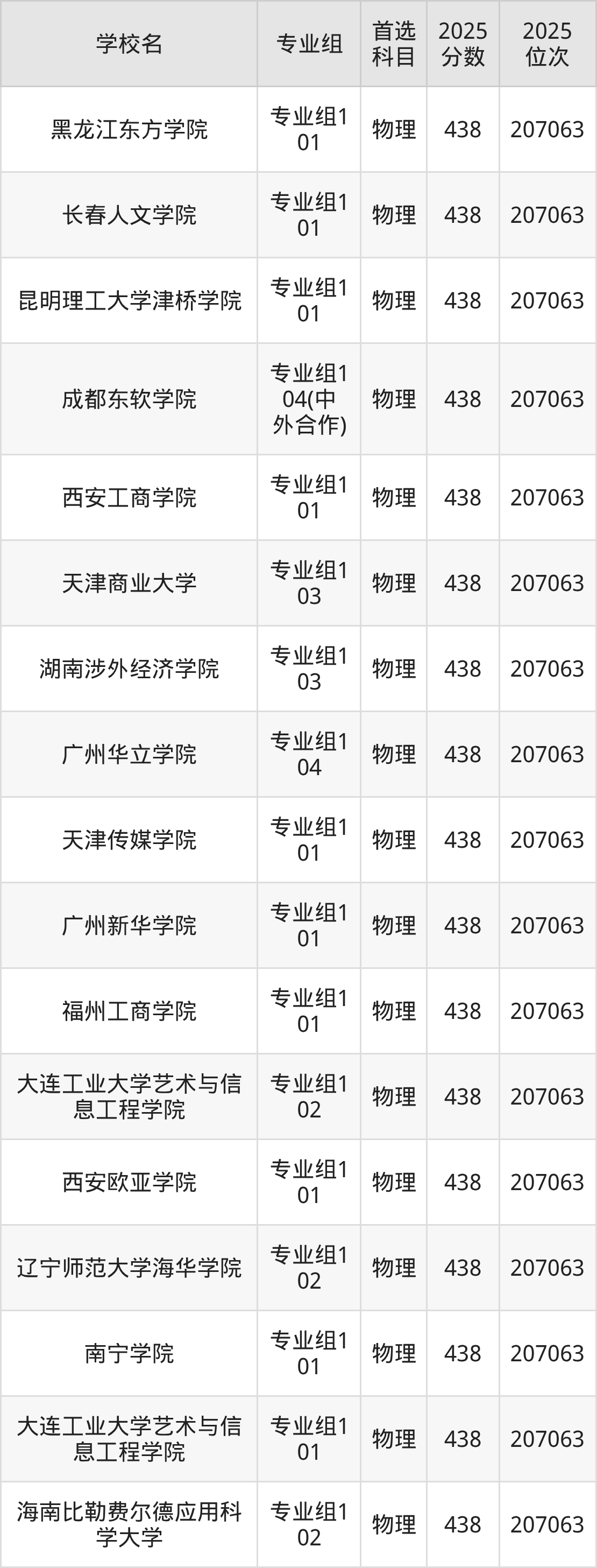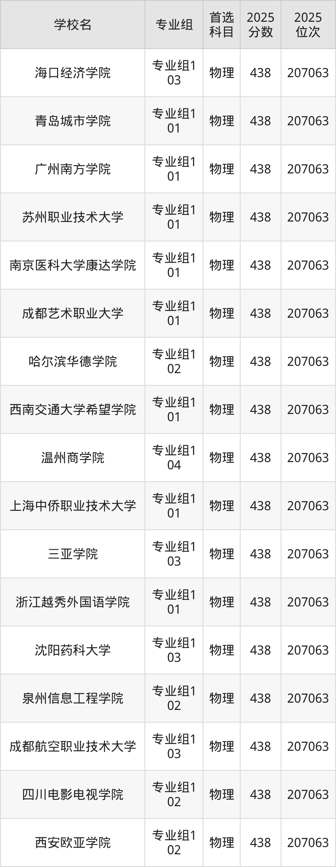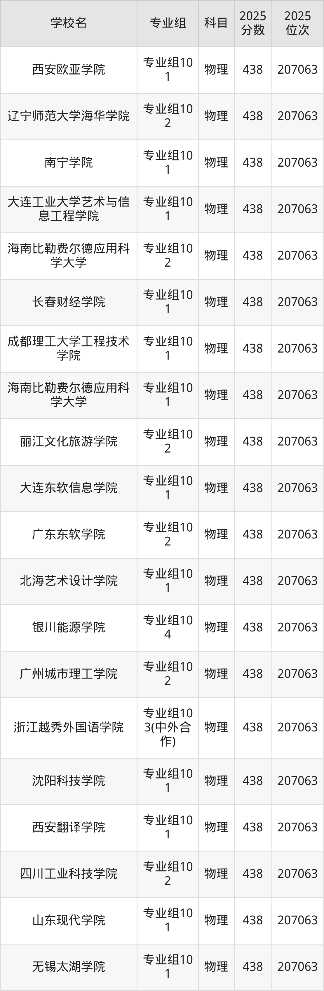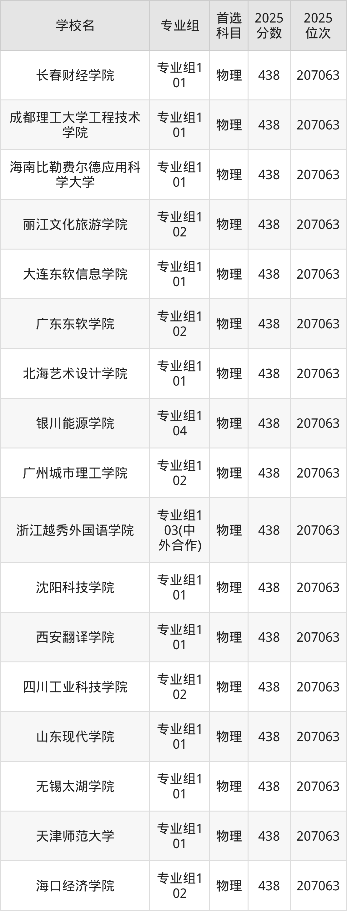 四川物理类438分对应的位次排名是207063名,因此建议2026年位次排在这附近的考生考虑这些大学。