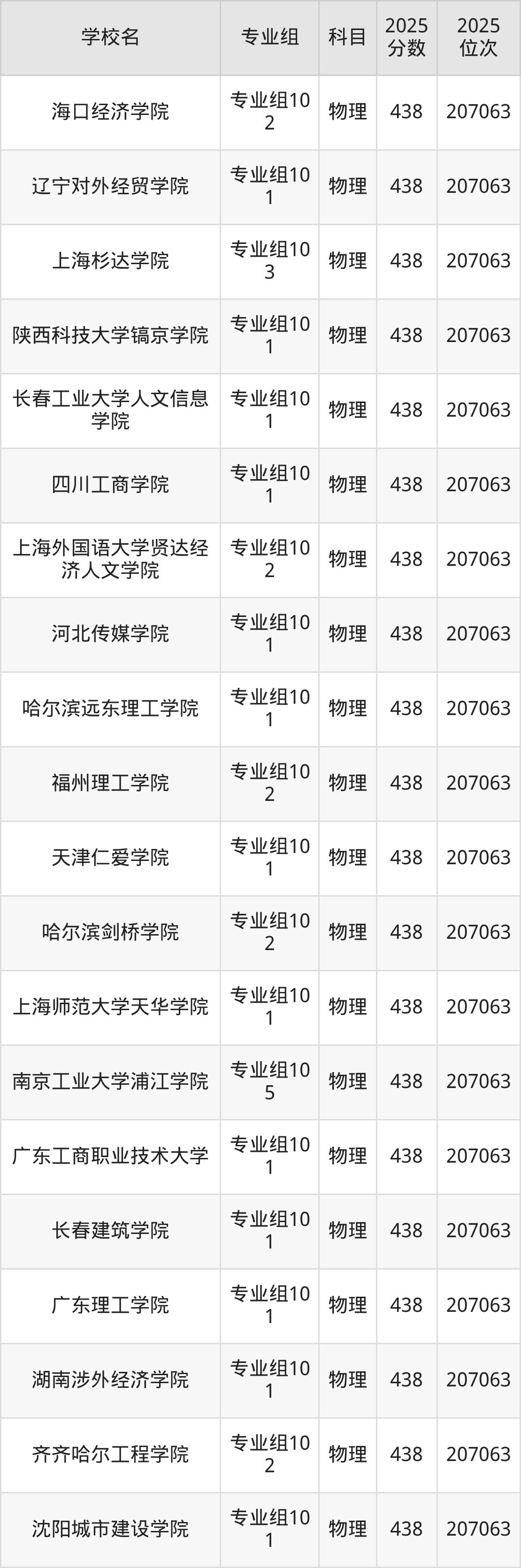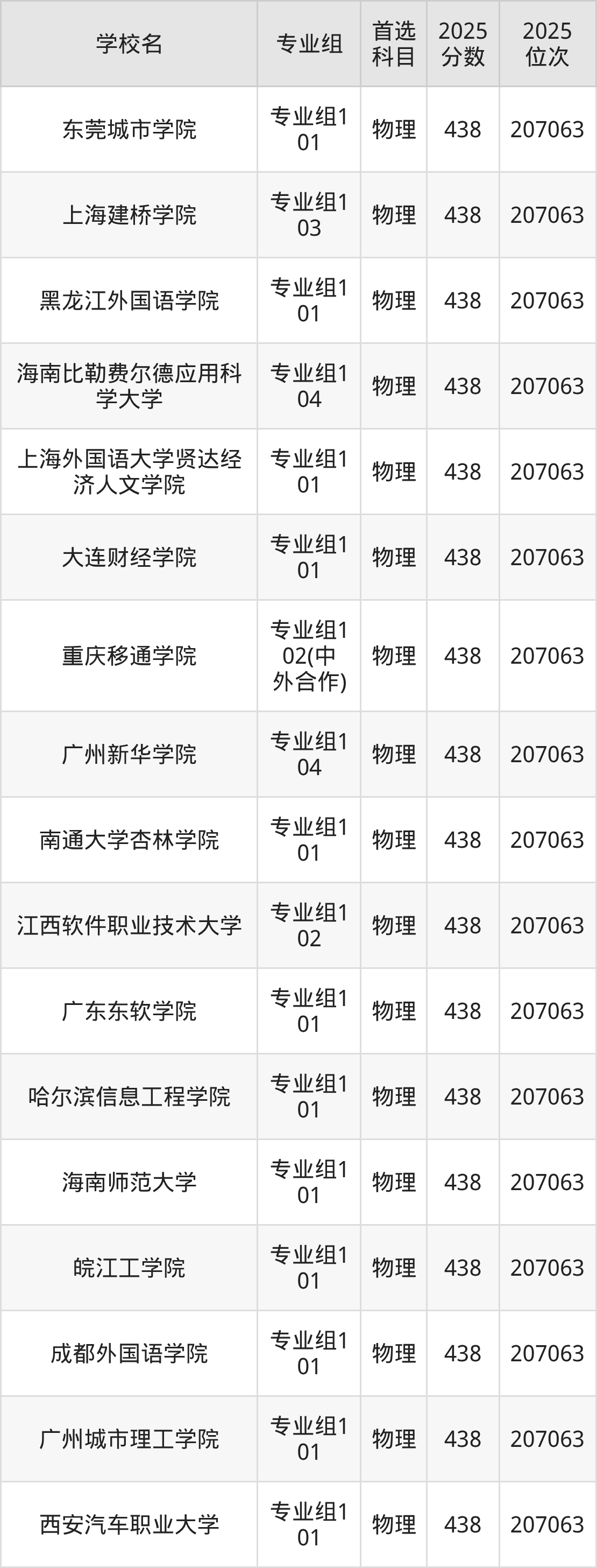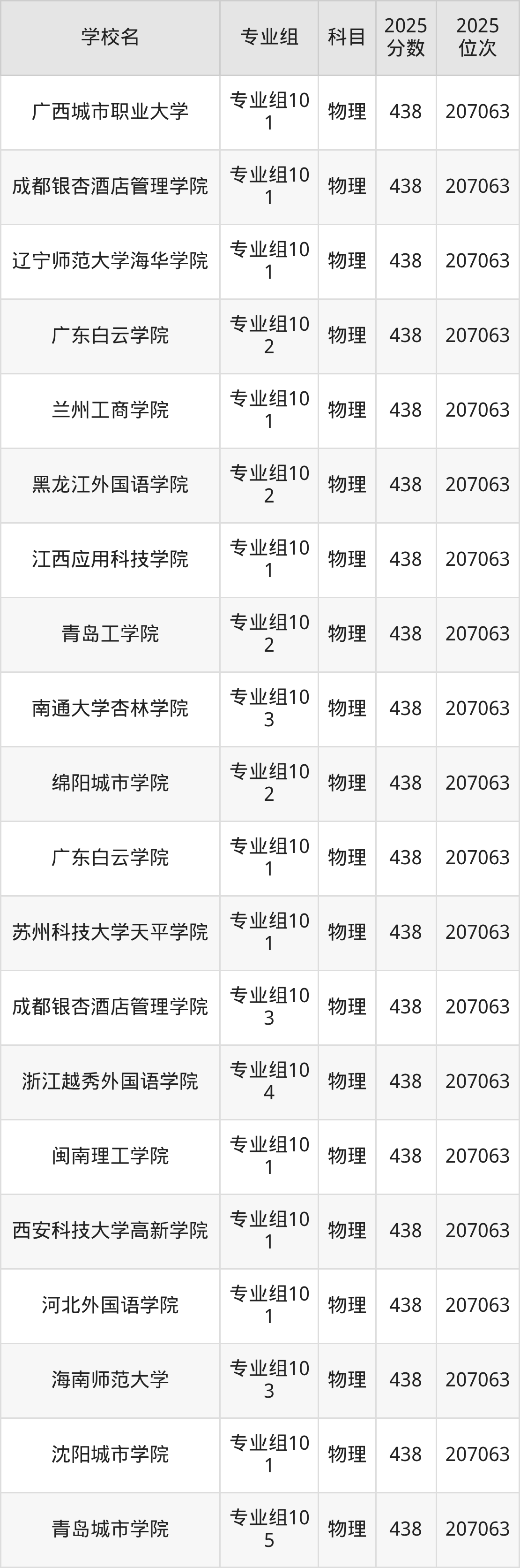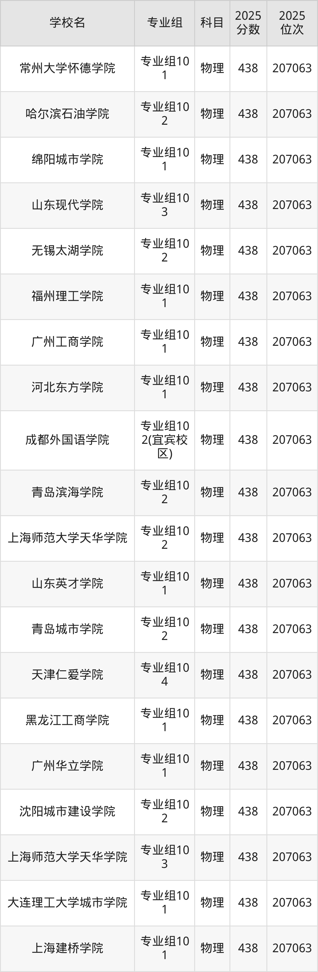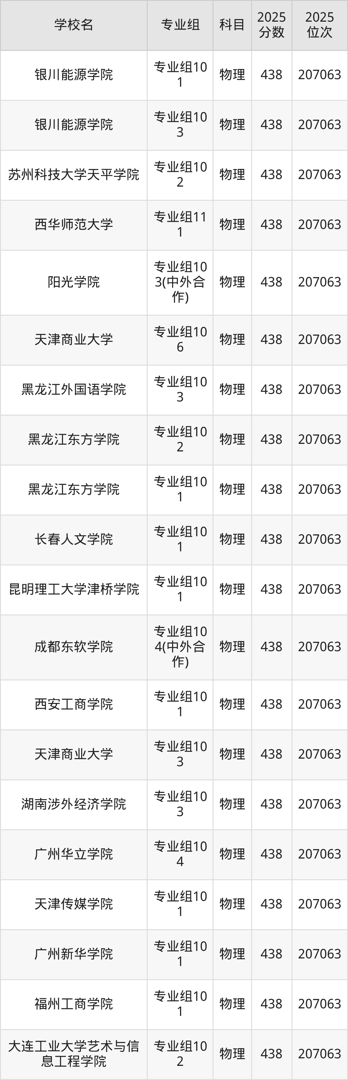 四川物理类438分对应的位次排名是207063名,因此建议2026年位次排在这附近的考生考虑这些大学。